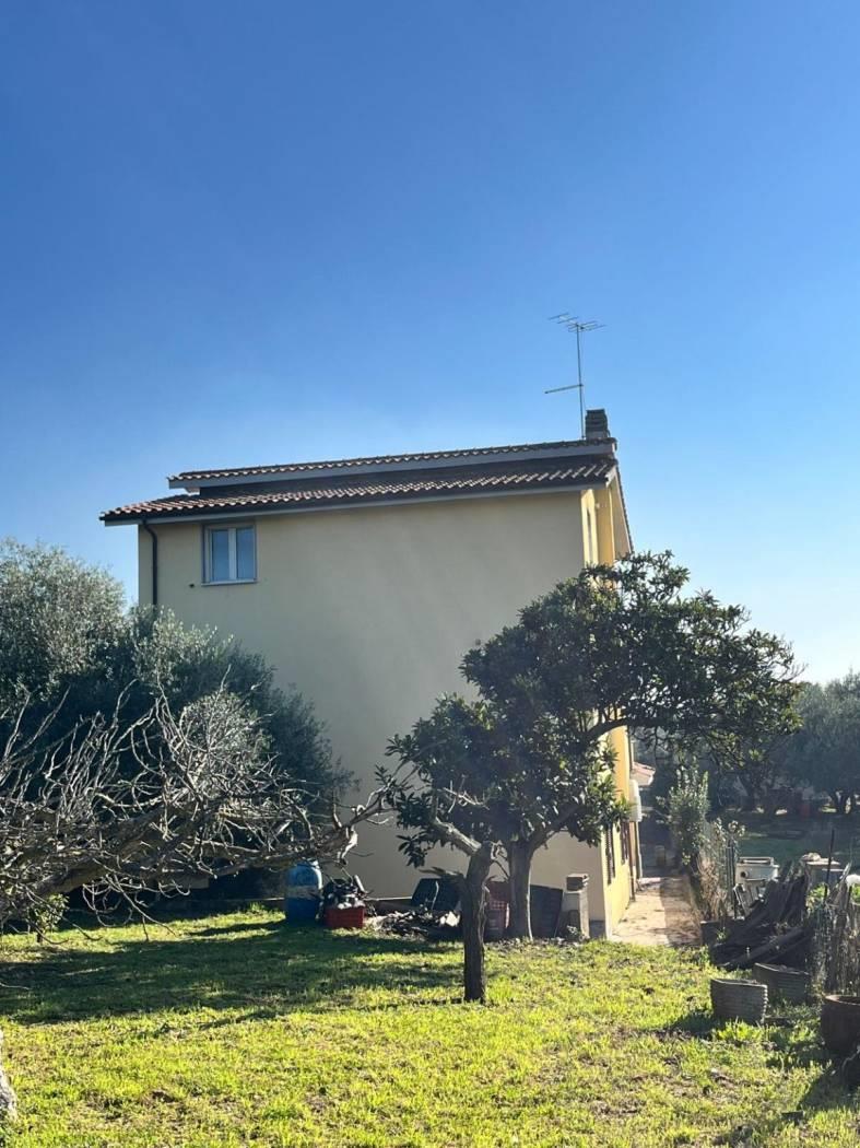 All'esterno troviamo un portico dal quale si accede al fabbricato, un box doppio ed un terreno che circonda il fabbricato di circa 1200 mq., con alberi di Ulivo e da frutta.
