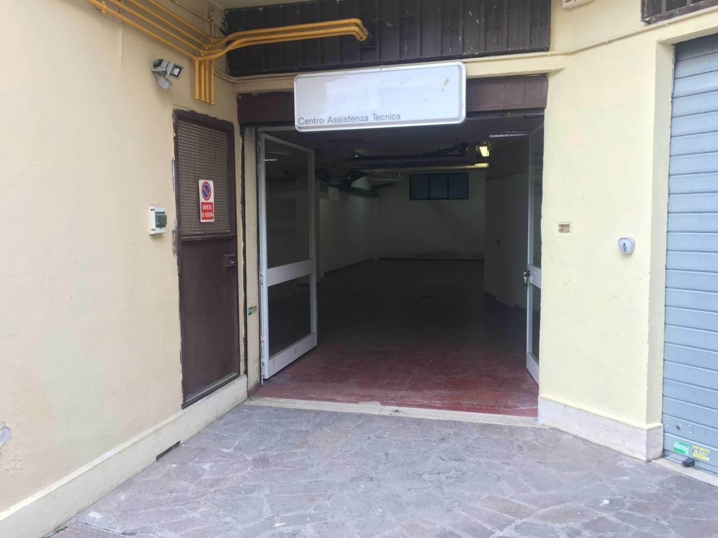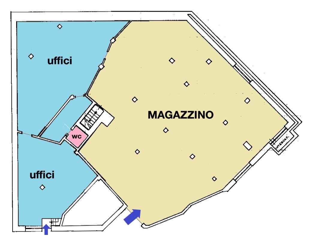 Rampa carrabile, ingresso pedonale, 4 vani ufficio, 2 bagni, locale accoglienza clienti, magazzino.
