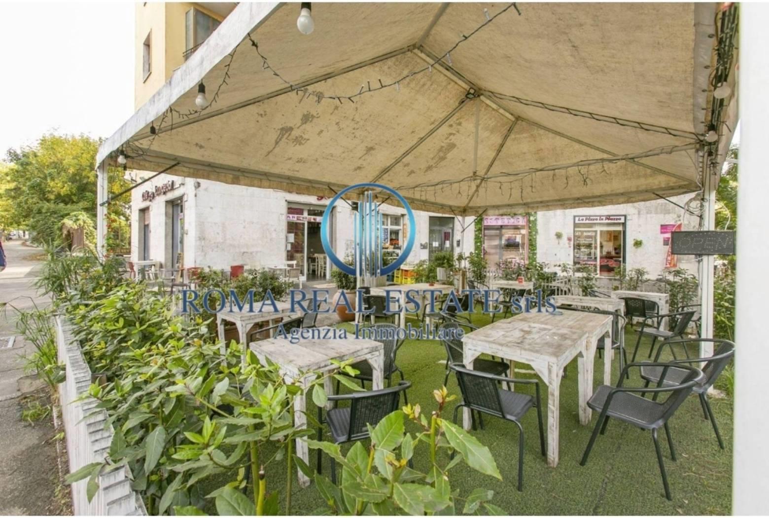 Esterno: Tre ampie vetrine con doppia esposizione e una spaziosa area esterna attrezzata, ideale per incrementare la capienza grazie ai tavolini all'aperto.