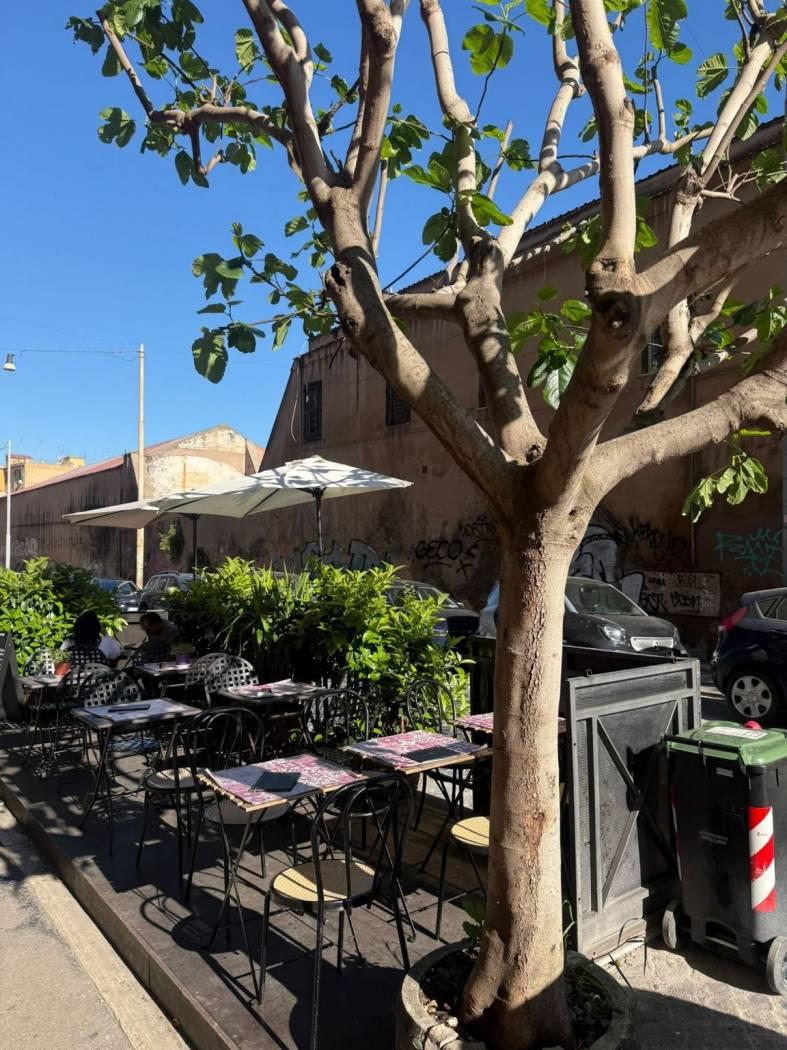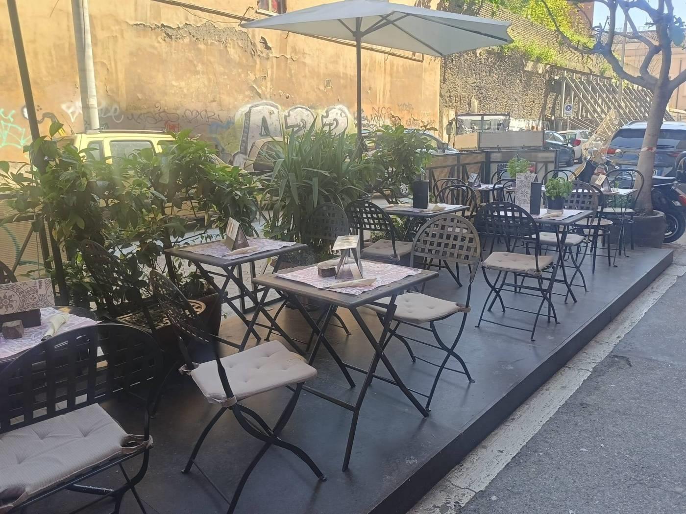 Le due ampie vetrine su strada che permettono un'apertura totale creano un unico spazio dentro fuori molto apprezzato dalla clientela.
