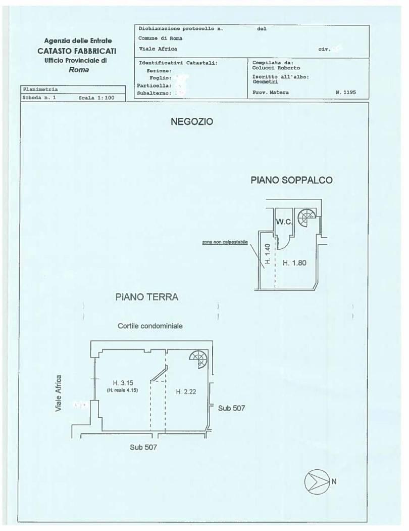 Eur centro e precisamente in Viale Africa, angolo Via delle Montagne Rocciose, fronte scuola "Arangio Ruiz" ed adiacente al Laghetto dell'EUR affittasi locale commerciale (C/1) in su due livelli.