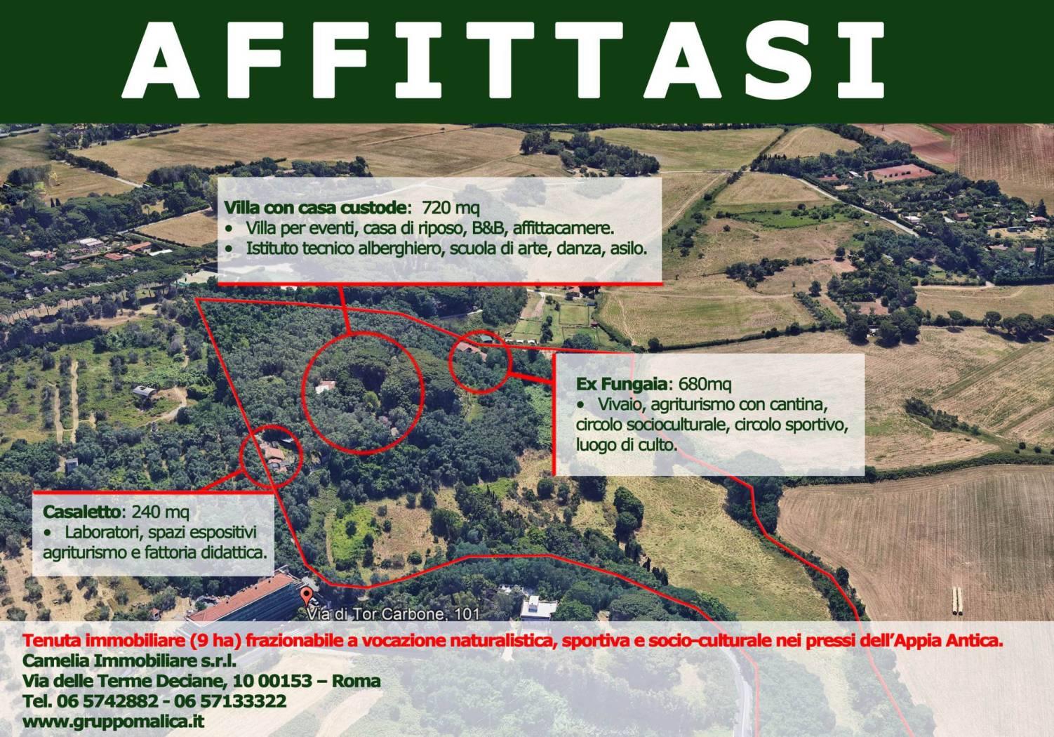 Società proprietaria propone in locazione all’interno del Parco dell’Appia Antica e precisamente in via di Tor Carbone 101, da ristrutturare, una ex fungaia di mq 700, oltre 670 mq di cantina. La struttura è inserita in un parco meraviglioso e per le sue caratteristiche si presta per attività ricettive come agriturismo con cantina, vivaio, circolo sportivo, circolo socioculturale e luogo di culto. Prezzo su richiesta. Ristrutturazione di base (edile, strutturale, impianti) a carico della proprietà su progetto condiviso con il conduttore. È richiesto un deposito cauzionale pari a tre mensilità di canone. A garanzia della solvibilità del conduttore è richiesta una fideiussione bancaria di importo pari a 12 mensilità di canone oltre IVA.