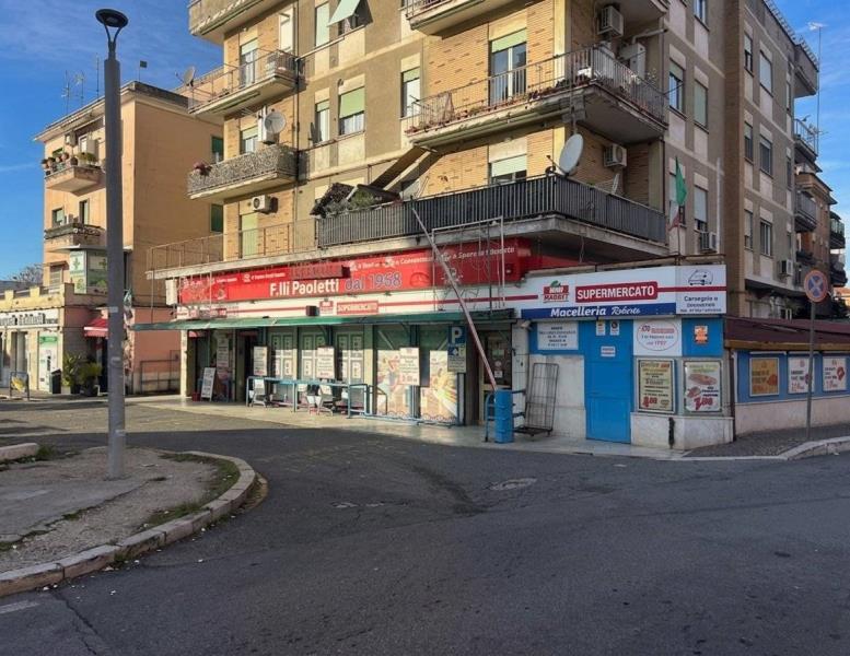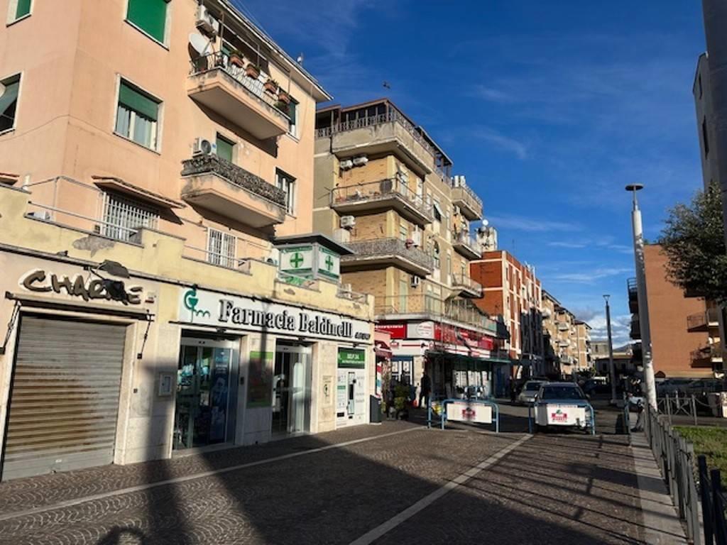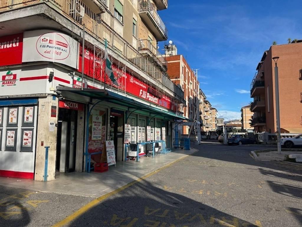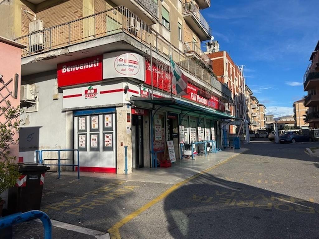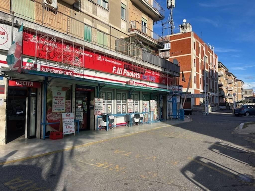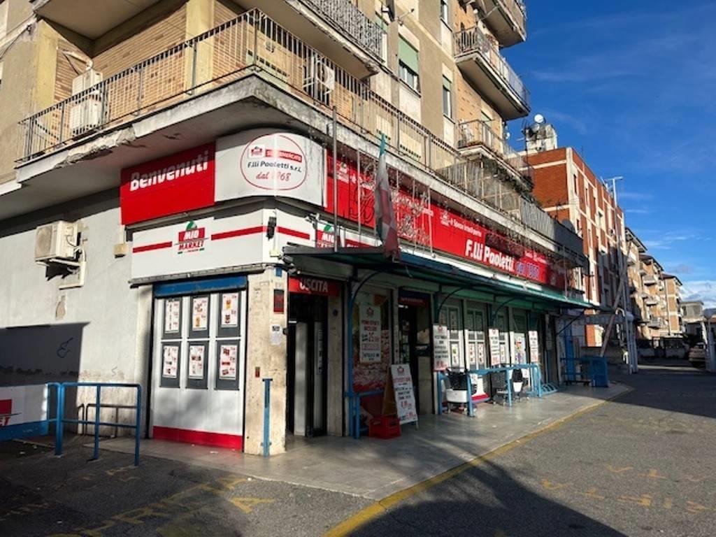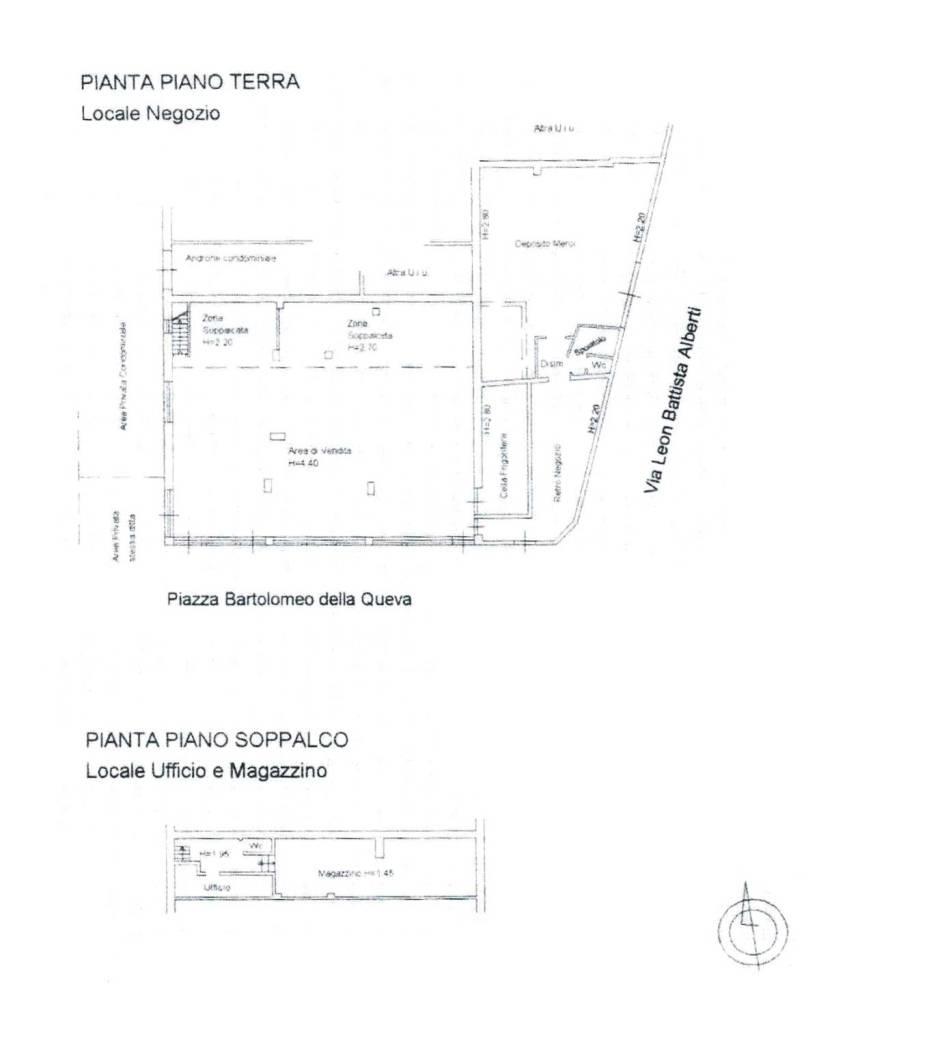 Piazza della Queva, locale commerciale con bagno, soppalco, spogliatoi, magazzino, vialetto e piazzale esterno adibito a parcheggio, per un totale di 267 mq commerciali.
