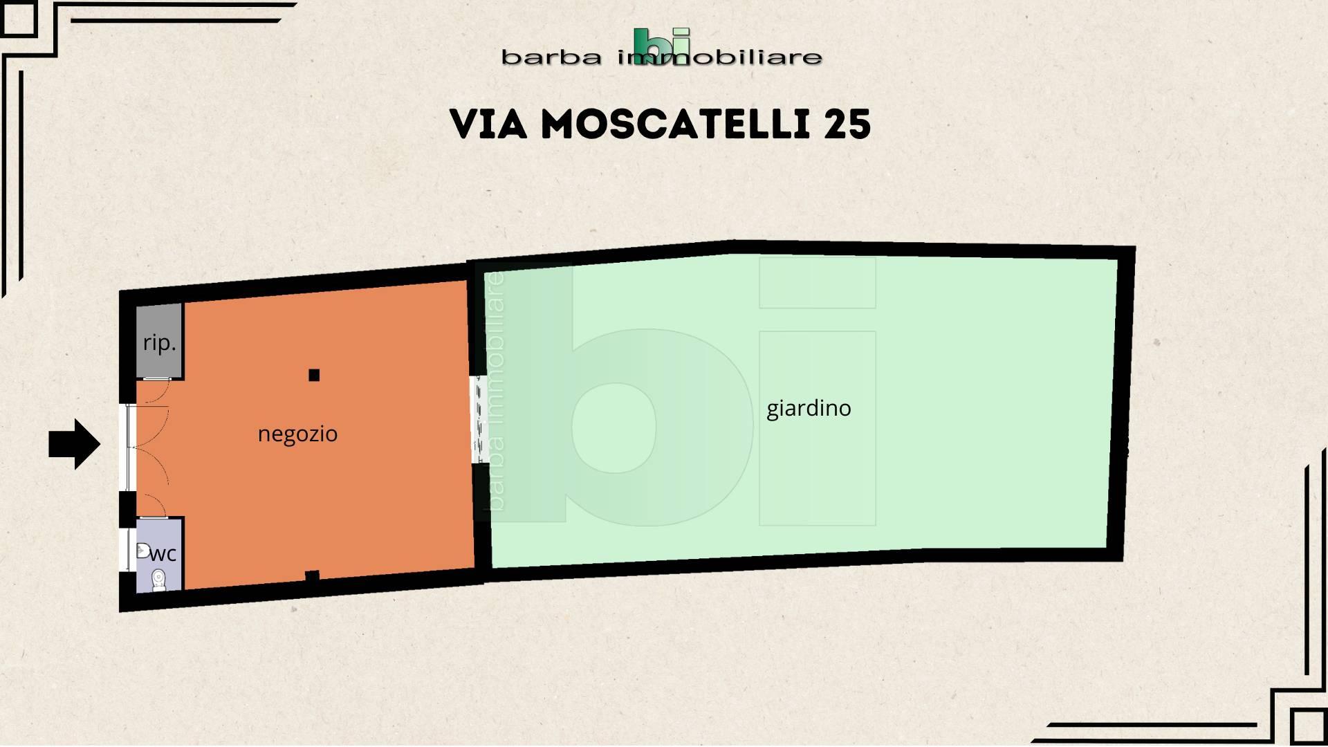 VIA A. MOSCATELLI 25 – Ampio e luminoso locale commerciale di circa 75 mq coperti con soffitti alti ed ampio giardino privato, completamente indipendente con possibilità di installazione della canna fumaria, nel pieno centro cittadino. Il locale è completamente da ristrutturare, dotato di servizio finestrato, piccolo ripostiglio e locale principale carrabile con ingresso di larghezza superiore a 2,5 m circa. L’immobile è completamente autonomo e dotato di agibilità. Gli alti soffitti e l’autonomia del fabbricato ne consentono svariati usi anche, volendo, quello di trasformazione in civile abitazione previo parere di un tecnico abilitato, con il cambio di destinazione d’uso.