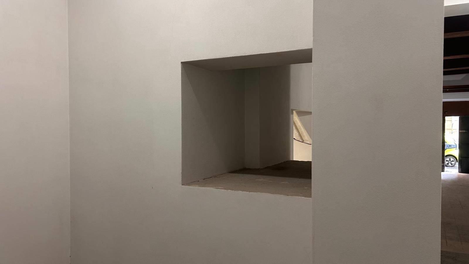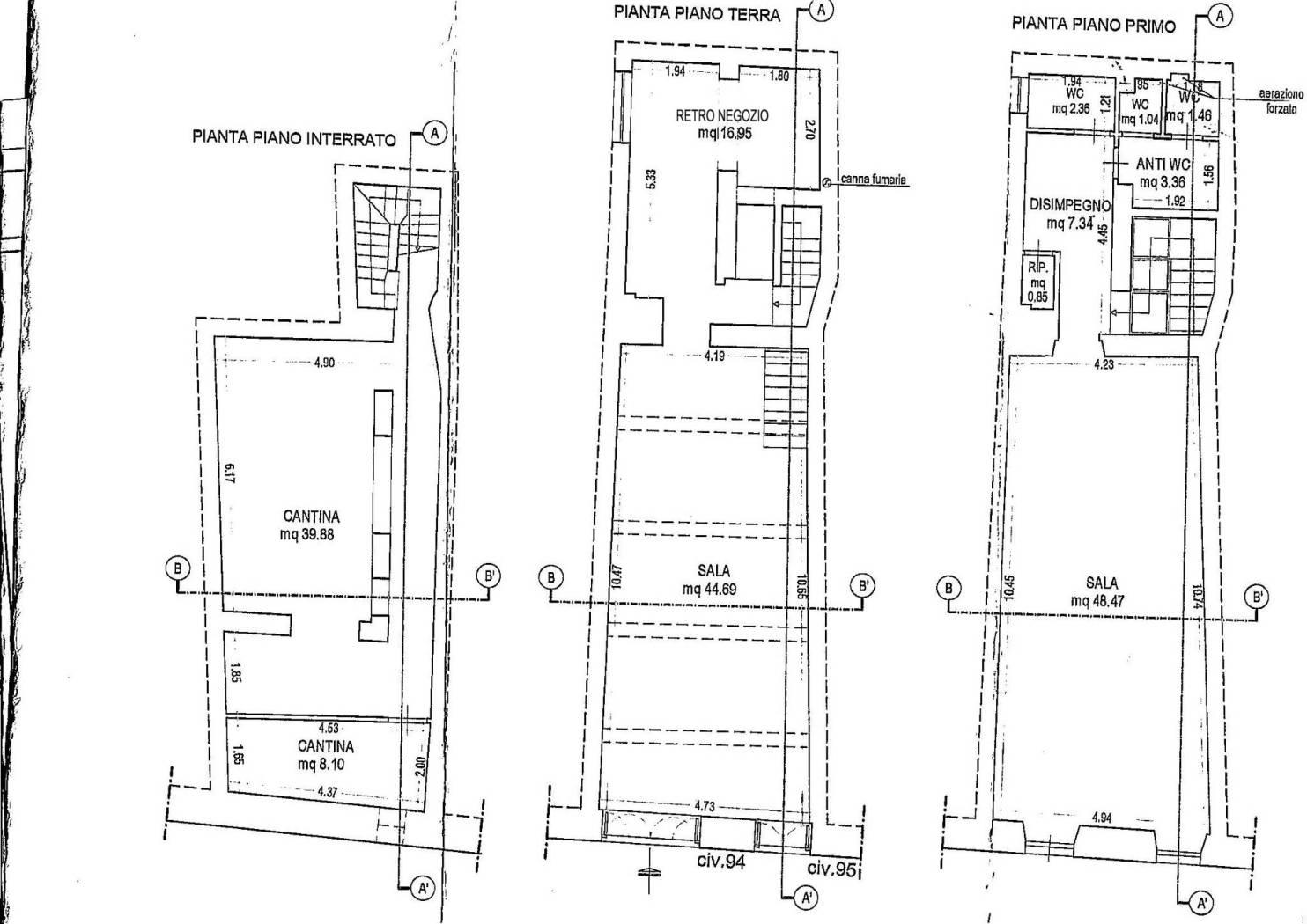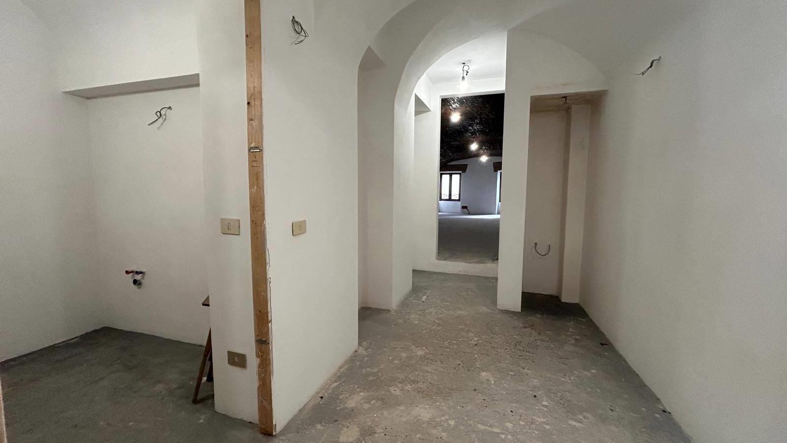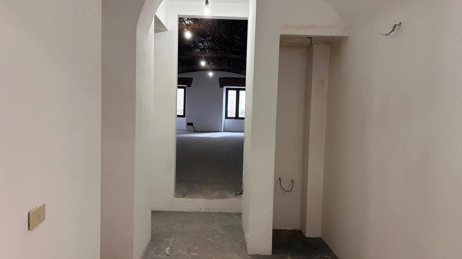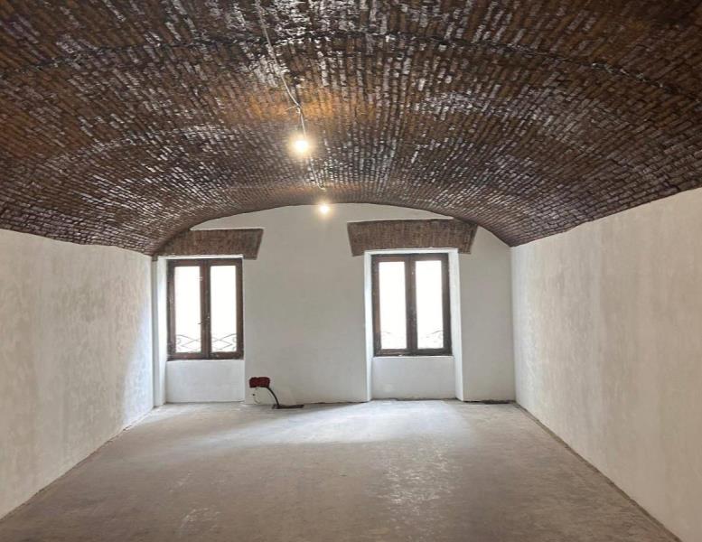 AL PRIMO PIANO: Salone di mq 48 con soffitto a volta, due finestre con vista sulla piazza e superficie retrostante di mq 17 dove si trovano tre bagni da rifinire.