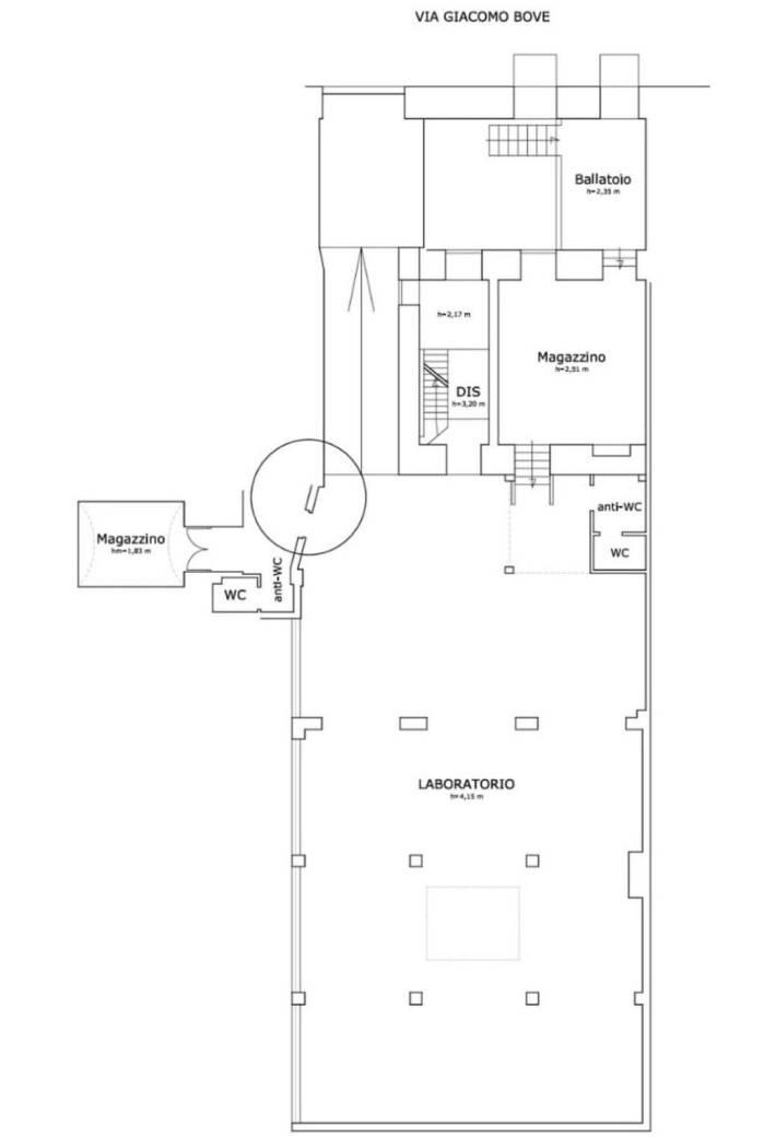 L’immobile si sviluppa su una superficie di circa 300 m² al piano terra, con un livello sottostante di 100 m² e una terrazza di copertura di circa 270 m². Dispone di due ingressi, uno carrabile e uno pedonale, e di una distribuzione interna composta da sei locali oltre a due servizi igienici. Attualmente da ristrutturare, ha ospitato in passato una tipografia ed è situato in un edificio storico risalente al 1900.