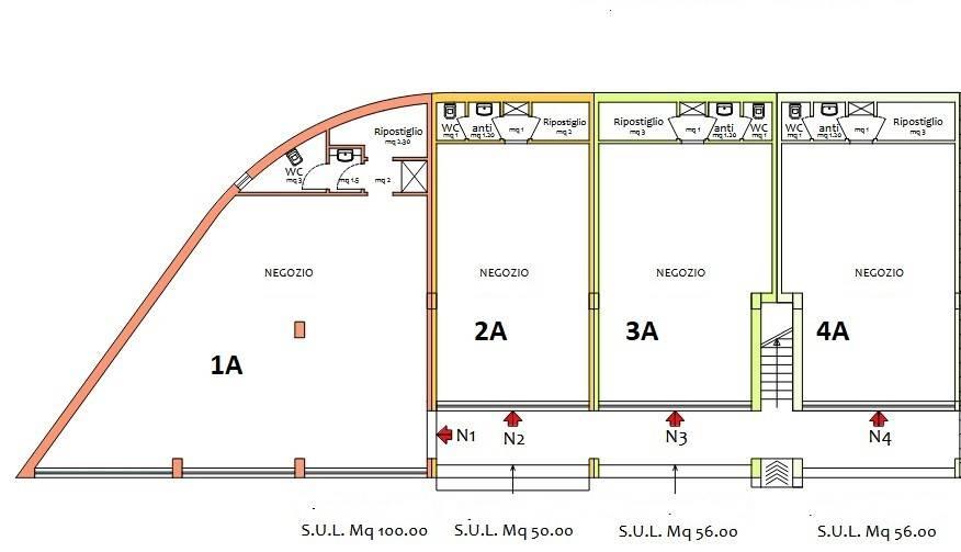 Tipologia 1A 100 mq angolare con tre vetrine, composto: