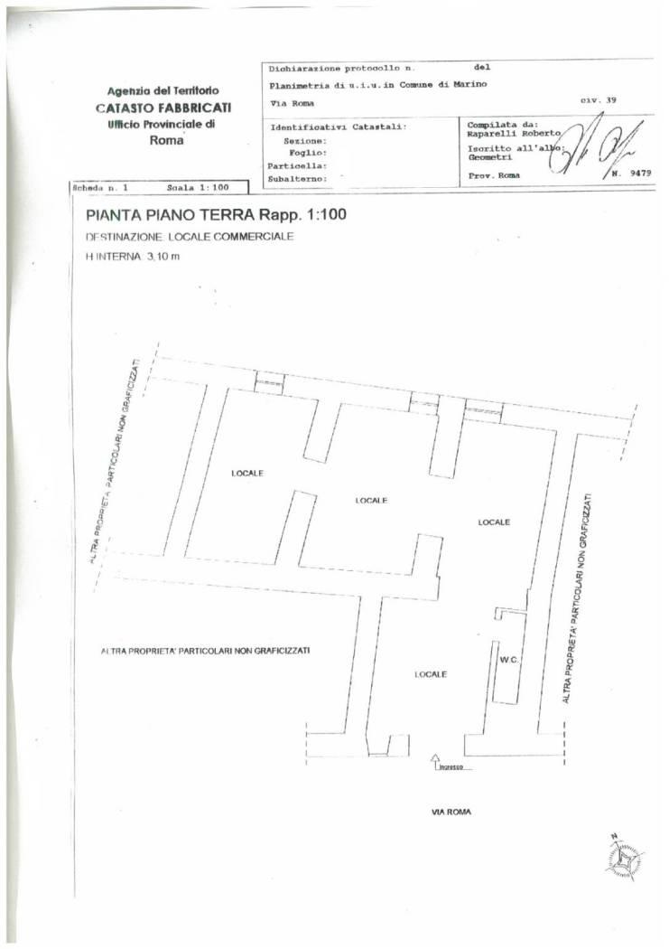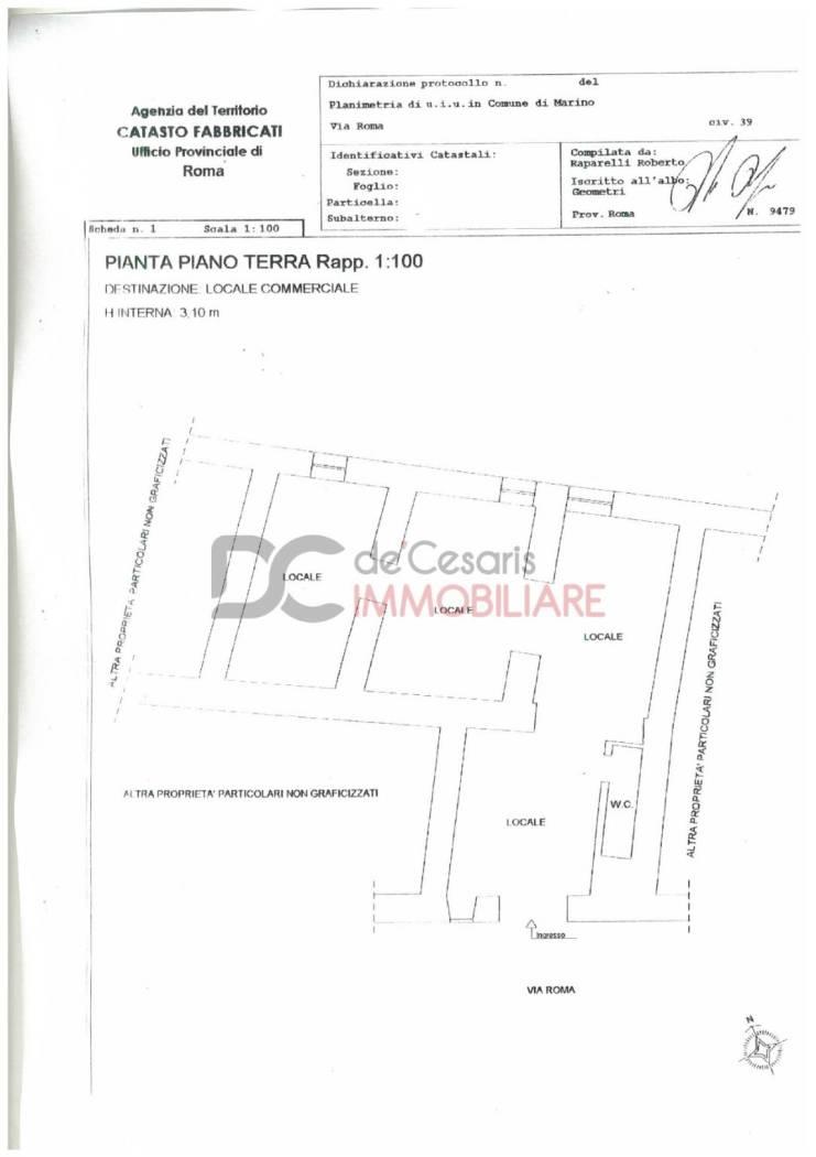Marino - Via Roma zona centrale a pochi metri da tutti i principali servizi quali alimentari, ufficio postale, bar, Comune, trattiamo in vendita locale commerciale di 70 mq H. interna 3.10 al piano terra con vetrine, internamente composto di tre locali oltre servizio. Buono stato generale. Il locale si trova su una strada di transito sia pedonale che carrabile, ideale per varie attività.
