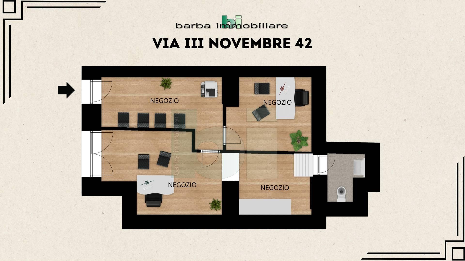 VIA III NOVEMBRE 42 - Locale commerciale (C/1) con doppia vetrina su strada pubblica di intenso passaggio, di fronte agli uffici del Comune di Mentana, di una superficie netta calpestabile di circa 48 mq, soffitti alti e senza spese condominiali. Riscaldamento/raffrescamento con inverter, pavimento laminato, controsoffitto con luci a pannello integrate, divisioni interne in cartongesso che creano 3 ambienti indipendenti tra loro da utilizzare come sala d'aspetto, due stanze ed un ripostiglio antistante i servizi. Infissi in alluminio doppio vetro e saracinesche in alluminio.