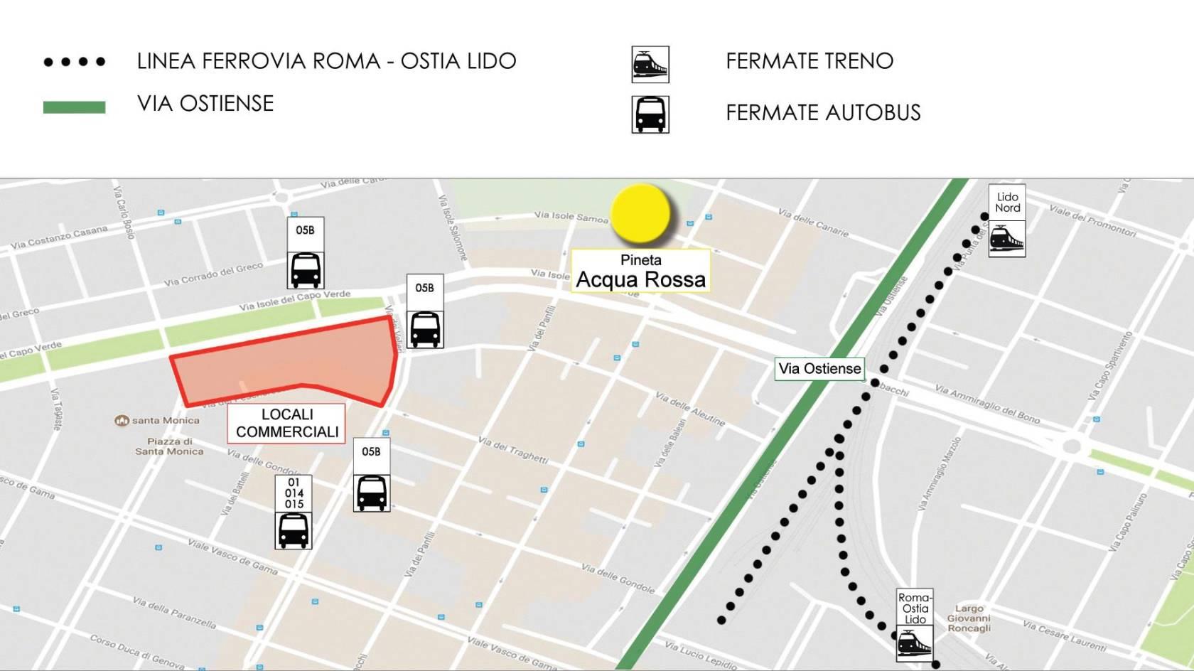 Proponiamo in locazione locale commerciale di 113 mq, in palazzina di nuova costruzione ubicata in posizione centrale e facilmente raggiungibile in automobile dalla Via Ostiense in direzione Lungomare Paolo Toscanelli. Si trova inoltre a pochi minuti dalla stazione capolinea del treno "Roma - Ostia Lido" e dalla precedente stazione "Lido Nord", nonché ben collegato alle fermate dei mezzi di trasporto pubblico. L'immobile si trova nelle immediate vicinanze di uno dei maggiori parchi verdi di Ostia, la Pineta Acqua Rossa. Il locale è adatto a qualsiasi tipo di attività commerciale e fruisce di un’ampia disponibilità di parcheggio libero ed alta densità demografica.