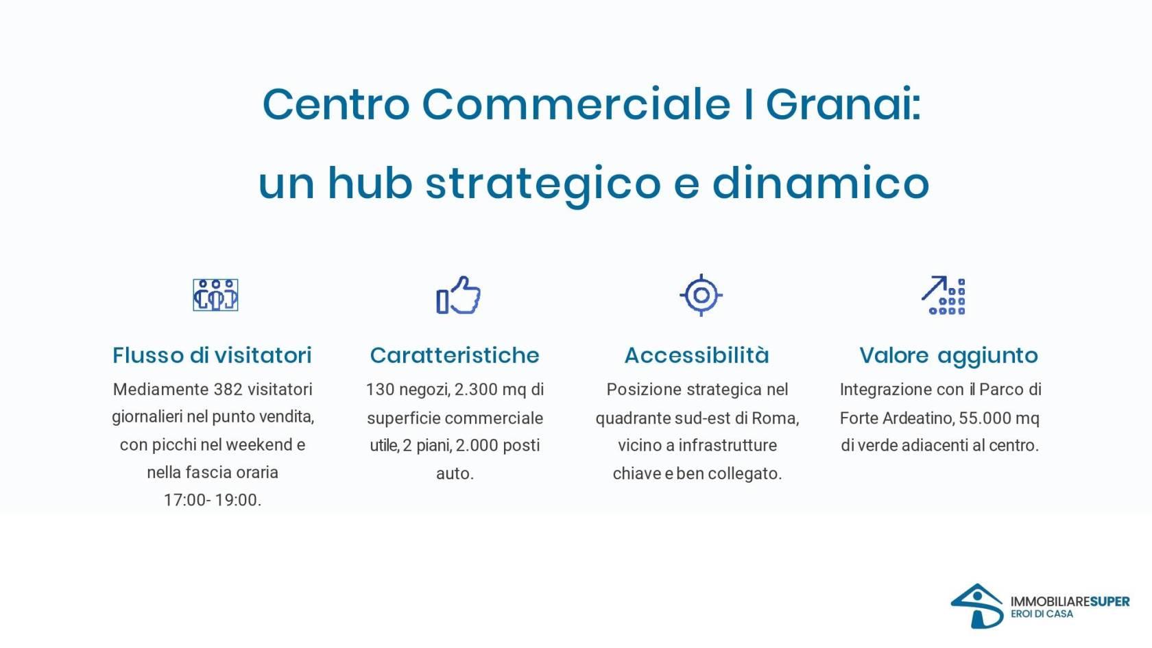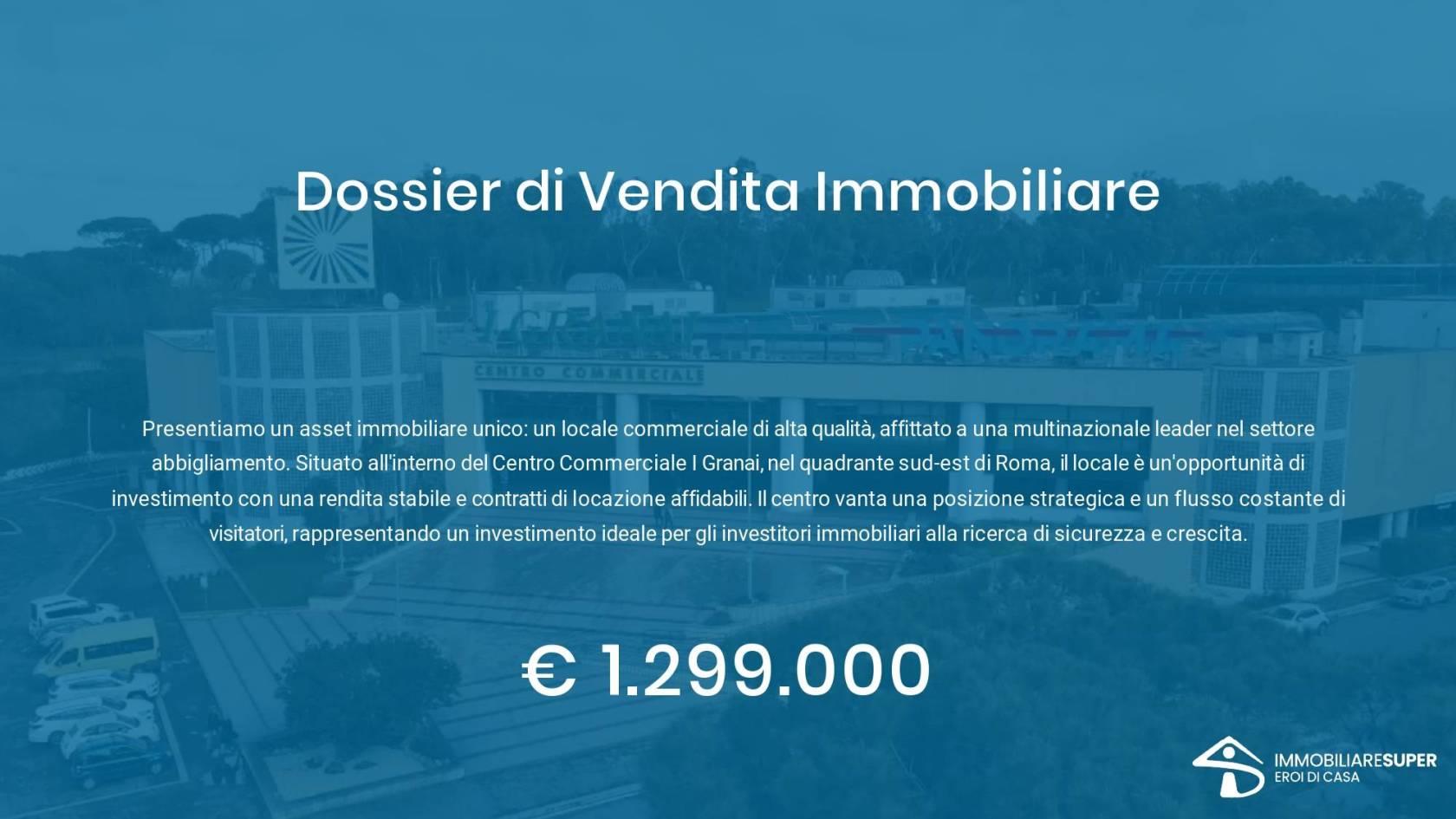 Situato all’interno del Centro Commerciale I Granai, nel quadrante sud-est di Roma, il locale è un’opportunità di acquisto con una rendita stabile e contratti di locazione affidabili.