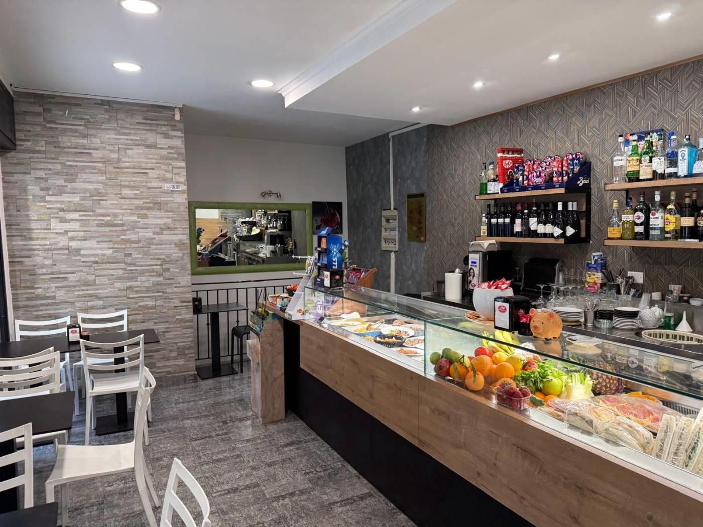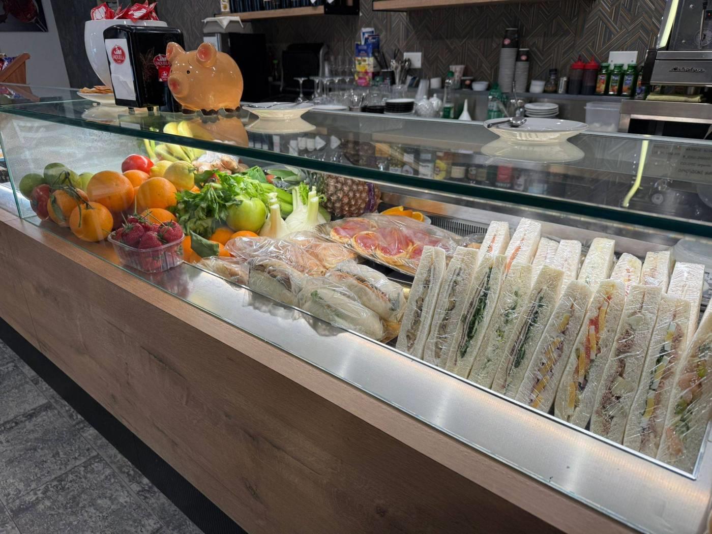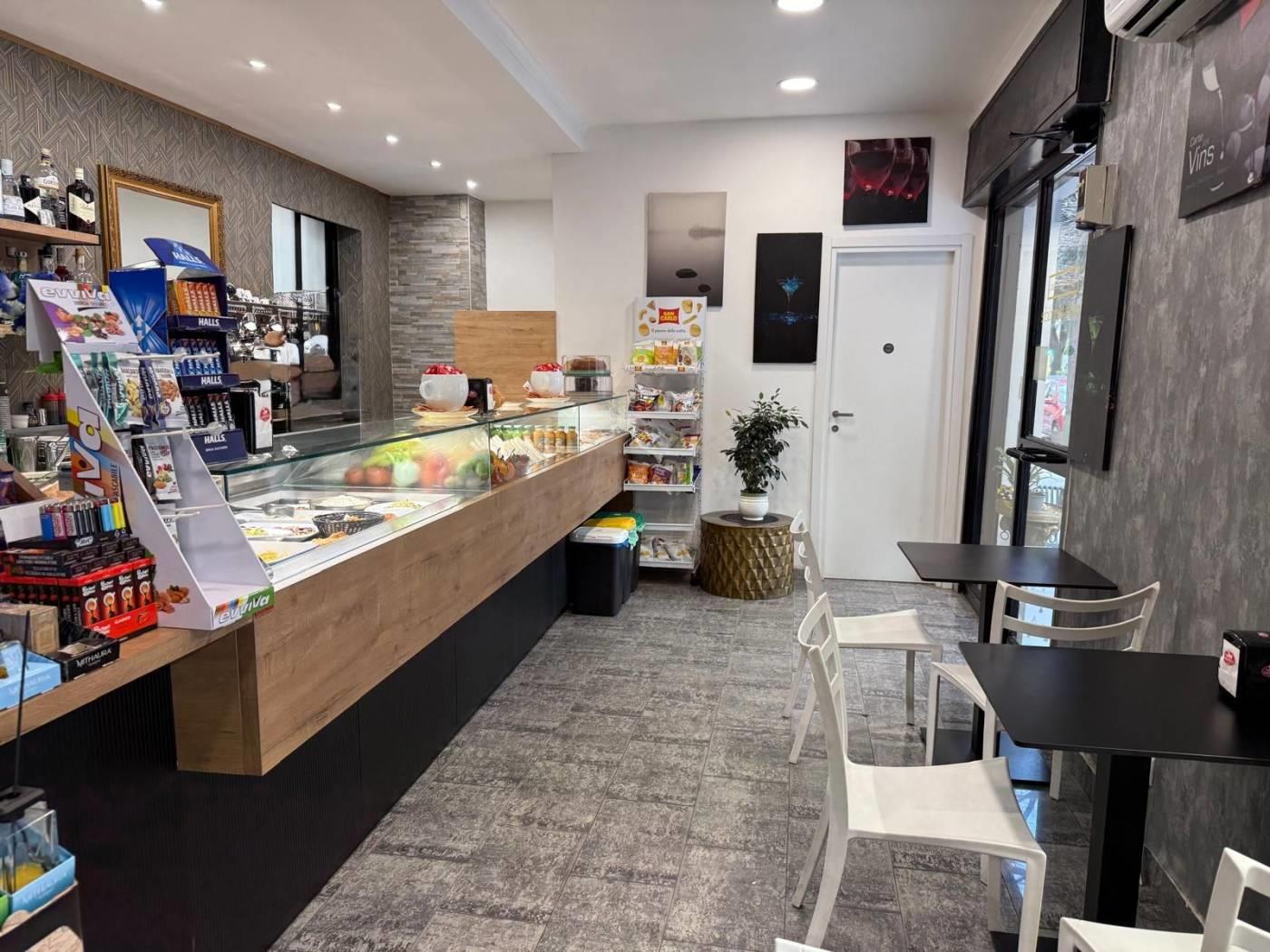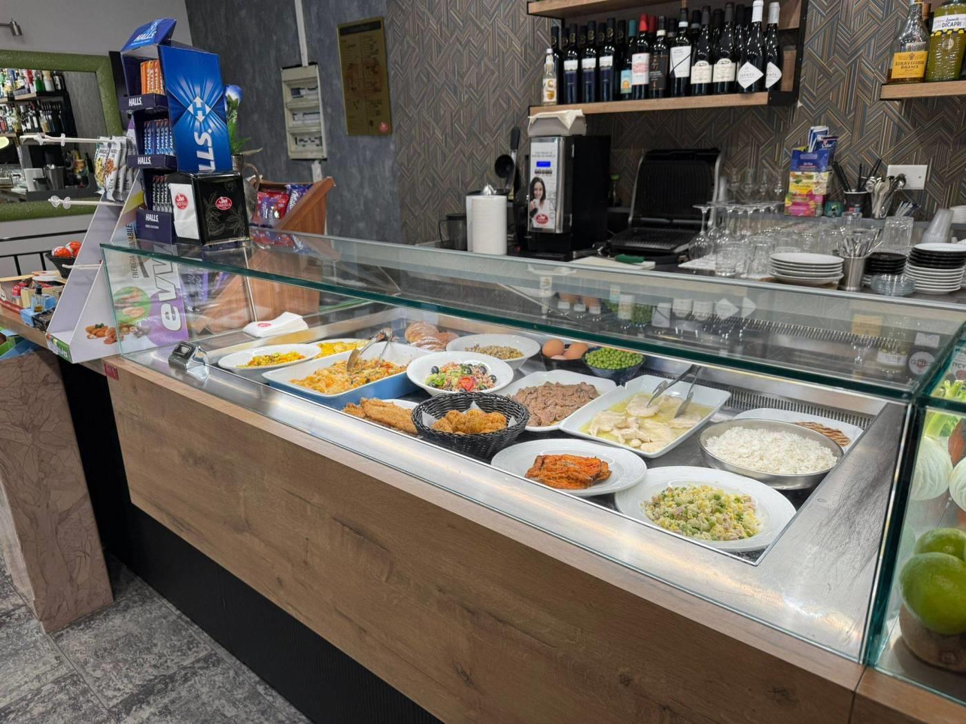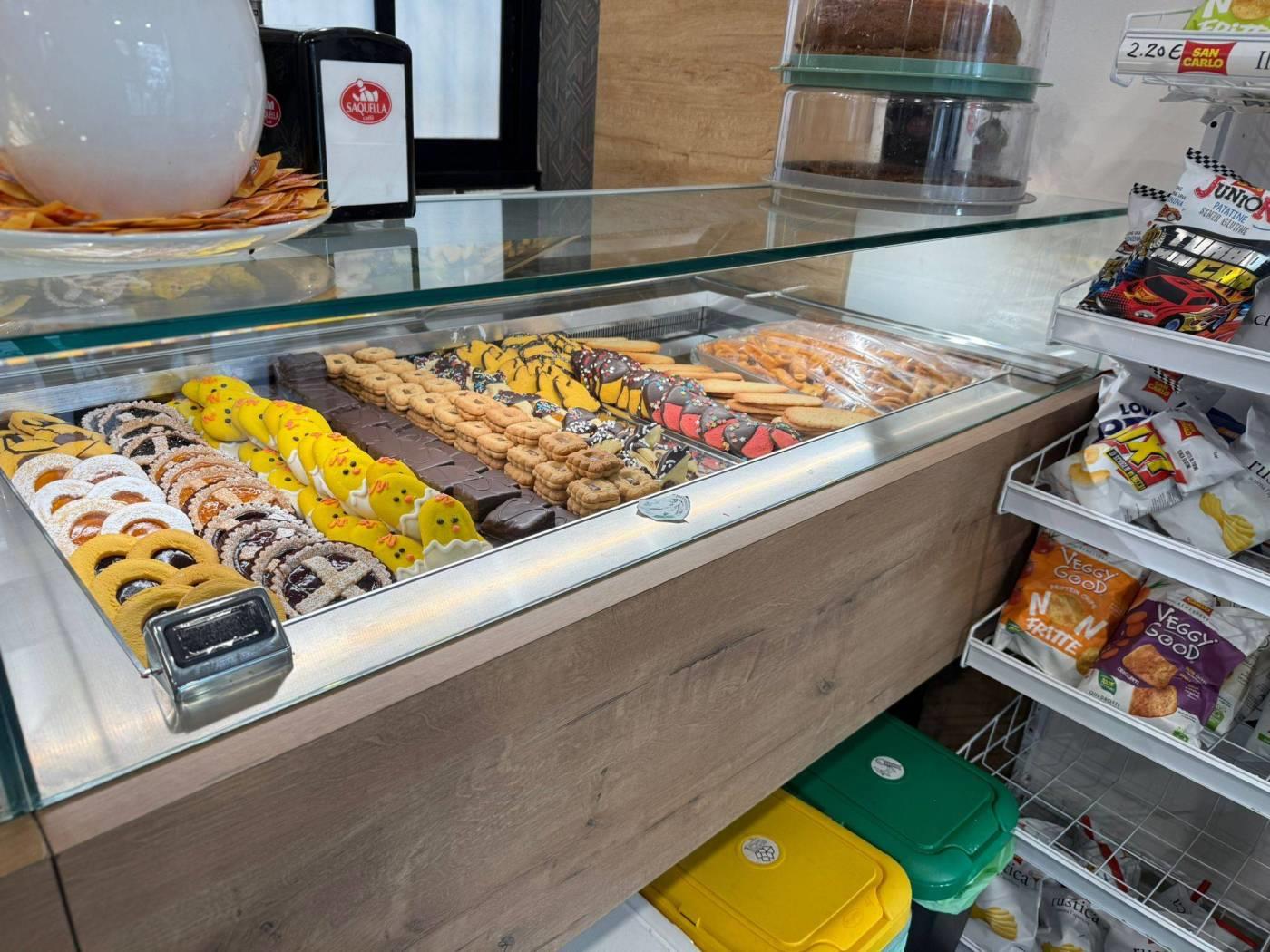 Entrando veniamo accolti da un ampio e moderno bancone attrezzato, suddiviso in zona caffetteria, vetrina per esposizione della gastronomia e della pasticceria, completo di retrobanco .