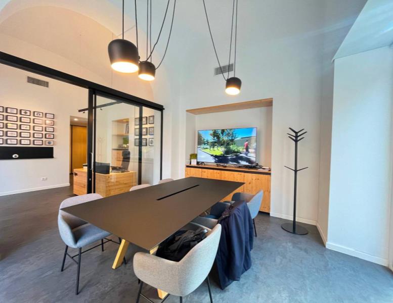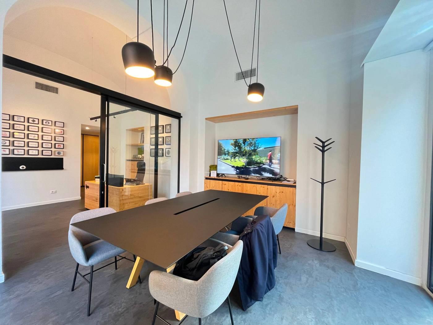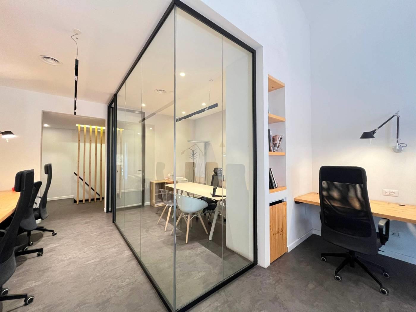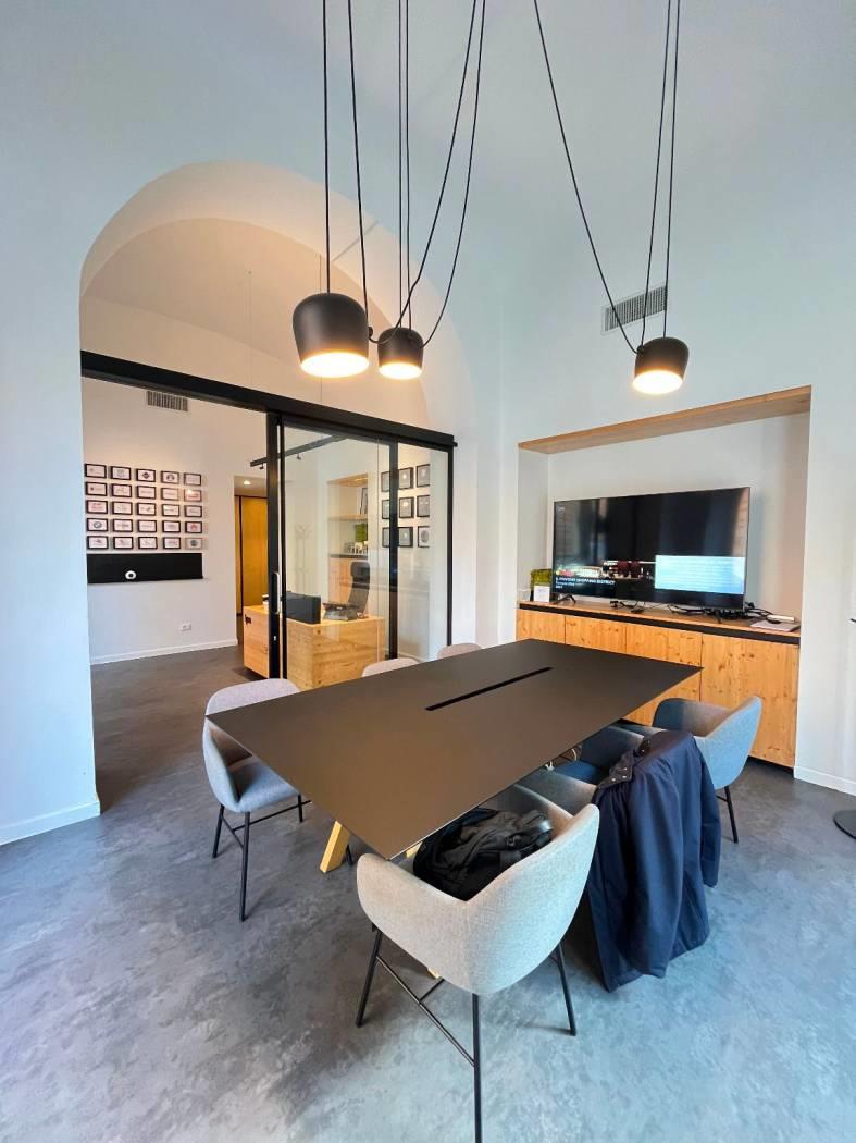 La superficie è organizzata in 5 ambienti versatili al piano terra, una sala riunioni elegante, un’area ingresso/accoglienza di grande impatto, sala riunione, due uffici e uno spazio coworking che permette di ospitare fino a 15 postazioni, e servizio.