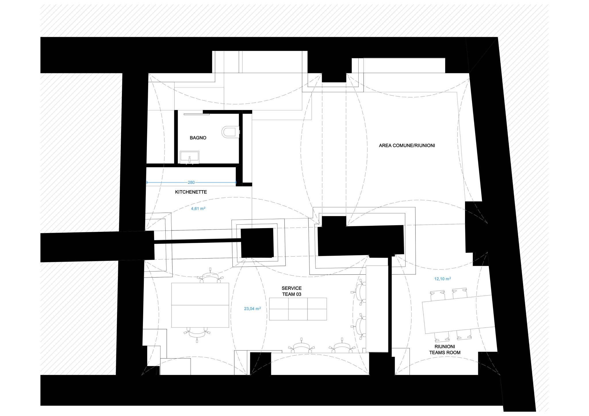 Completano la disposizioni gli spazi al piano semi-interrato, composto da un angolo attrezzato cucina/zona break, ampia sala, due ambienti di lavoro e servizio. Gli spazi ampi, regolari e luminosi garantiscono comfort e privacy.