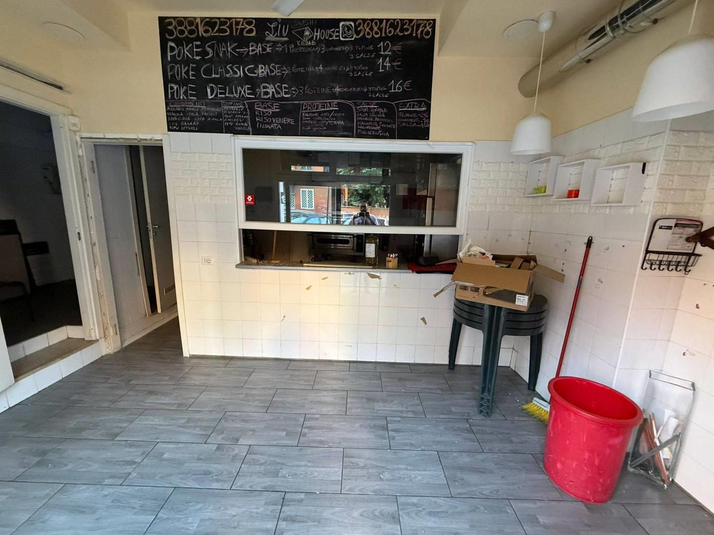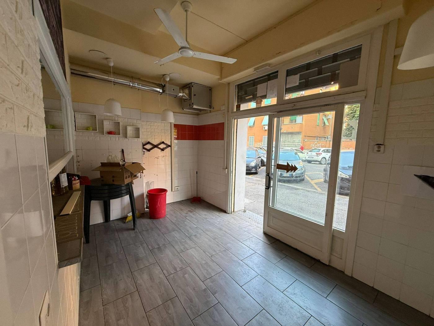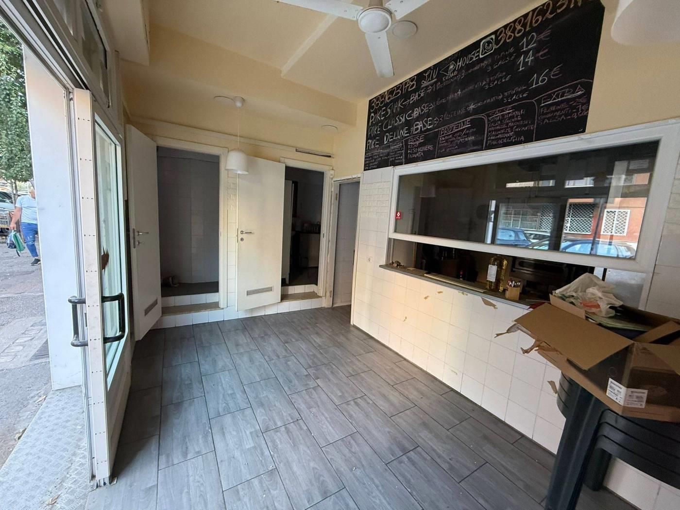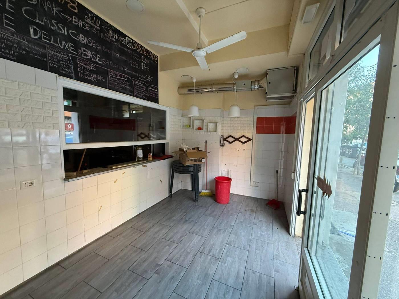 ampia vetrina su strada, bancone, bagno, un piccolo magazzino, retronegozio completo di attrezzature ( forno per pizza, frigorifero, lavandino e banco da lavoro).
