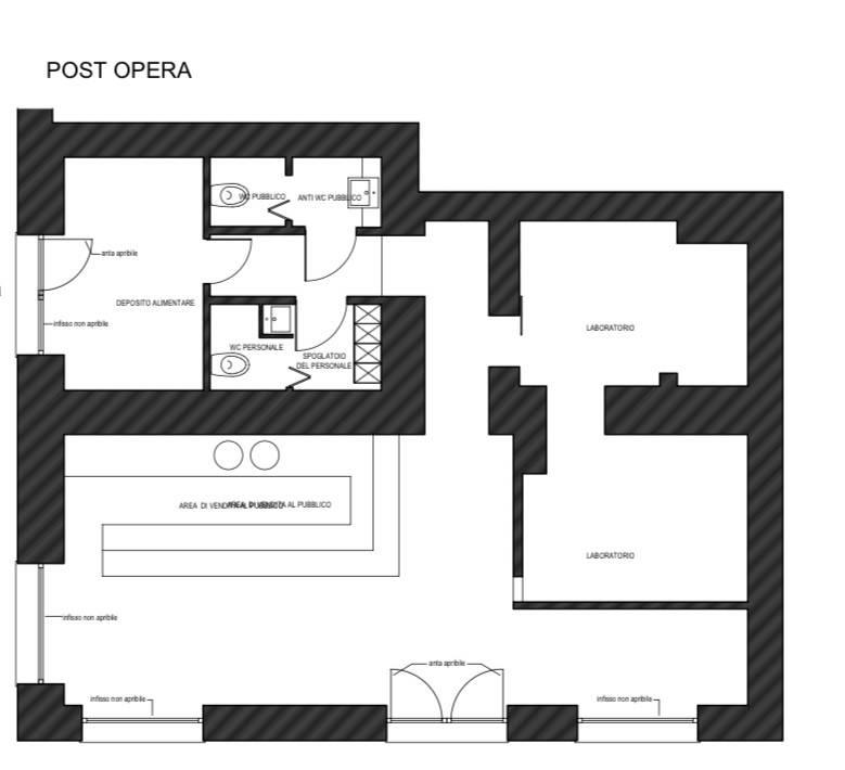 Completano il locale il servizio per gli ospiti, il servizio e lo spogliatoio per i dipendenti ed un ampio magazzino con soppalco.