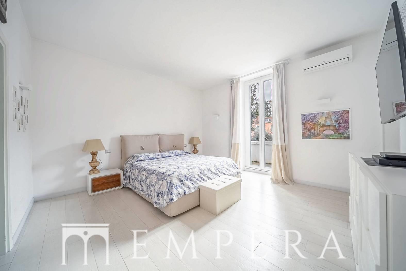 La zona notte principale ospita una prestigiosa master suite con bagno en suite di generose dimensioni, dotato sia di doccia che di vasca idromassaggio, cabina armadio finestrata, una seconda camera e un ulteriore bagno. Al livello superiore, illuminato da lucernari e impreziosito da soffitti in legno con travi a vista, trovano spazio tre camere mansardate e un bagno dedicato. Completa la residenza, all'interno della torretta, uno studio panoramico con vista aperta sulla città.