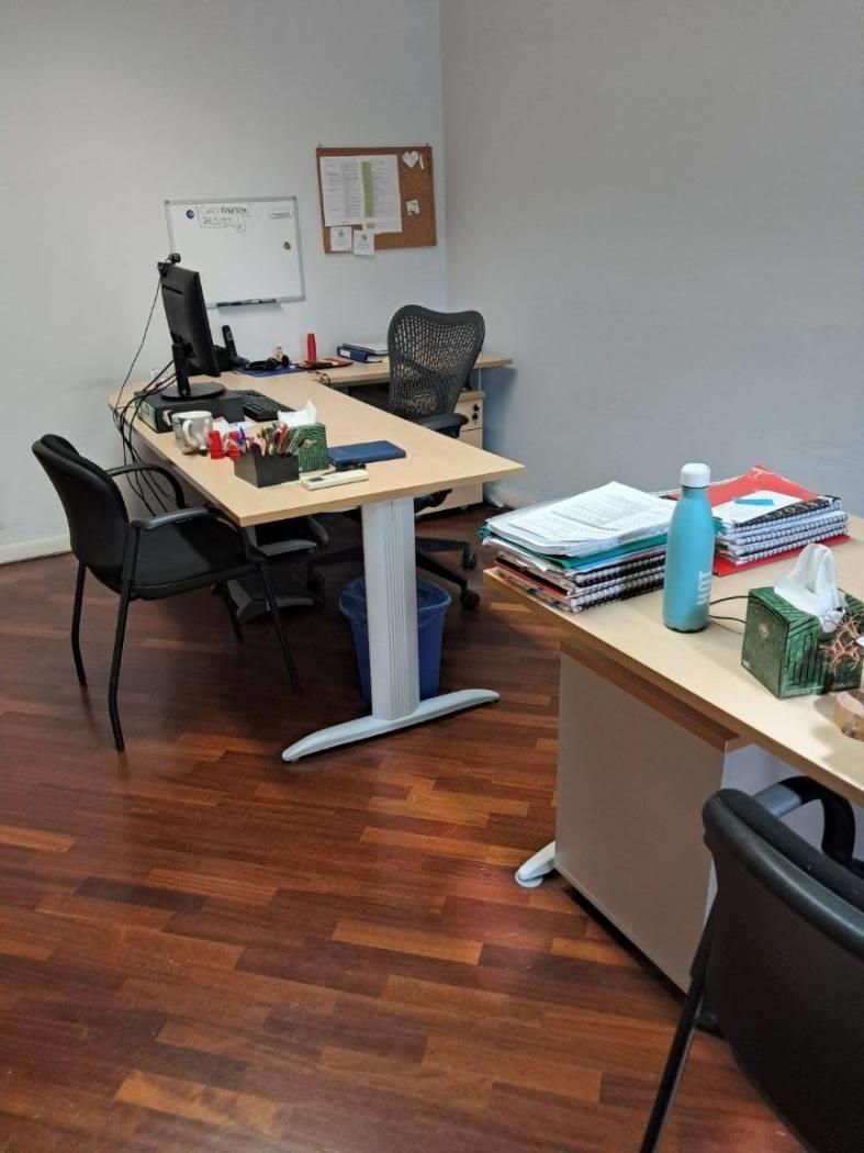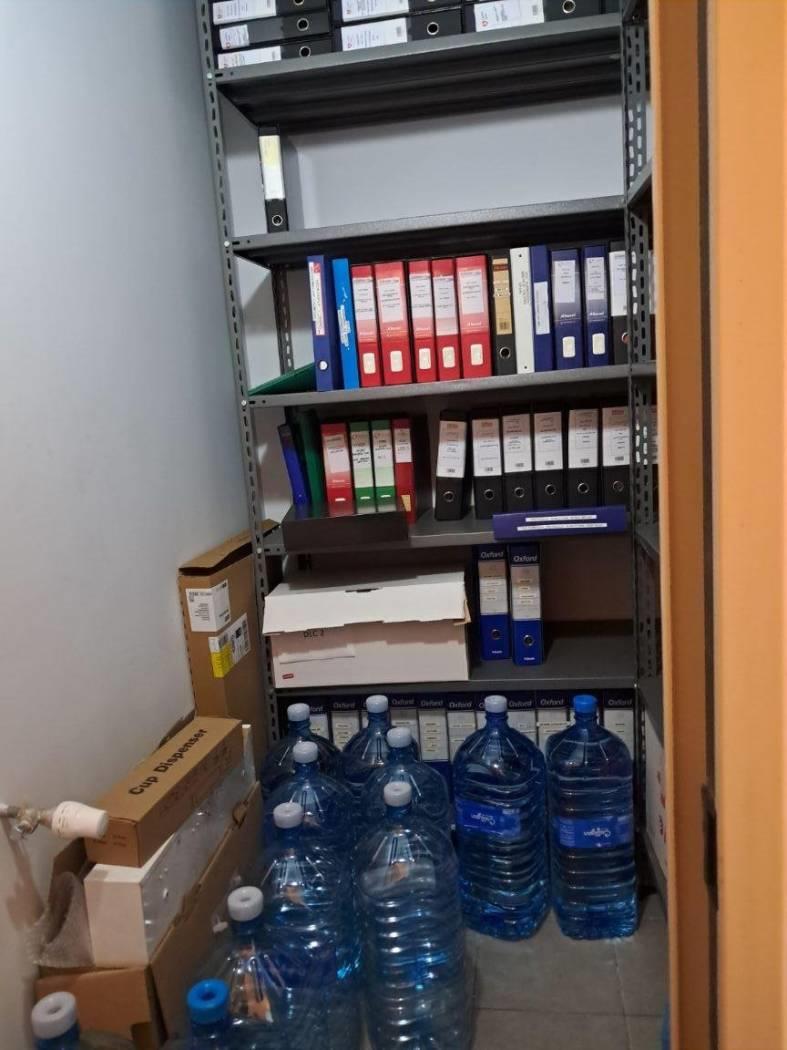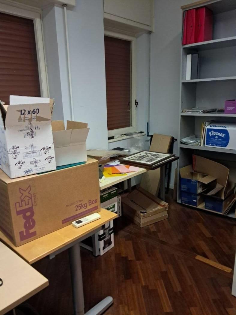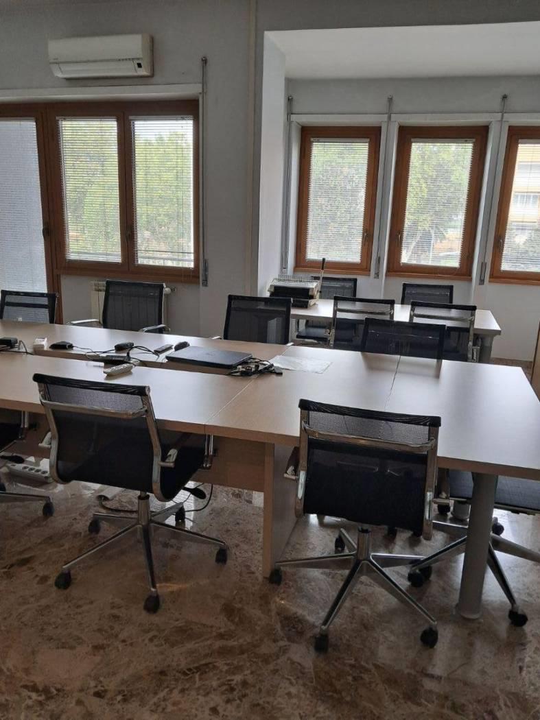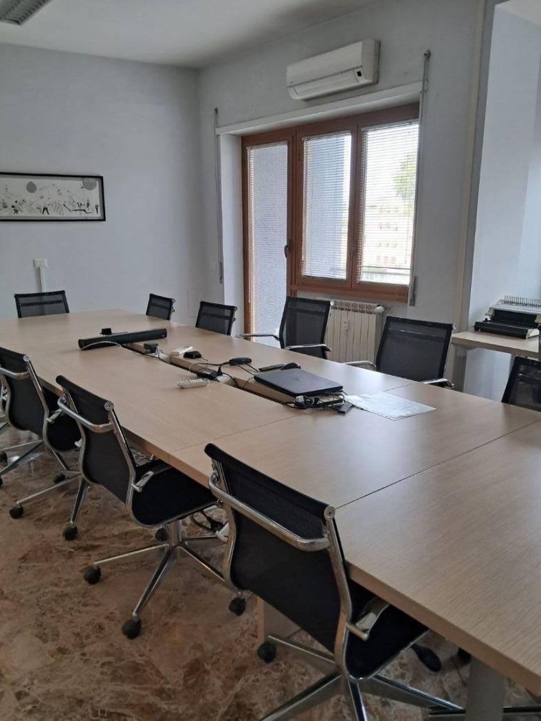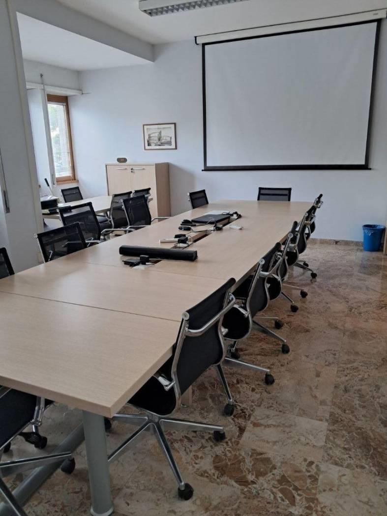 Dall'ingresso principale si accede alla tripla sala riunioni con balcone e, sempre dall'ingresso, inizia un corridoio che disimpegna gli altri 5 vani, il ripostiglio/magazzino e i due bagni (di cui uno con doccia).