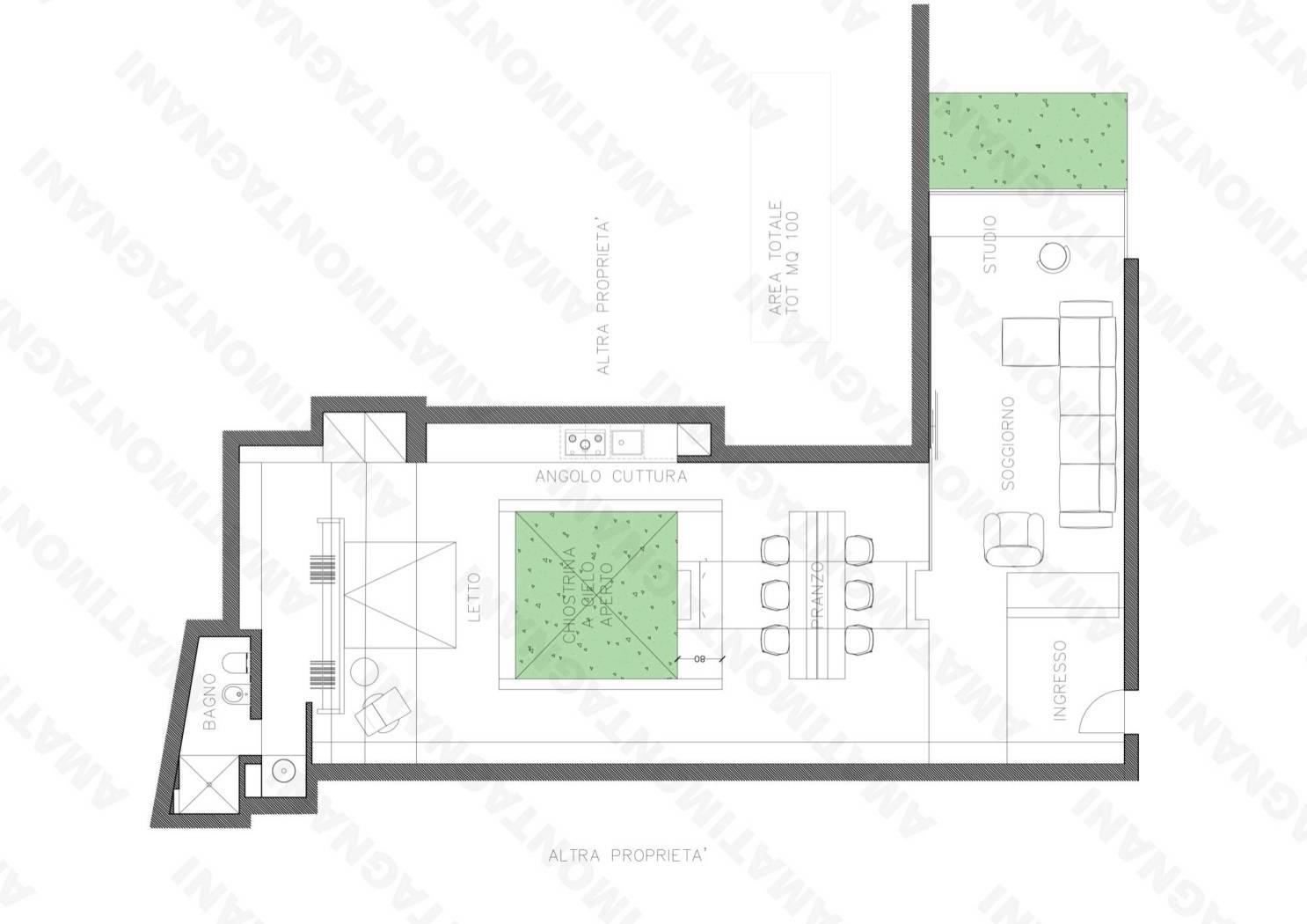 La pianta a "elle" suggerisce una nuova distribuzione degli spazi creando un ingresso sul soggiorno, con affaccio verde, in continuità verso la zona pranzo, impreziosita da un elegante chiostra verde a cielo aperto, cucina a vista e una camera da letto con armadi a muro e bagno. Pranzo, cucina e camera da letto illuminata dalla chiostra.