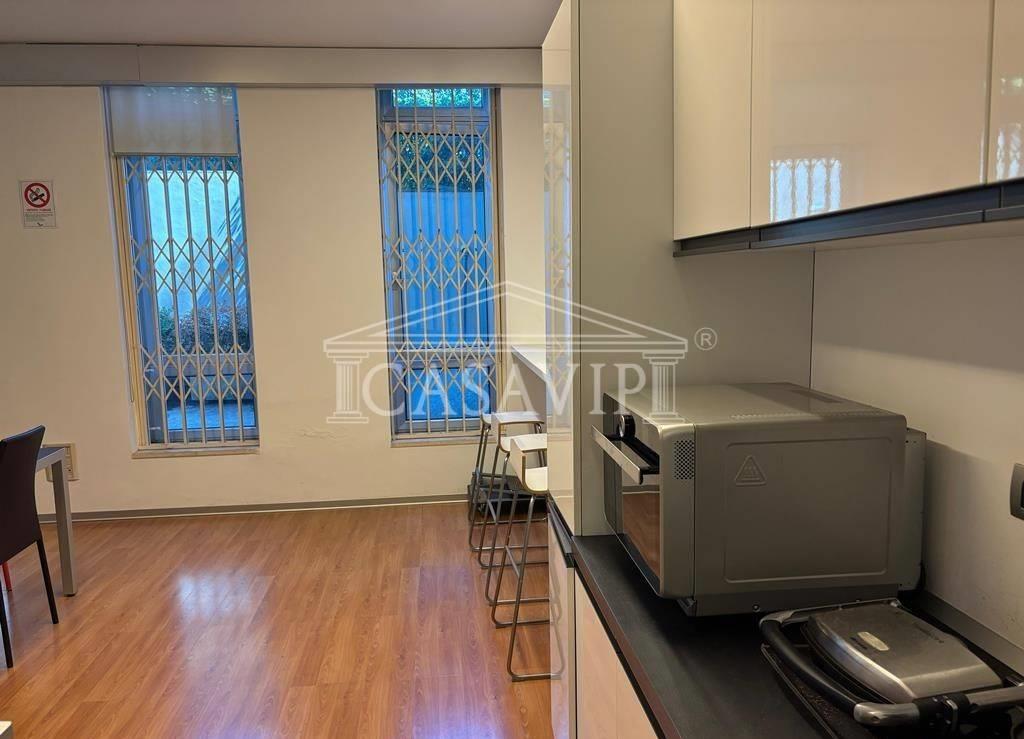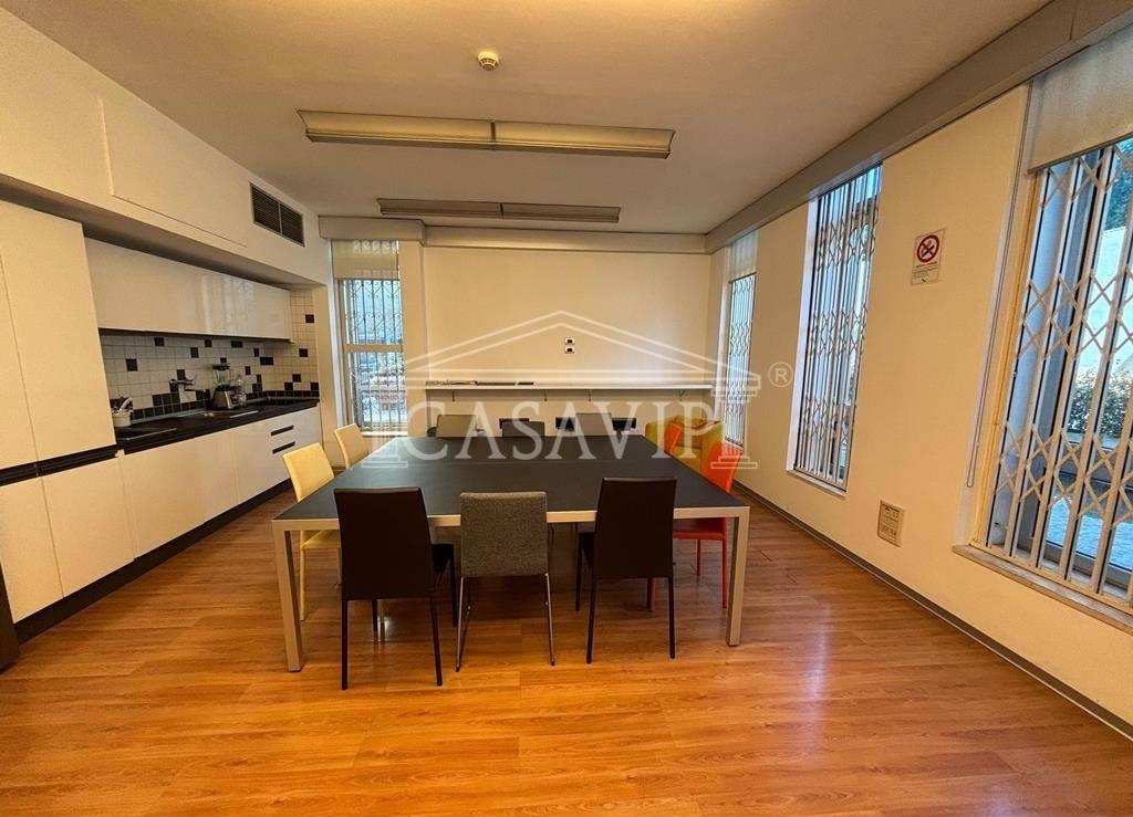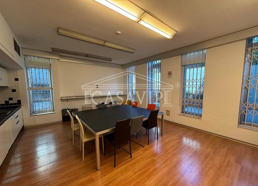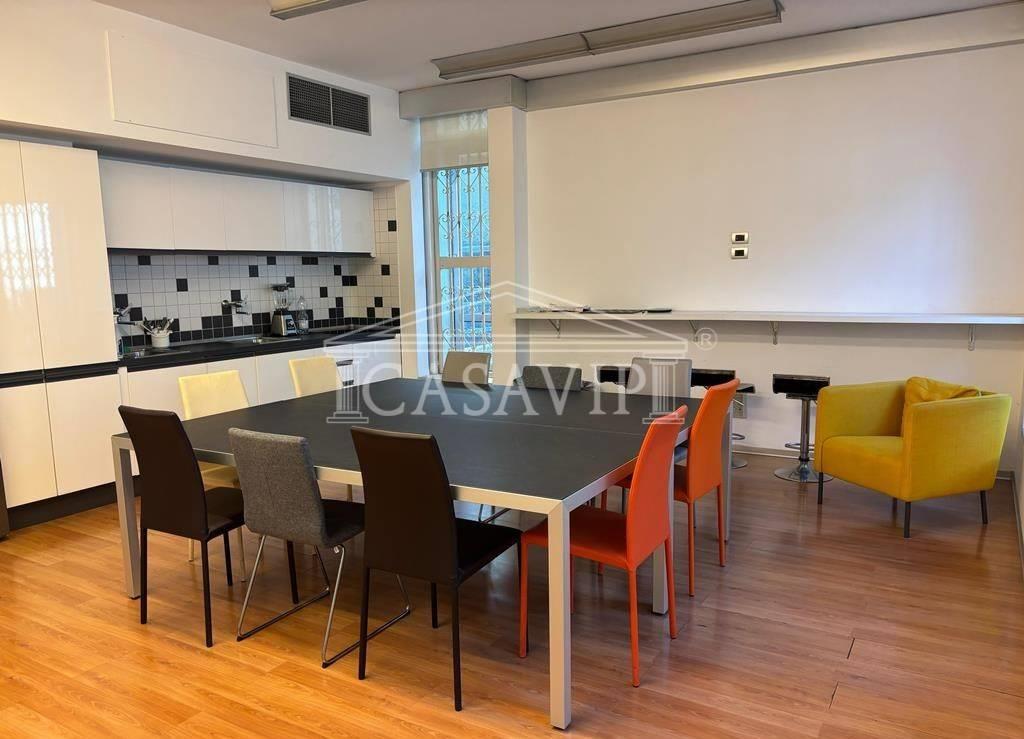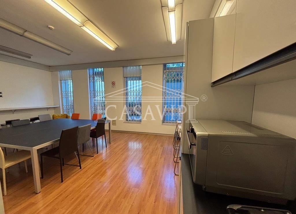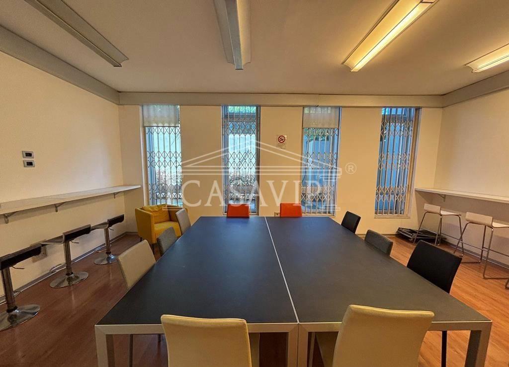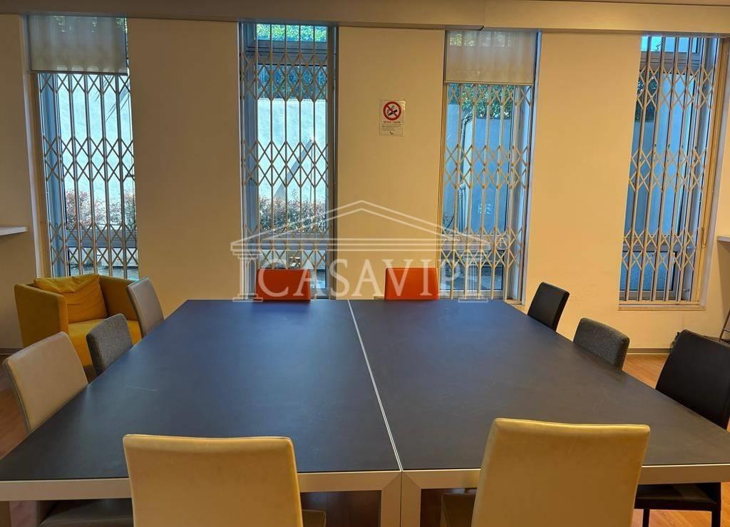 Nella sala riunioni è presente una parete allestita con cucina a vista completa di elettrodomestici, che volendo può essere isolata applicando un pannello di cartongesso ovvero posizionando parete scorrevole che all'occorrenza rende l'attrezzatura fruibile.