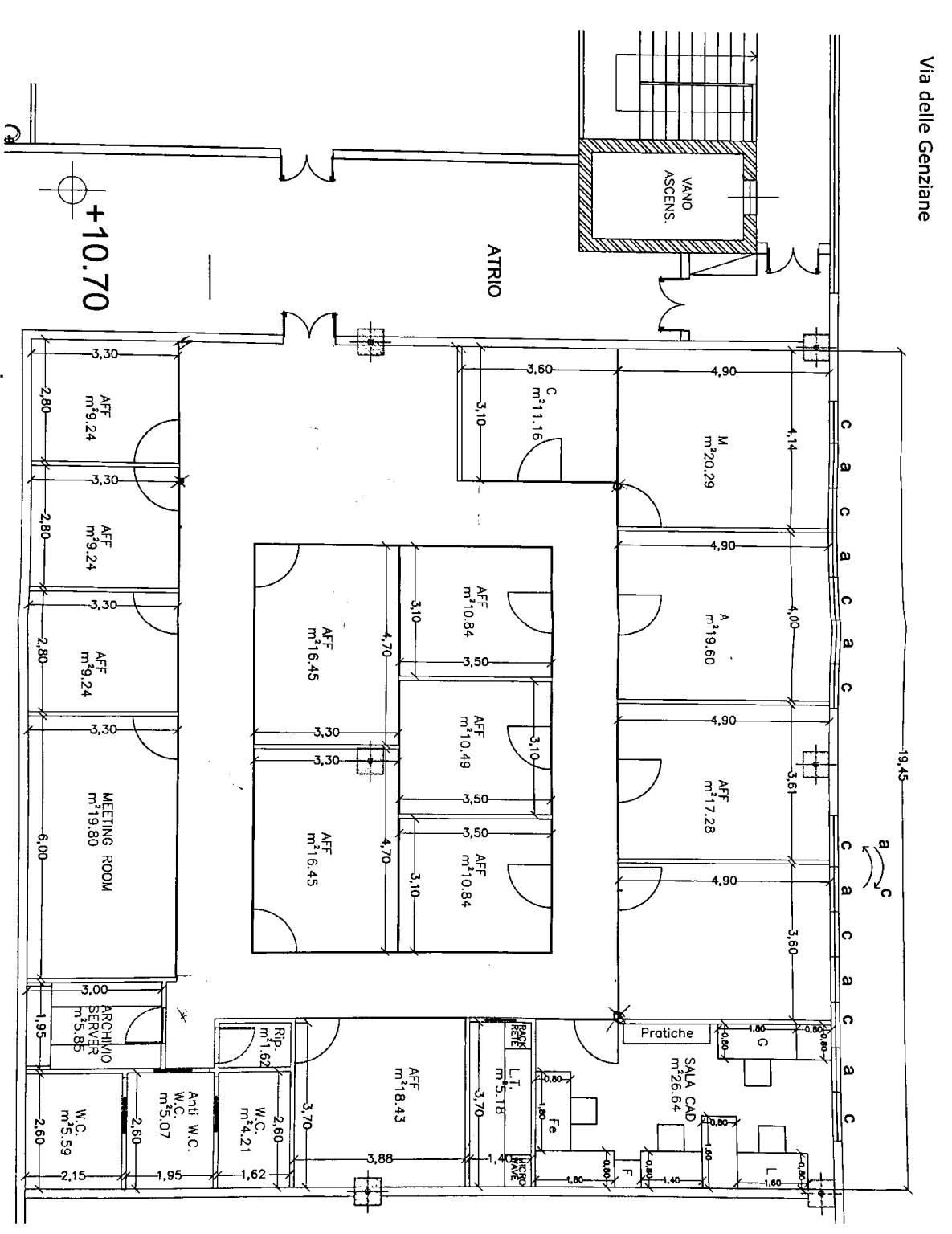 antibagno con lavabo e due bagni a servizio di cui uno per disabili, archivio, locale tecnico per ispezione impianti e diverse aree destinate alla divisione degli ambienti appena descritti.