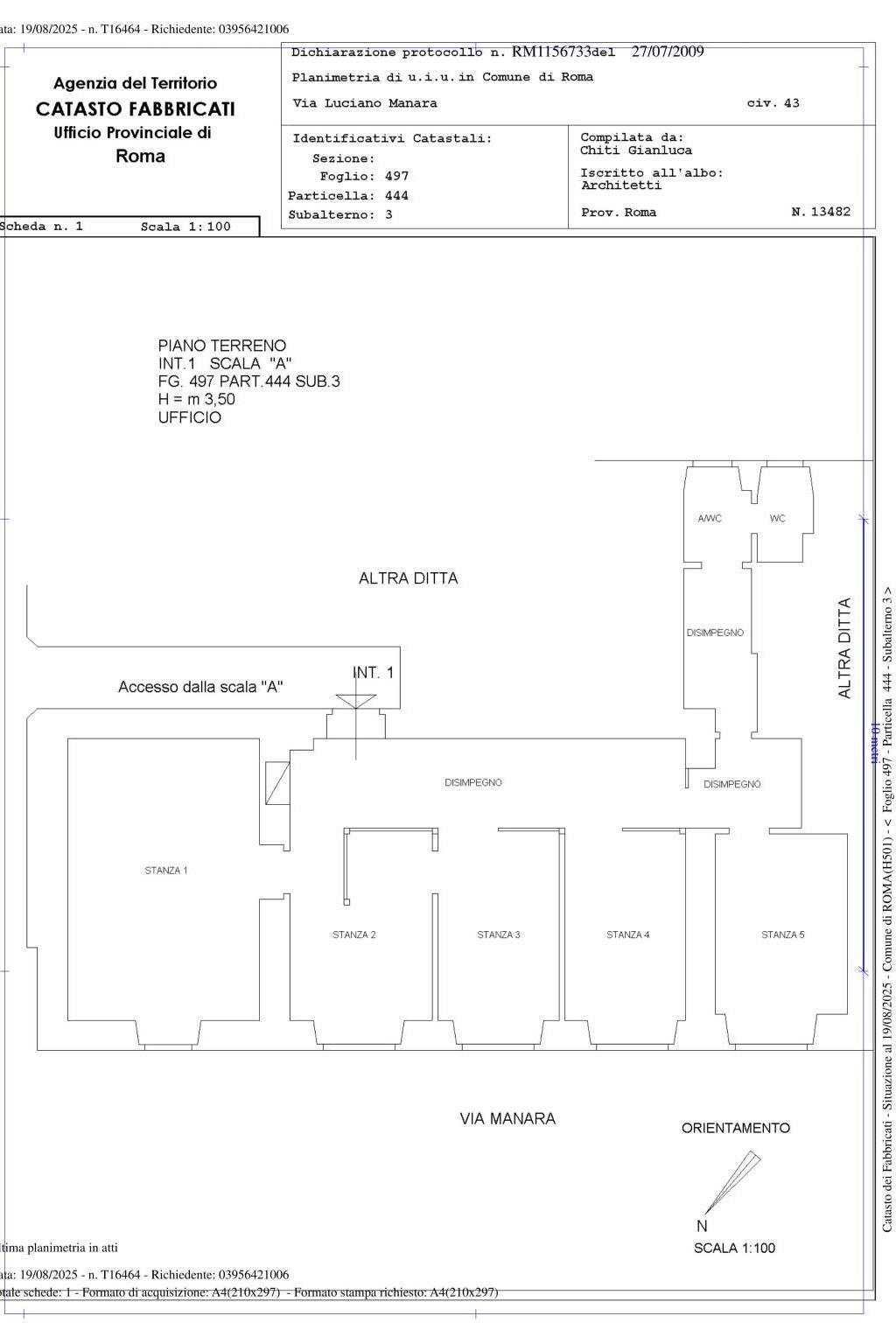 L’immobile è composto da un ampio corridoio e cinque stanze totali, di cui quattro di 9-10 mq ed una di mq 35 con porta blindata, zona archivio, antibagno e bagno.
