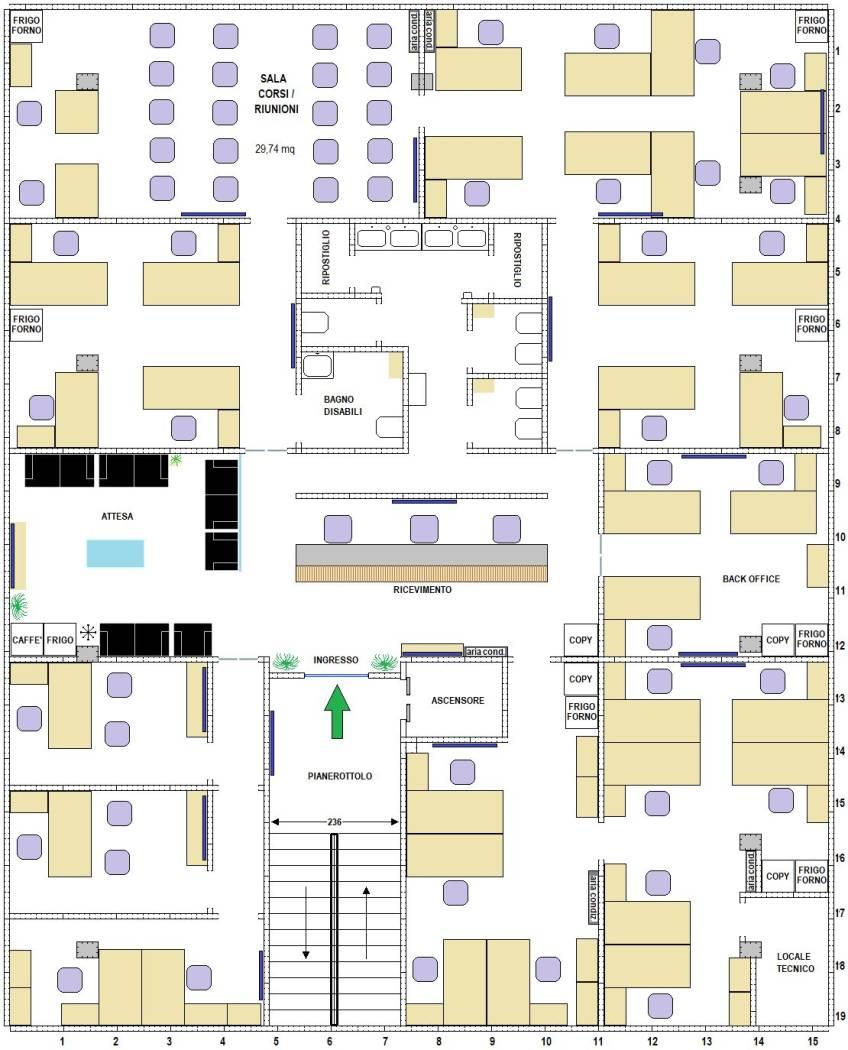 - 38 postazioni, 6 reparti, 3 stanze private, reception, sala riunioni/corsi, sala d'attesa con