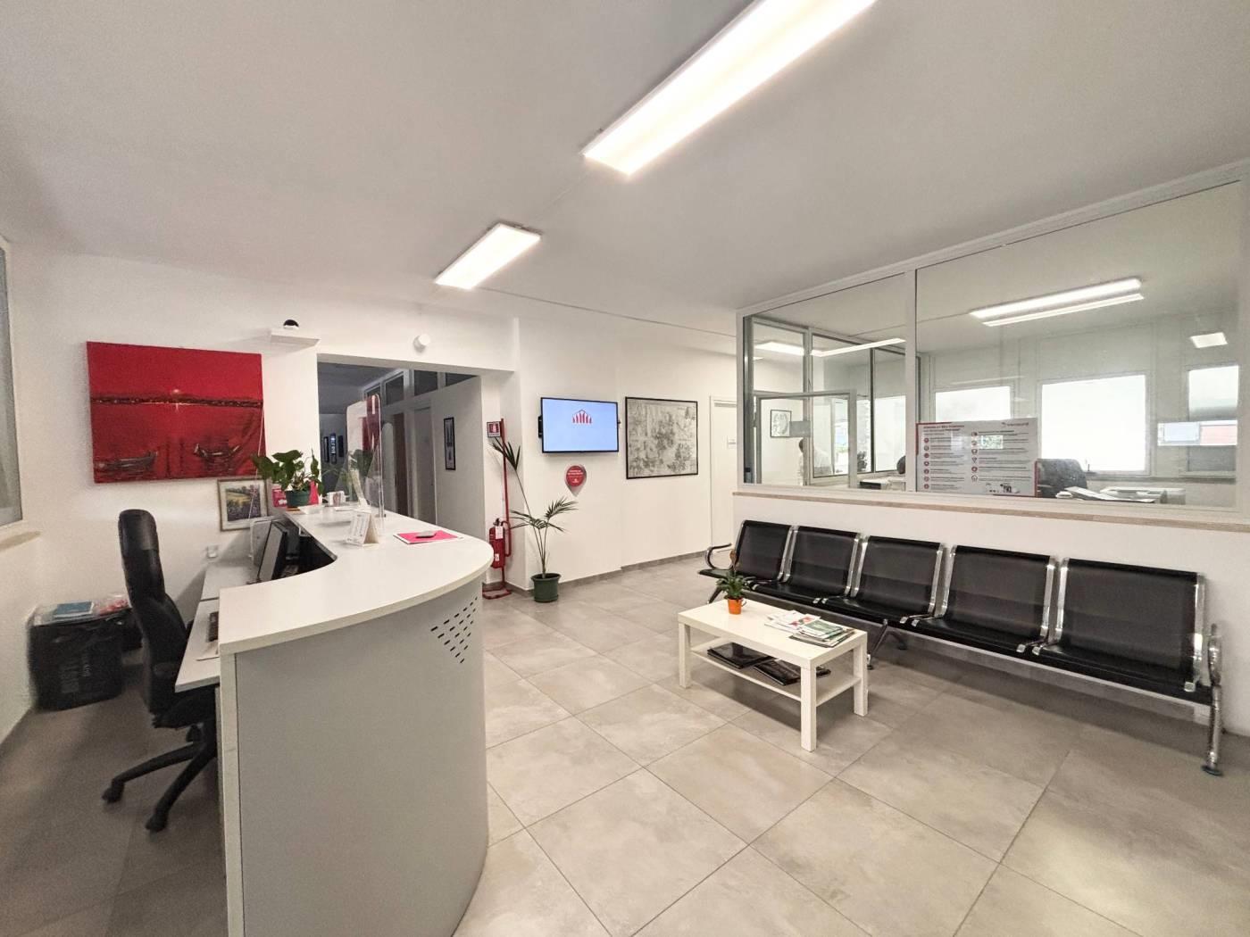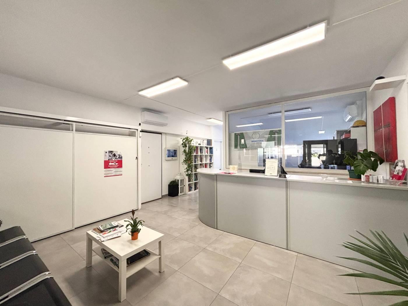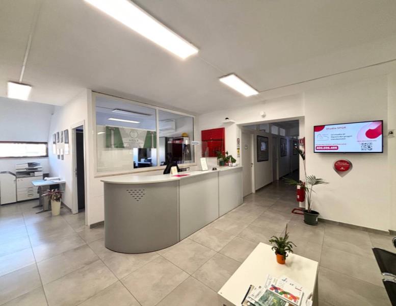 Ampia reception con bancone dedicato all’accoglienza clienti e due uffici separati da pareti in vetro.