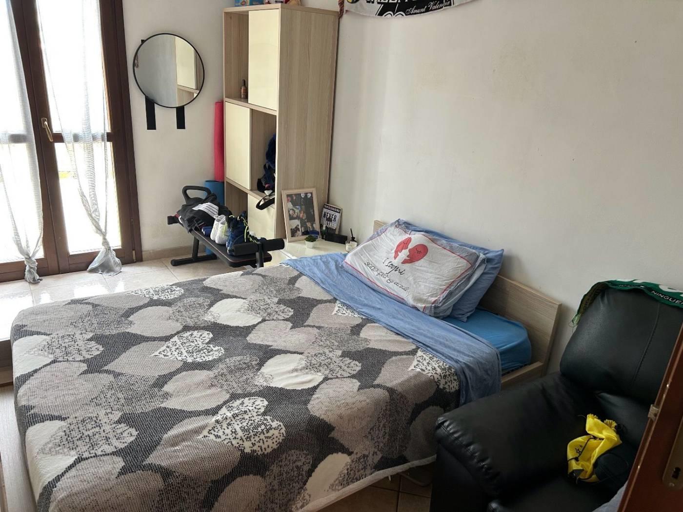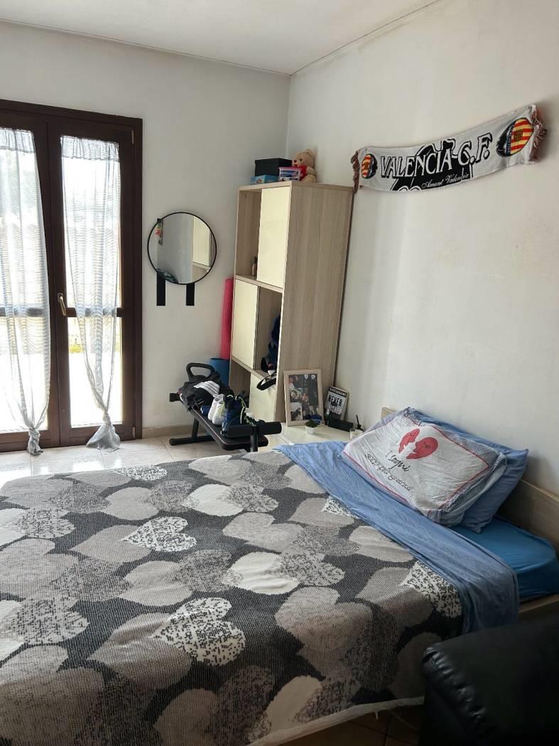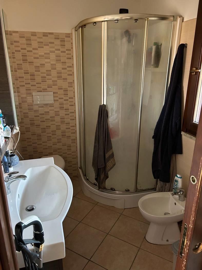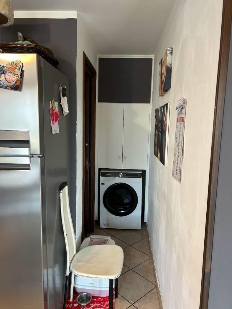 Dalla cucina si accede ad un disimpegno con nicchia armadio a muro/alloggio asciugatrice e bagno di servizio con porta scorrevole, dotato di Lavandino, WC, Bidet e Doccia, con finestra.