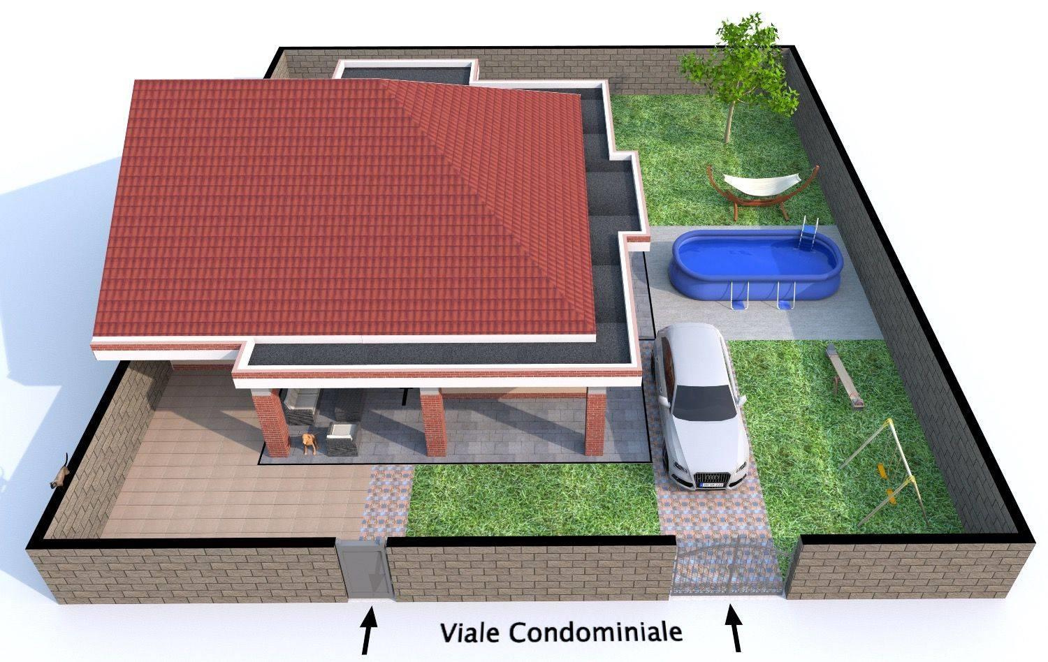 Completa la proprietà un ampio giardino angolare di 285Mq circa. Parte pavimentato da costruzione per il camminamento intorno casa, per le verande e per l'accesso carrabile e pedonale. L'attuale proprietà ha inoltre pavimentato, sia davanti che dietro, parte del giardino.