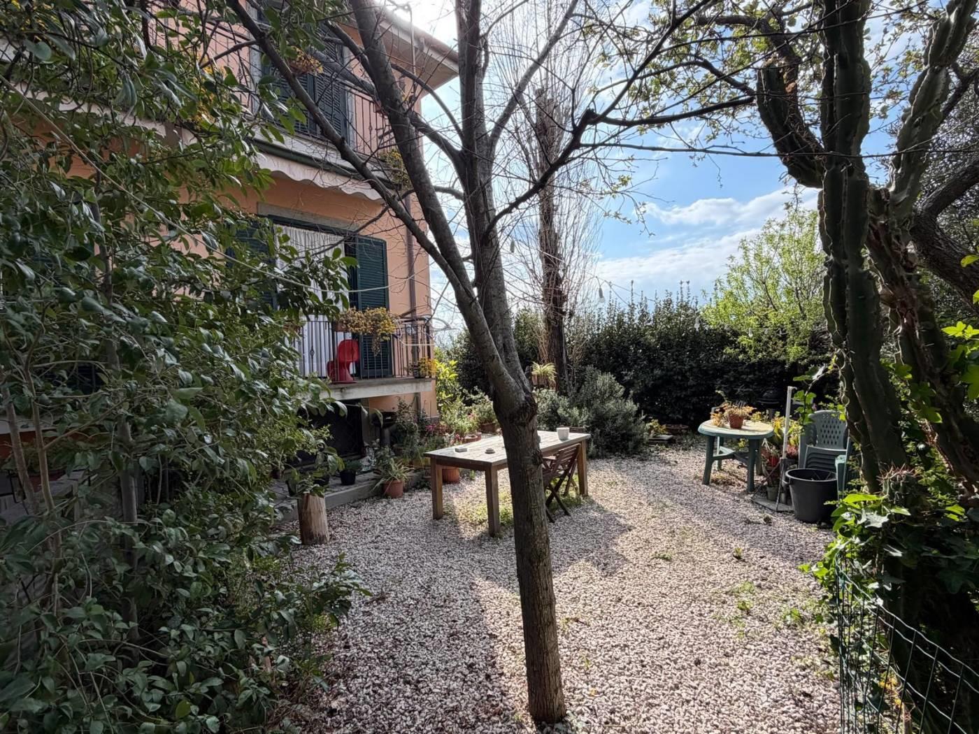 Giardino parte in brecciolino utilizzato per parcheggio auto e parte a verde con alberi ad alto fusto adatto per feste all'aperto.
