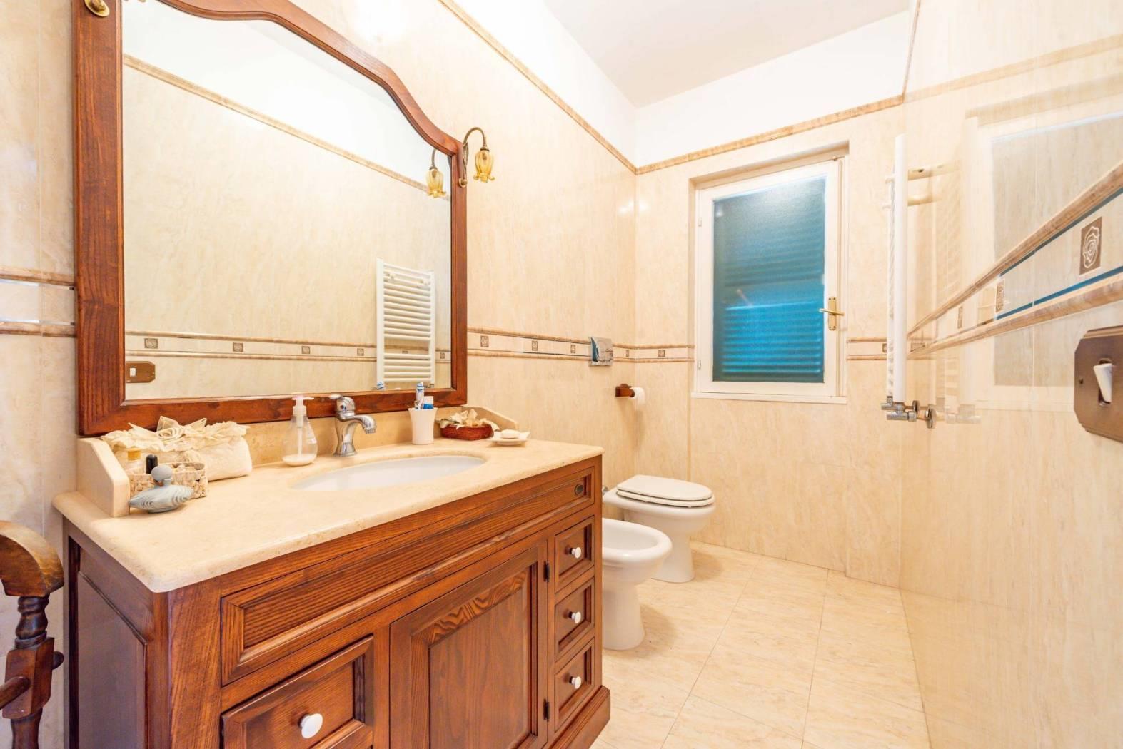 Il piano superiore ospita la zona notte con una camera matrimoniale con bagno privato a balcone vista mare, due camere aggiuntive di cui una con balcone, un ulteriore bagno e ripostiglio.