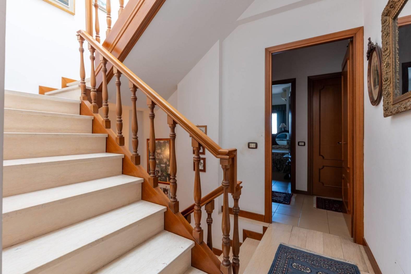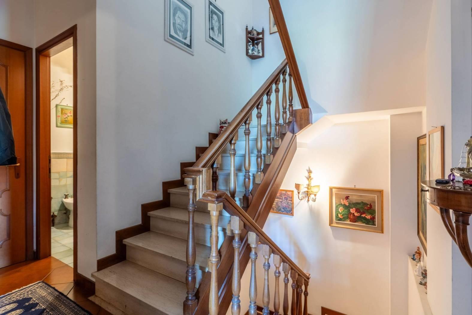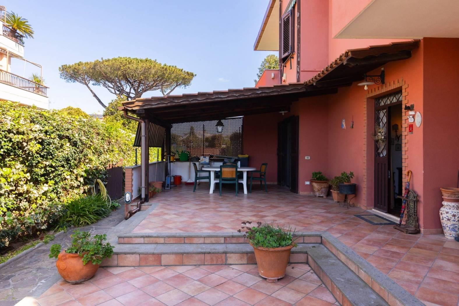 Il piano terra è composto da un luminoso soggiorno con accesso diretto al giardino, una cucina abitabile, un pratico ripostiglio e un bagno di servizio. Al primo piano si trovano tre camere da letto, due bagni e un ulteriore ripostiglio. La mansarda ospita una spaziosa camera con bagno privato, un ripostiglio e un solarium, ideale per godersi il sole in totale privacy.