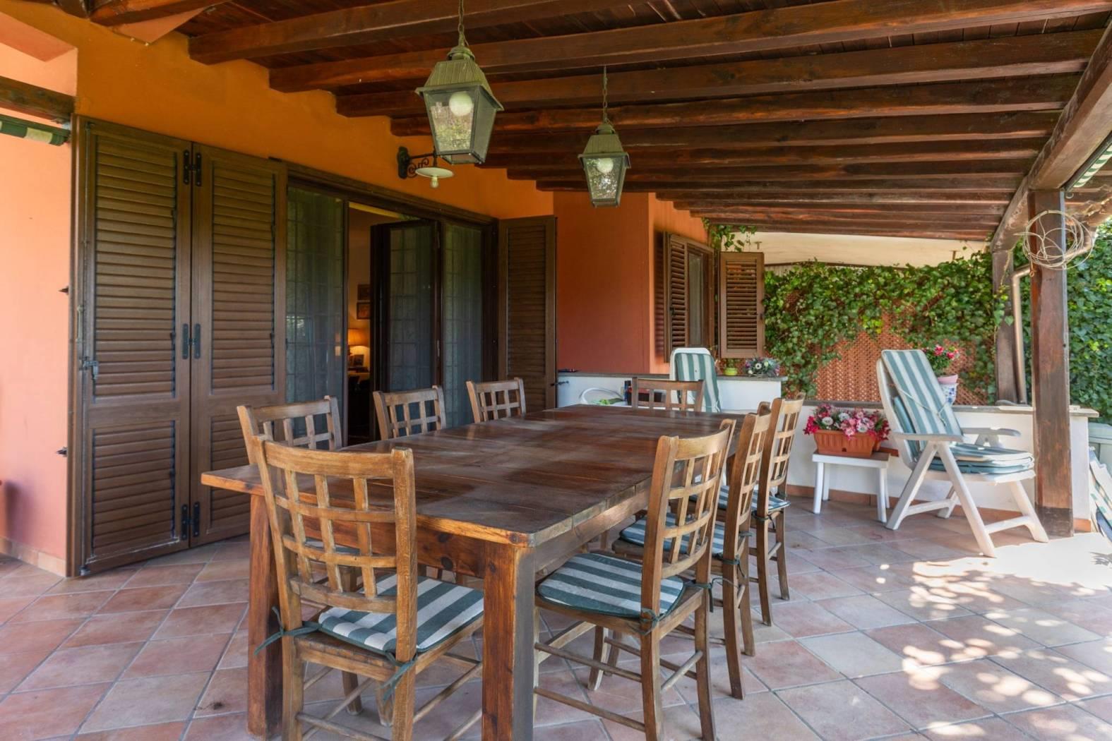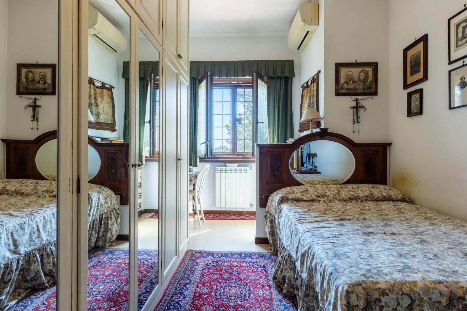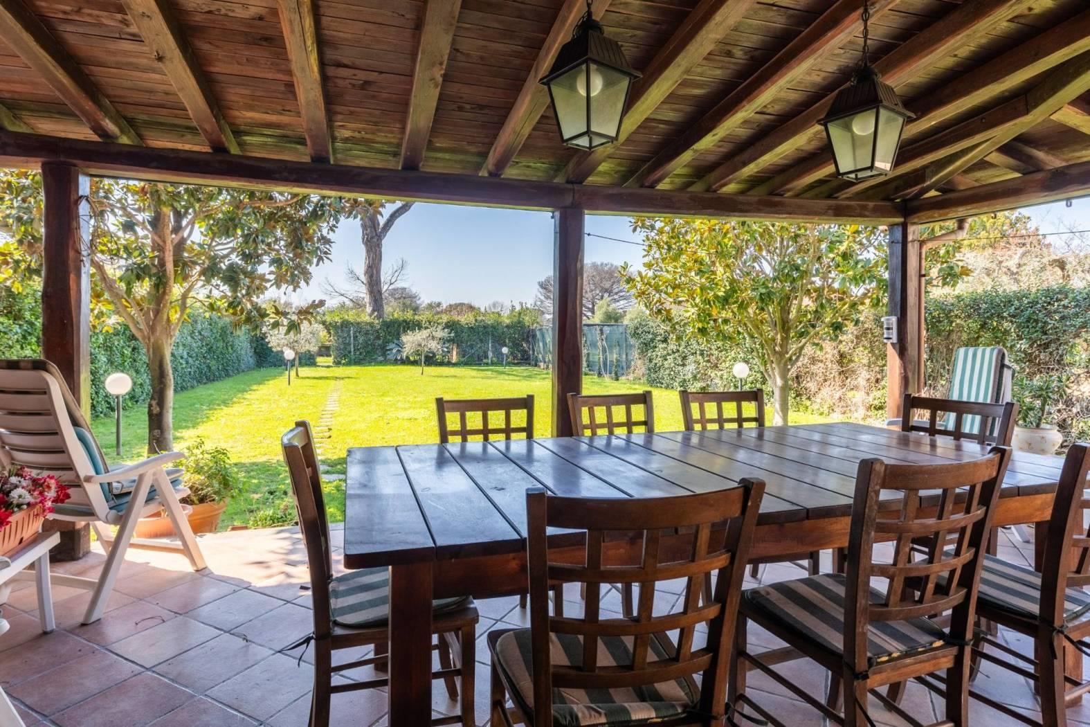 Il piano terra è composto da un luminoso soggiorno con accesso diretto al giardino, una cucina abitabile, un pratico ripostiglio e un bagno di servizio. Al primo piano si trovano tre camere da letto, due bagni e un ulteriore ripostiglio. La mansarda ospita una spaziosa camera con bagno privato, un ripostiglio e un solarium, ideale per godersi il sole in totale privacy.