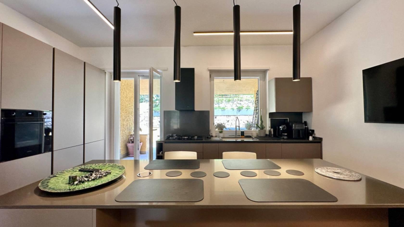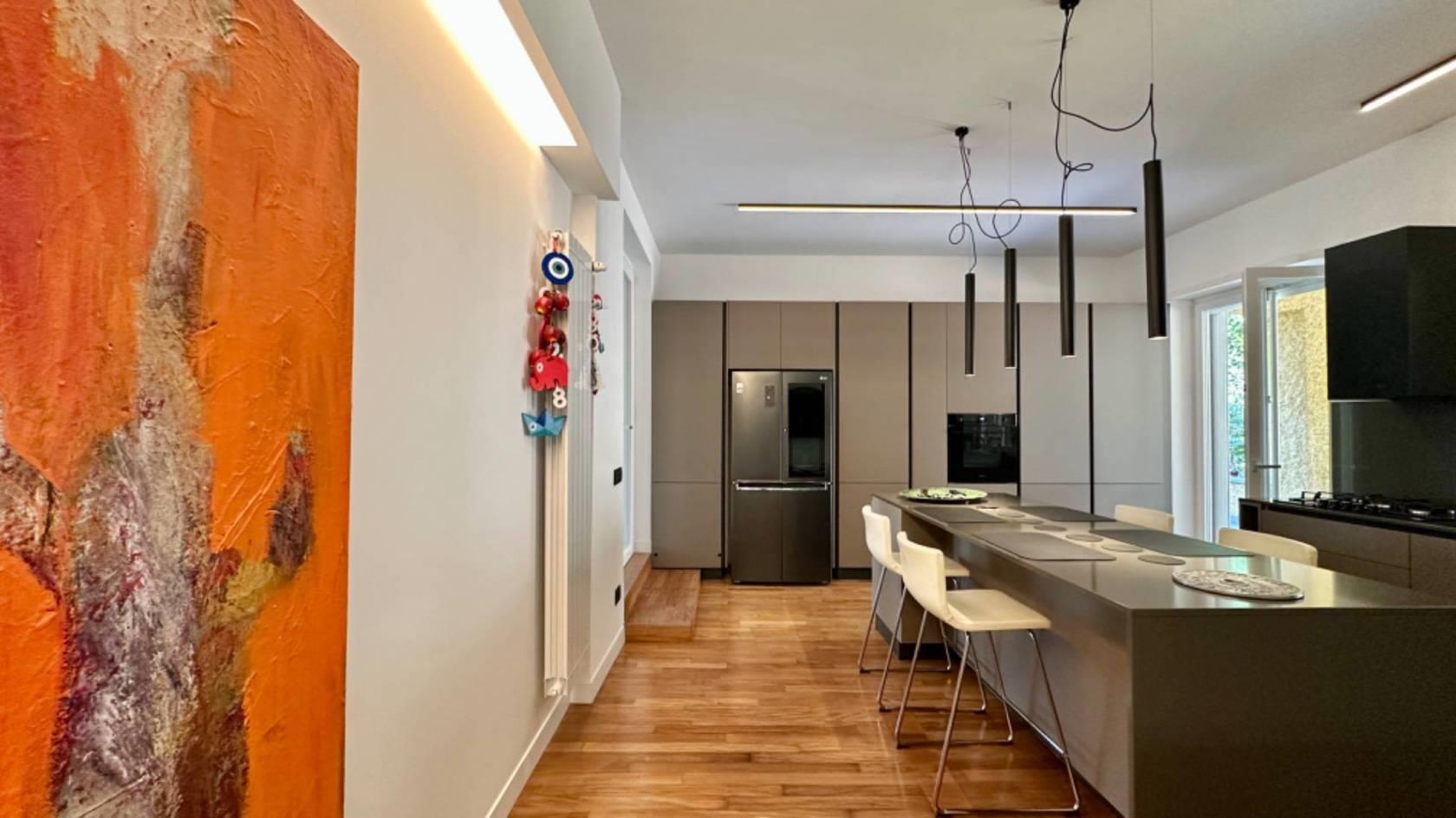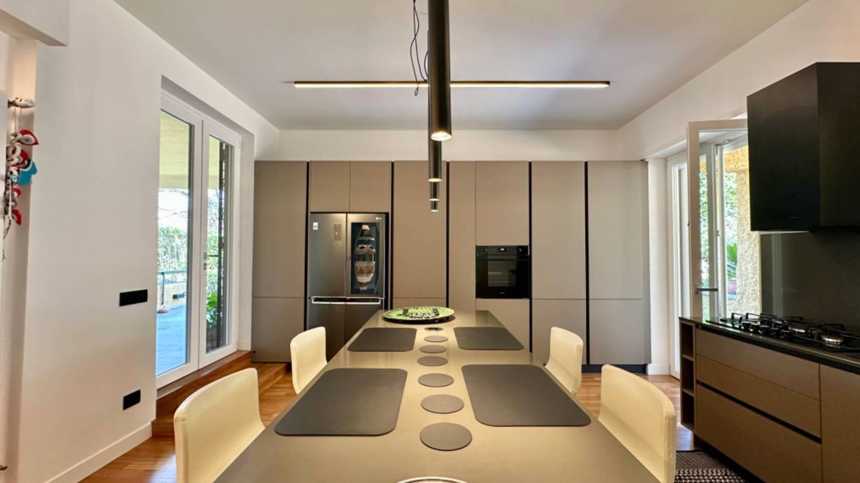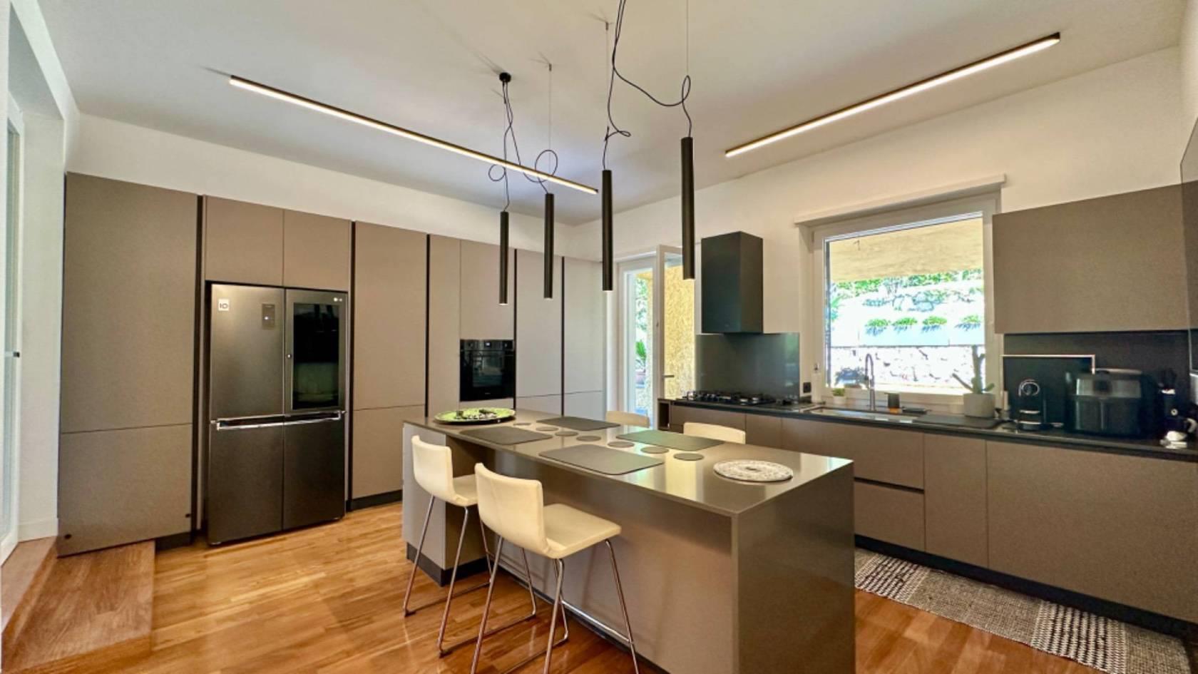 Adiacente al salone, troverete una grande e moderna cucina con isola, rendendo questo ambiente conviviale e funzionale. Al piano è presente un servizio per gli ospiti.