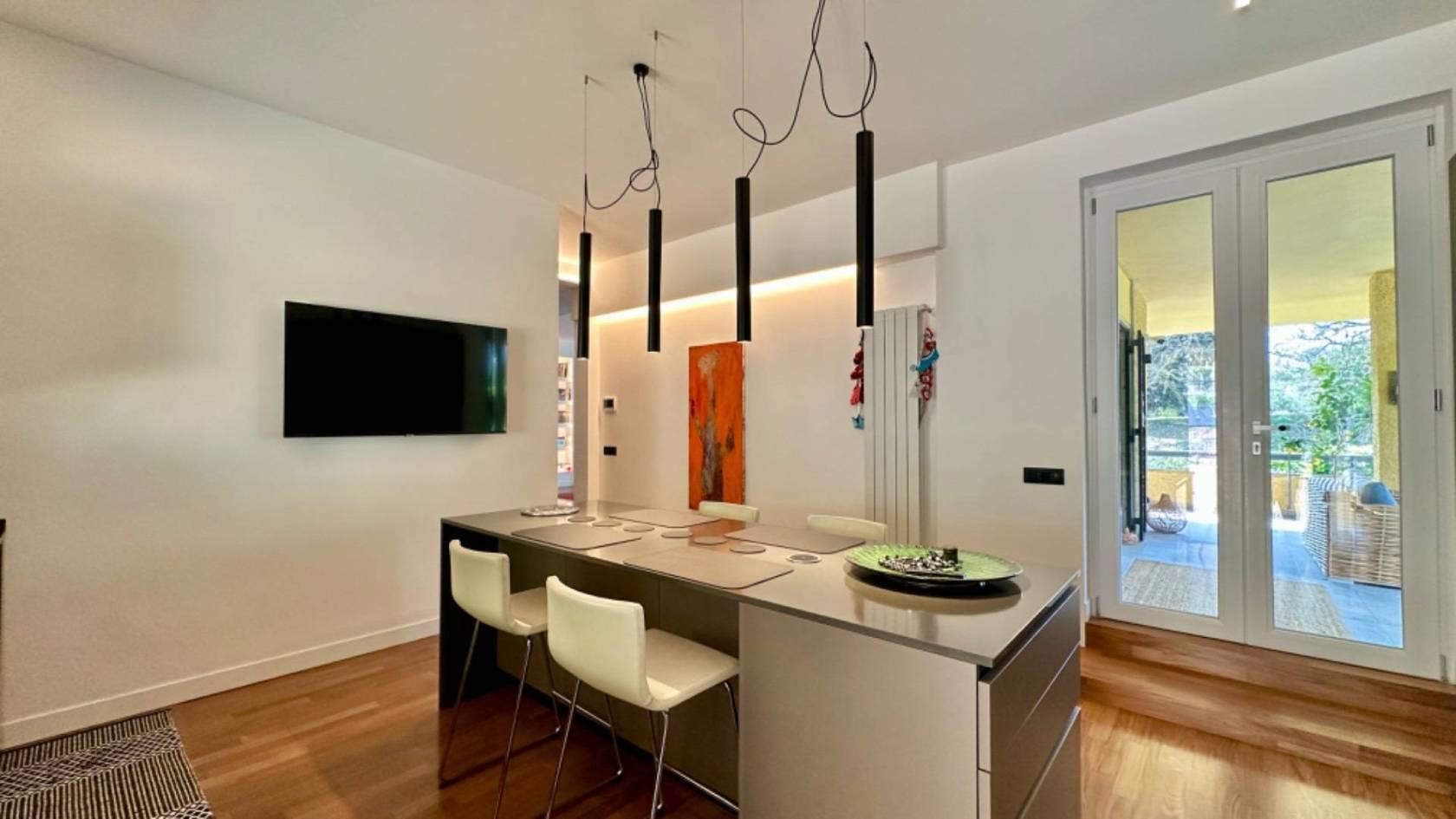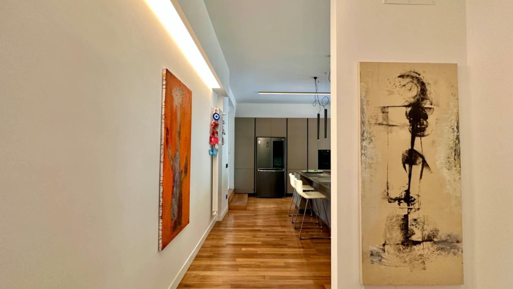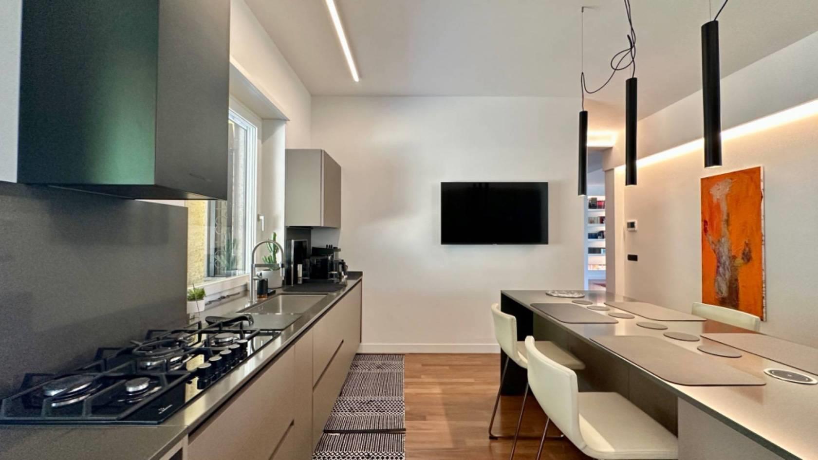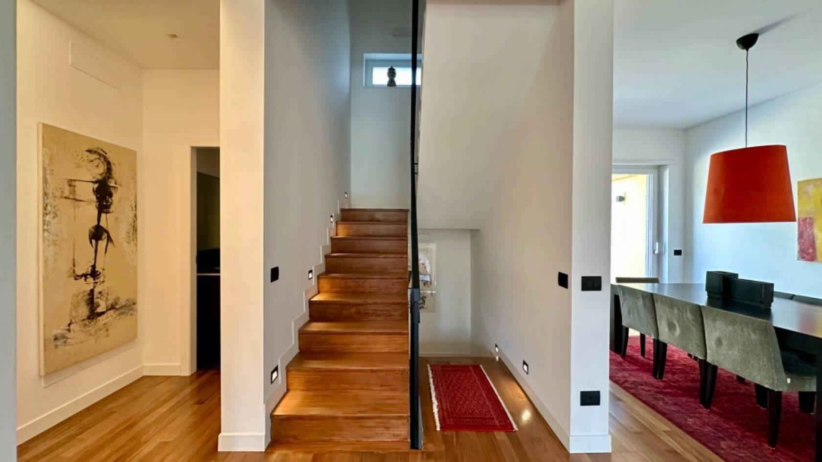 Adiacente al salone, troverete una grande e moderna cucina con isola, rendendo questo ambiente conviviale e funzionale. Al piano è presente un servizio per gli ospiti.
