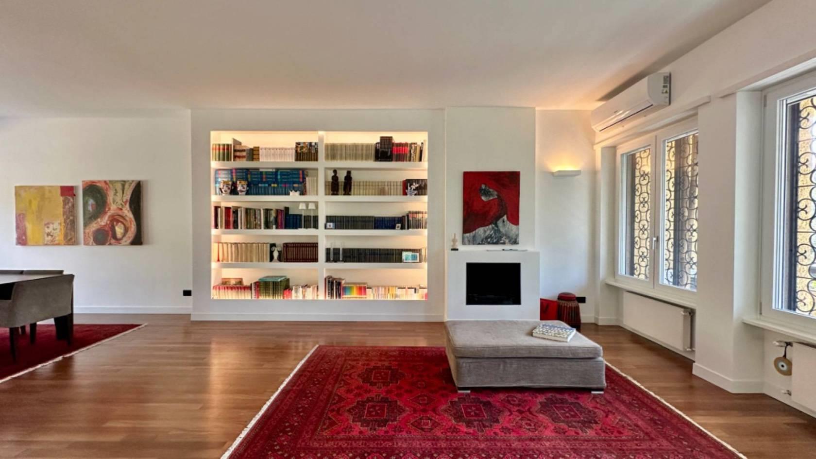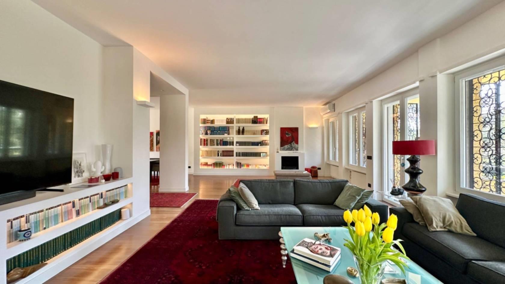 All'ingresso della villa, sarete accolti da un ampio salone dotato di camino, che si affaccia sulle grandi vetrate, offrendo una vista sul verde circostante e creando un'osmosi perfetta con gli spazi esterni, ideali per momenti conviviali.