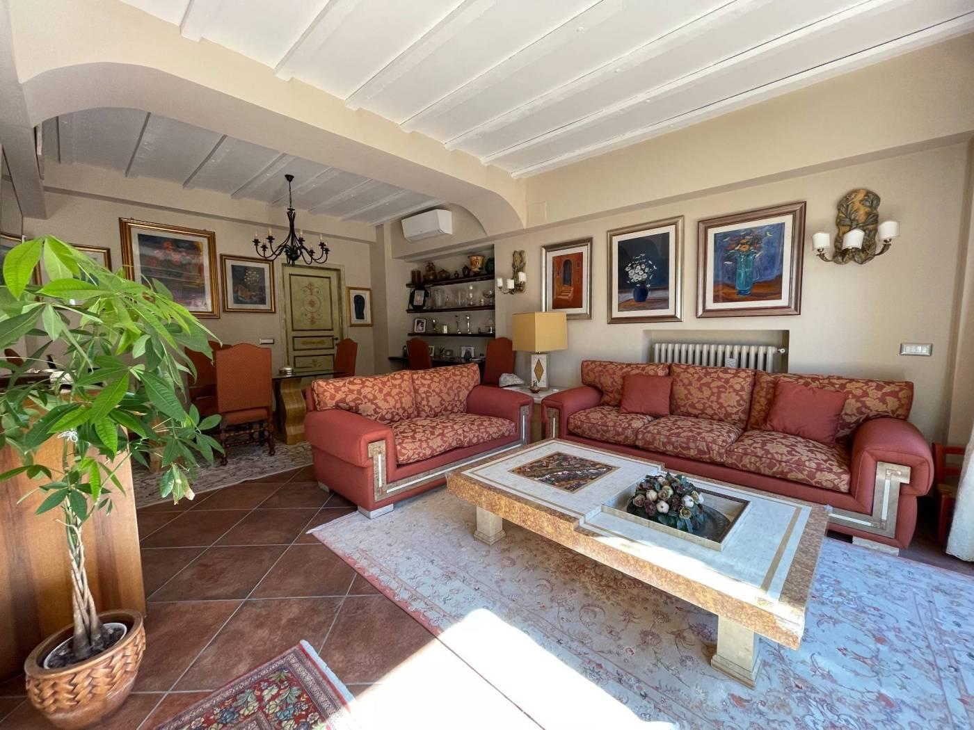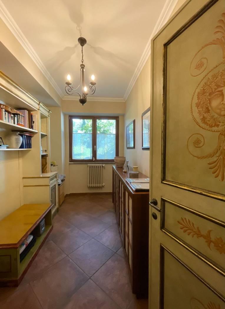 ingresso su salone doppio con sala pranzo, illuminato da un’ampia vetrata, cucina abitabile dotata di comoda dispensa, disimpegno, due camere, una cameretta/studio, doppi servizi con doccia idromassaggio, giardino, due cantine e posti auto scoperti.