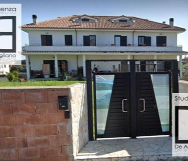 Accediamo alla proprietà mediante un doppio ingresso, uno carrabile l’altro pedonale, trovandoci all’interno del giardino; proseguendo arriviamo all’immobile al quale accediamo mediante una porta blindata trovando così: