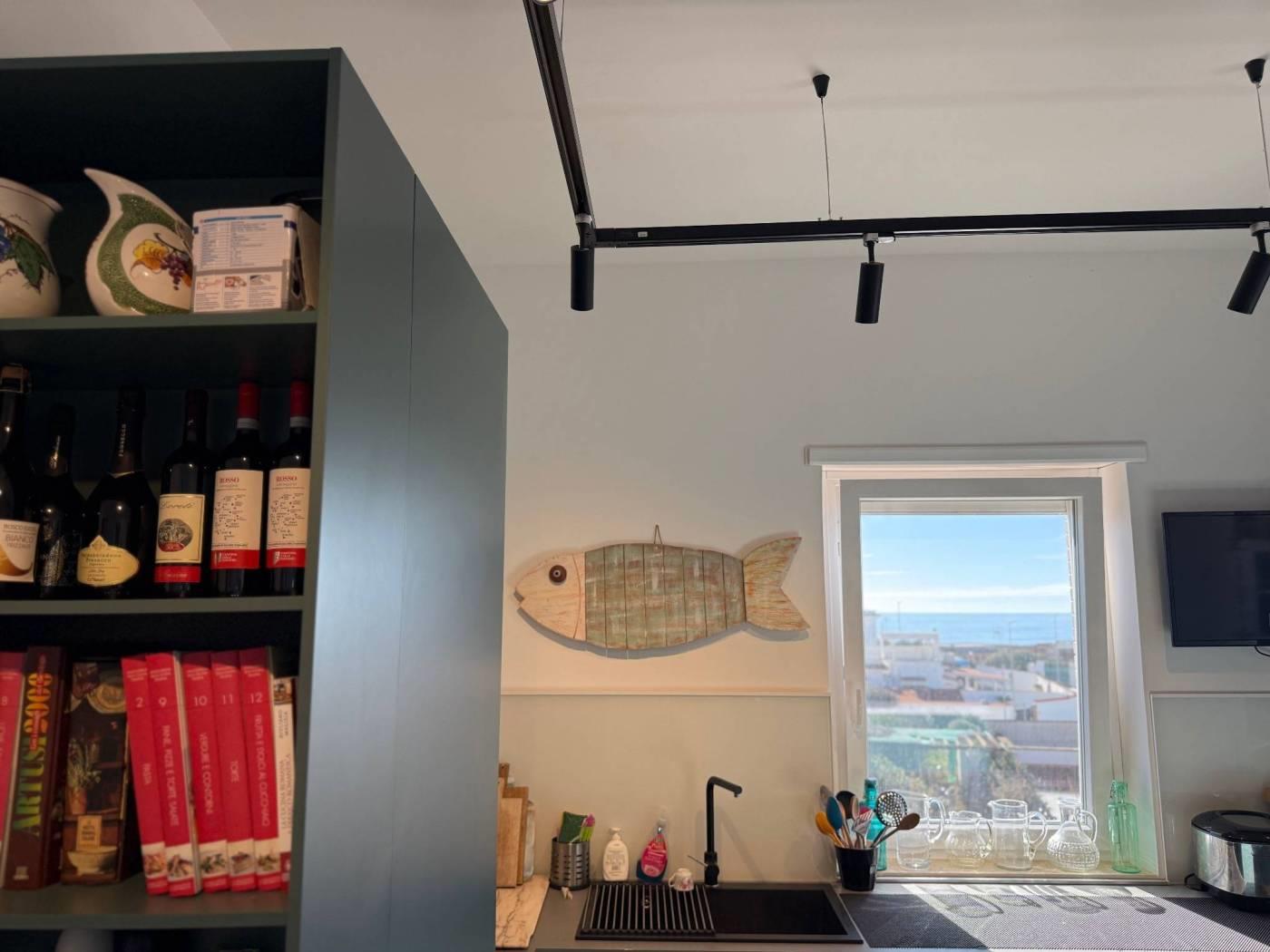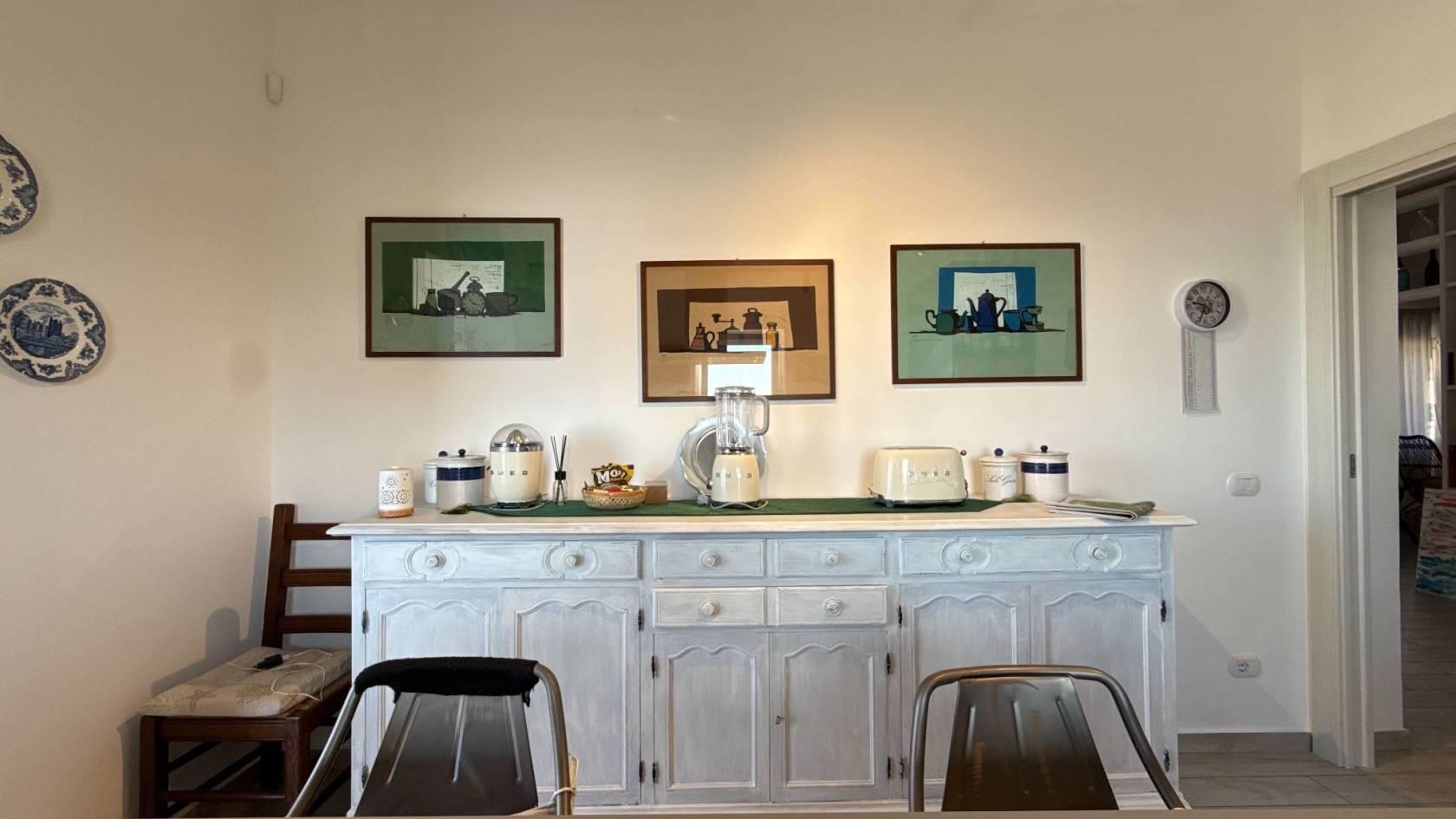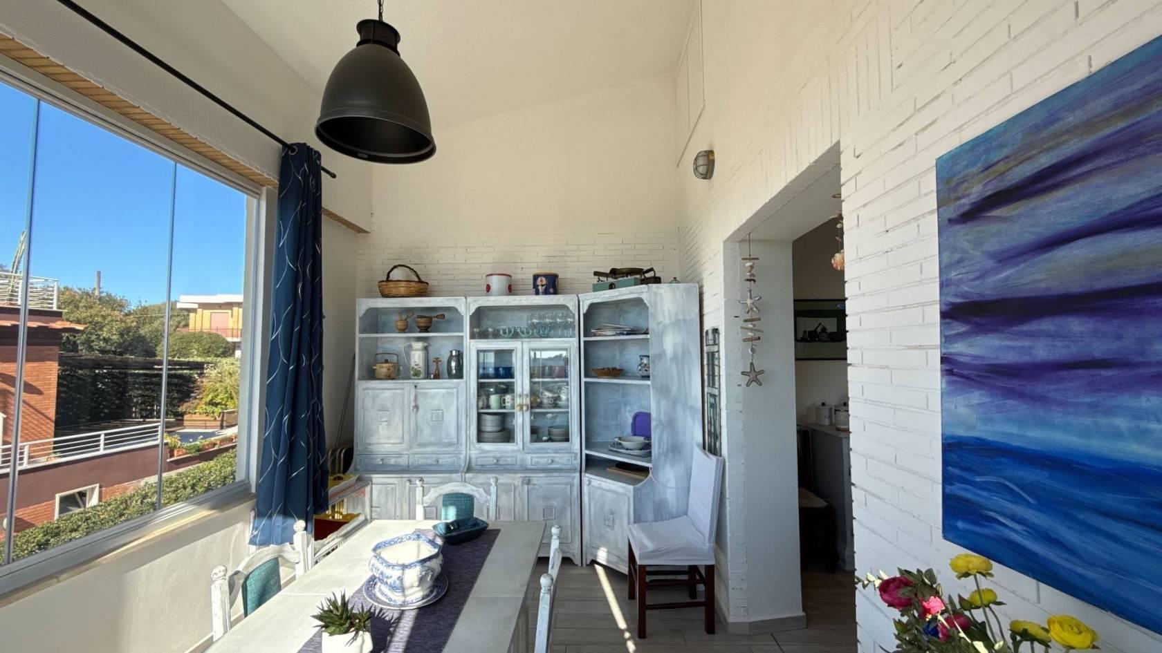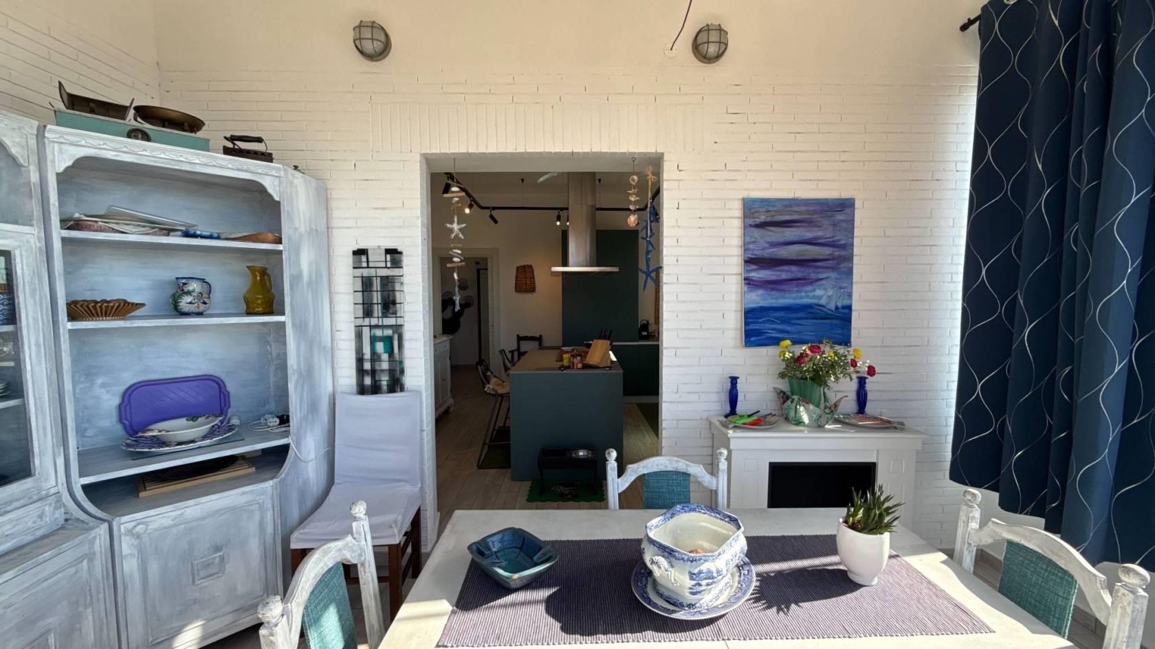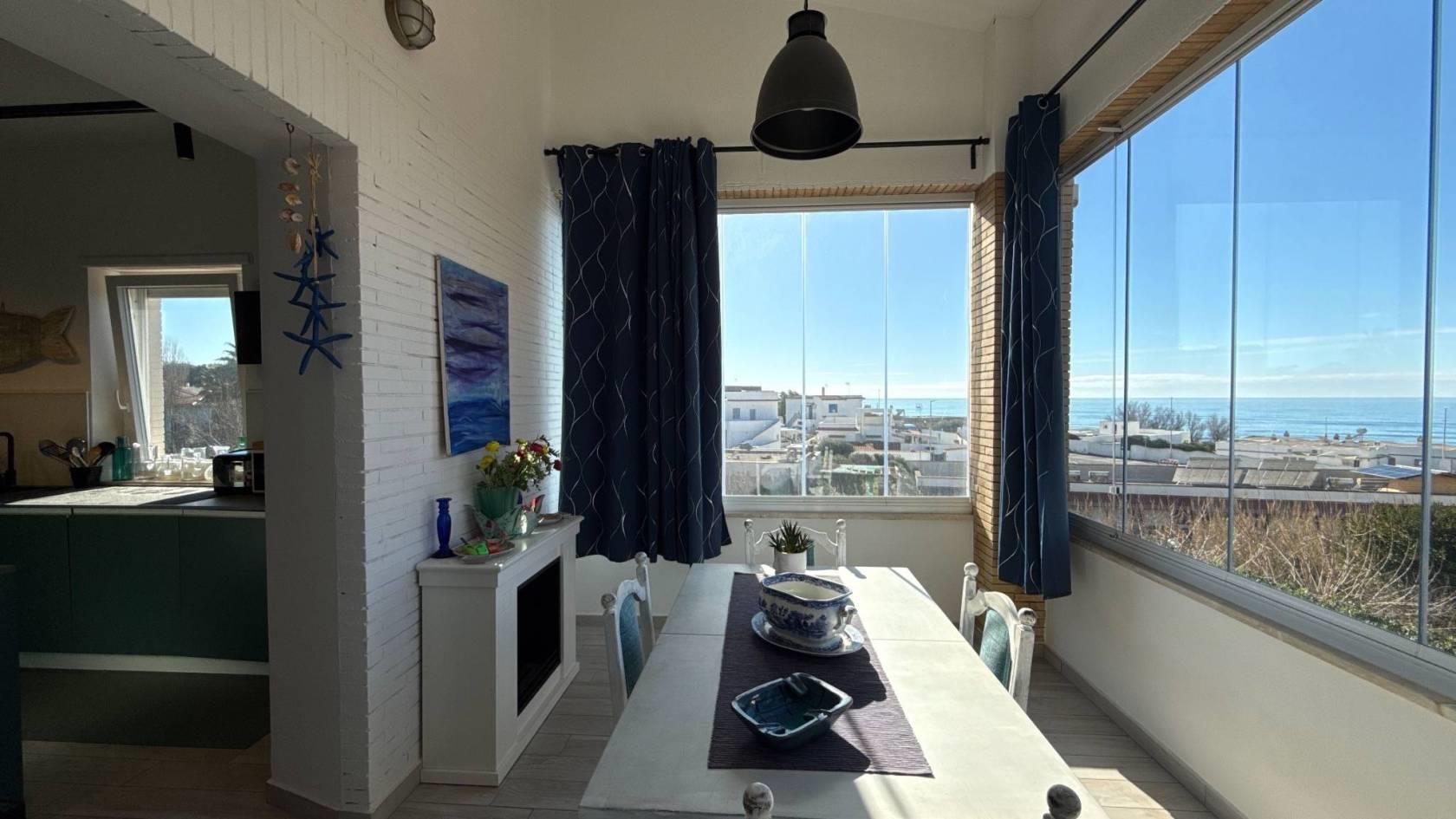 Da qui si aprono il salone luminoso con camino e tripla finestra, in continuità con la veranda esterna, e la grande cucina abitabile, seguita da un portico coperto adibito a tinello, dal quale si gode di una piacevole vista mare. Un bagno di servizio completa questi spazi.