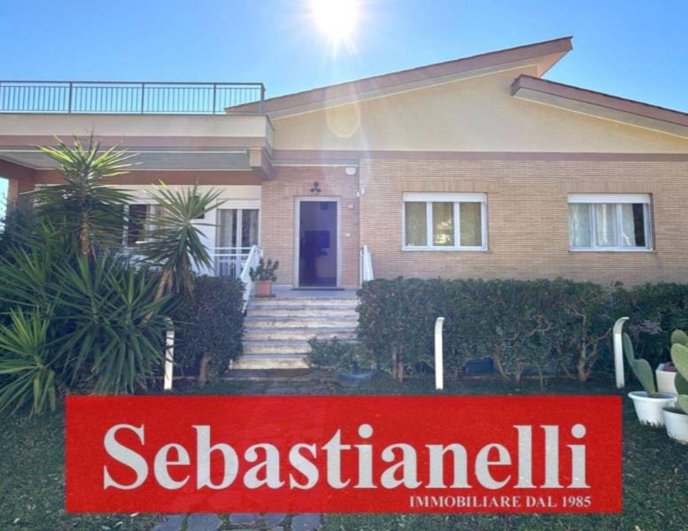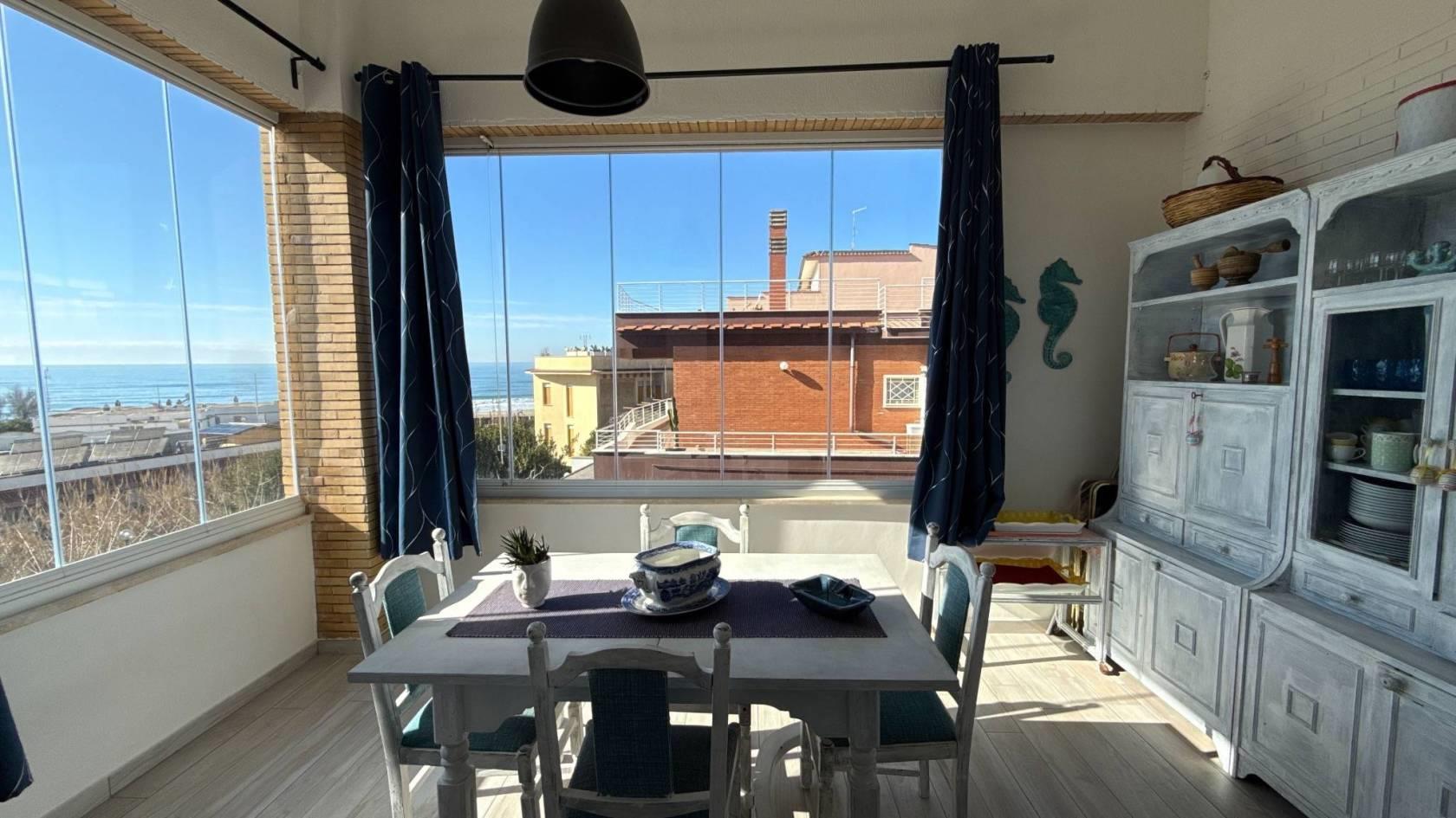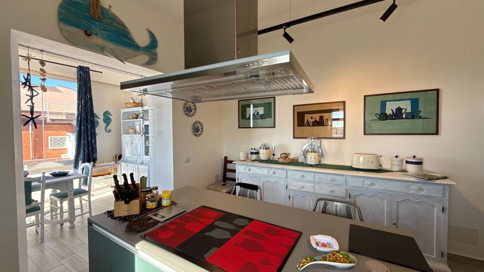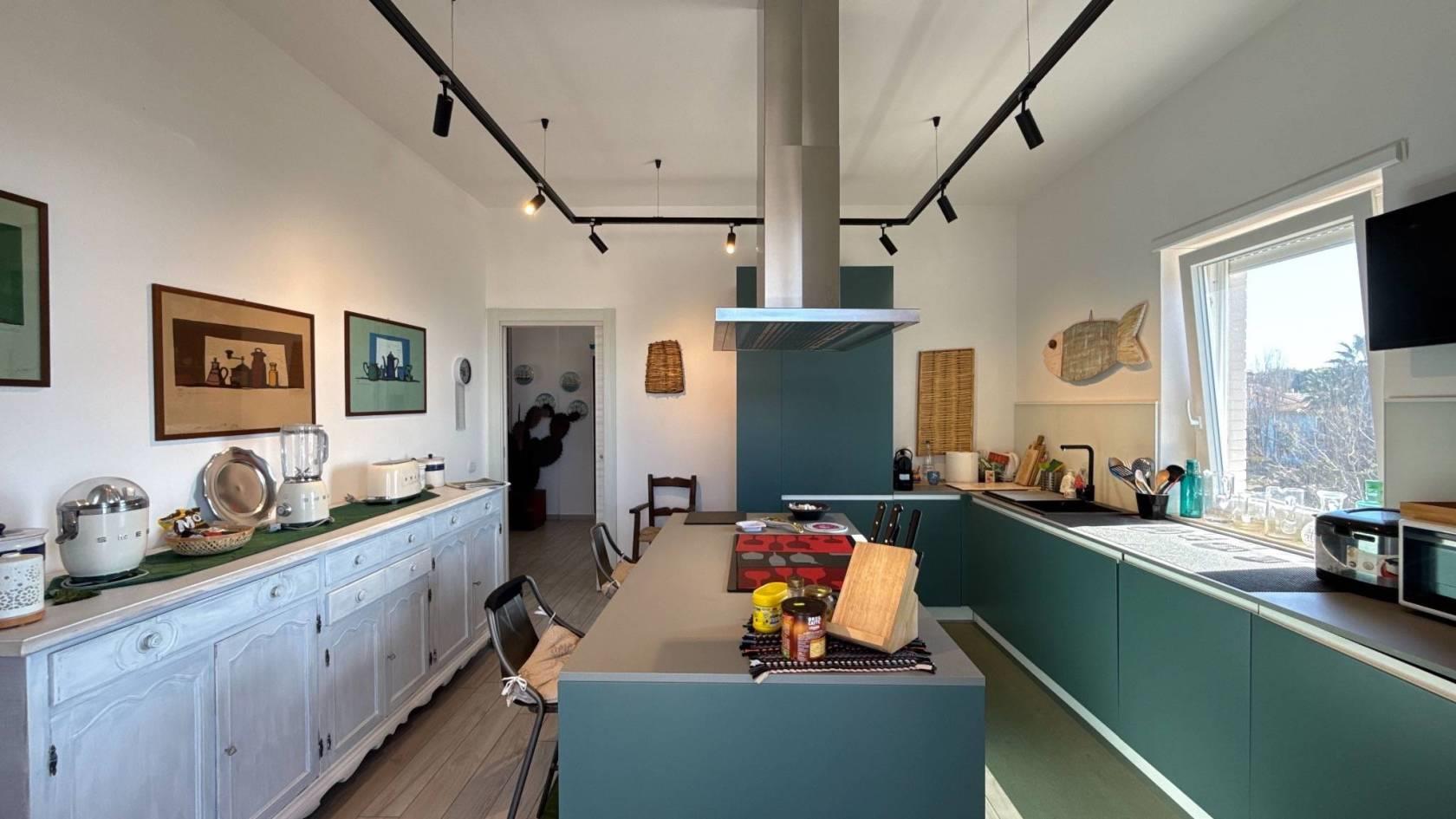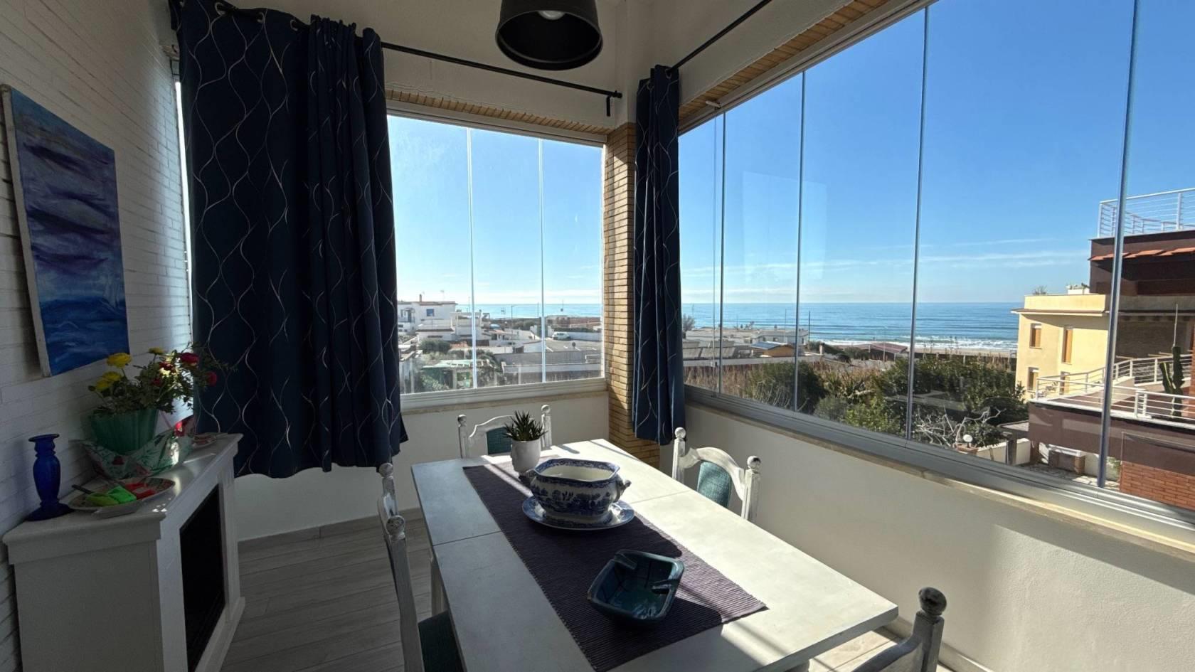 Da qui si aprono il salone luminoso con camino e tripla finestra, in continuità con la veranda esterna, e la grande cucina abitabile, seguita da un portico coperto adibito a tinello, dal quale si gode di una piacevole vista mare. Un bagno di servizio completa questi spazi.