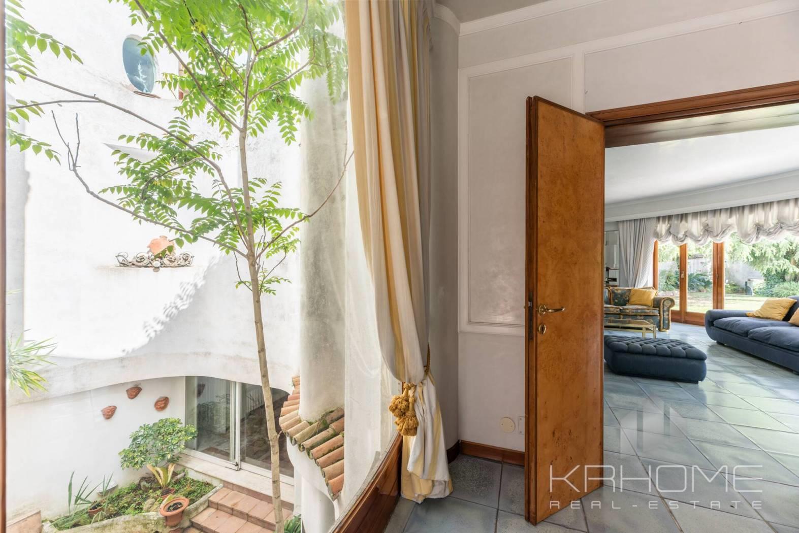 Il cuore pulsante della villa è rappresentato dal magnifico chiostro centrale, elemento distintivo che collega armoniosamente i tre livelli della residenza. Questo spazio diventa il fulcro attorno a cui si sviluppa l’intera abitazione, permettendo alla luce naturale di danzare attraverso le eleganti vetrate e illuminare ogni ambiente con un gioco di chiaroscuri tipico del linguaggio morettiano. Le volte sinuose e le logge raffinate testimoniano la maestria di un architetto che ha saputo fondere razionalismo e memoria plastica rinascimentale e barocca in una sintesi personale di straordinaria bellezza.
