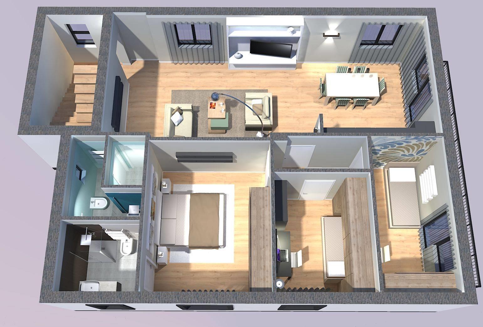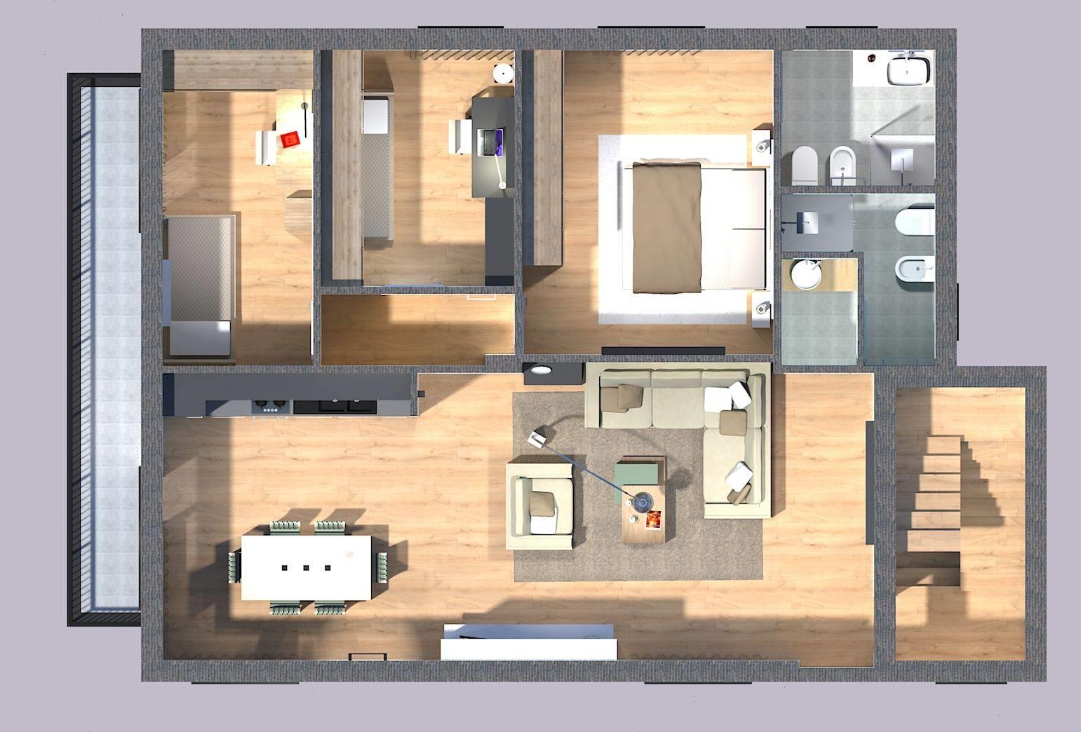 La configurazione attuale prevede un’ampia zona giorno open space di circa 40 mq con angolo cottura con uscita su un balcone, estremamente luminosa, che conduce al disimpegno verso la zona notte, dove troviamo una camera matrimoniale con bagno privato, due camerette e un secondo bagno finestrato. Tuttavia, ogni ambiente può essere riprogettato per adattarsi perfettamente al proprio stile di vita.