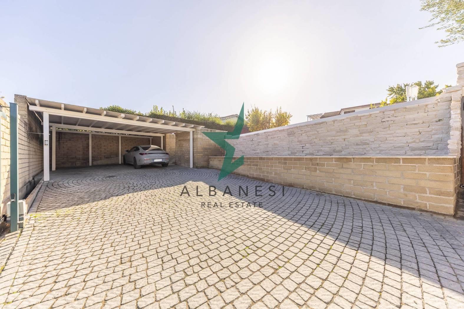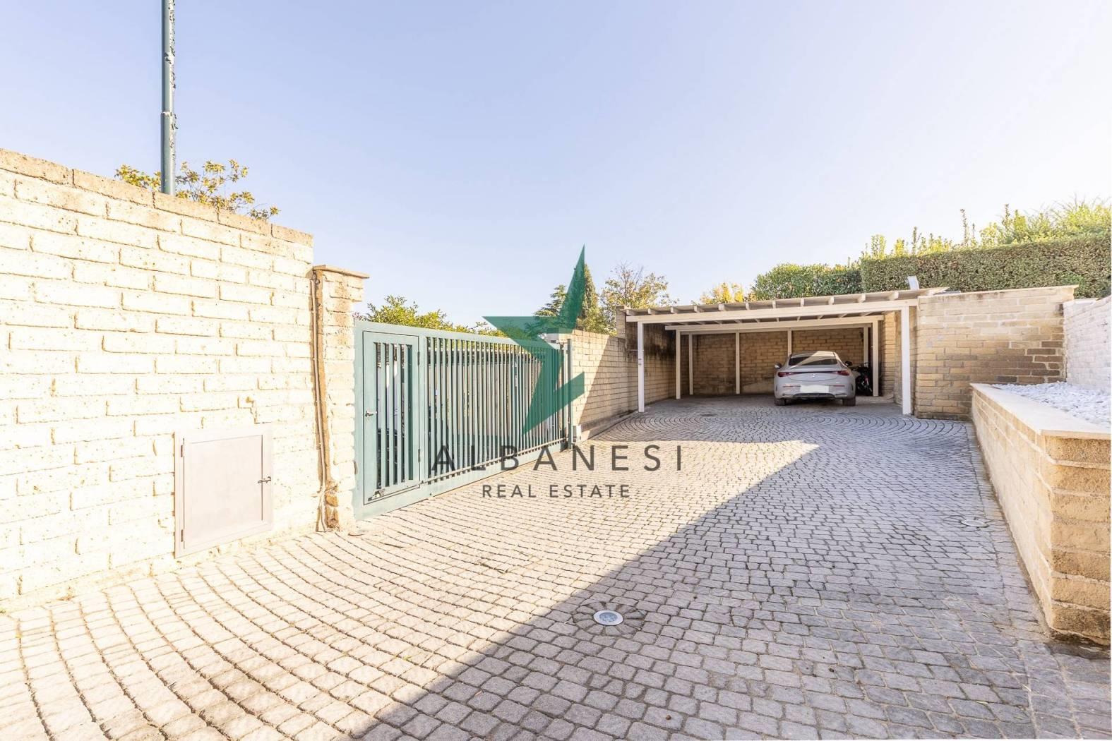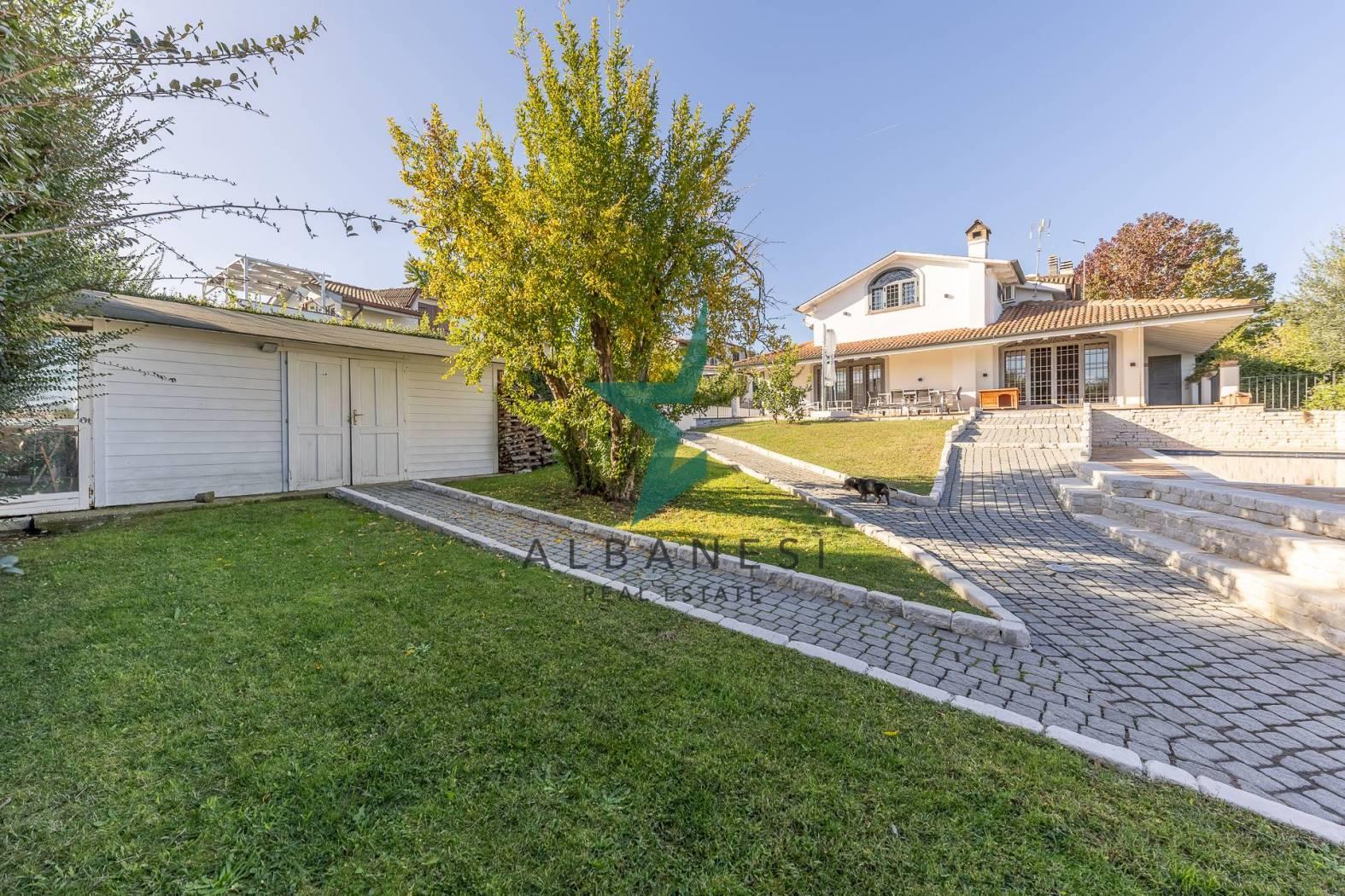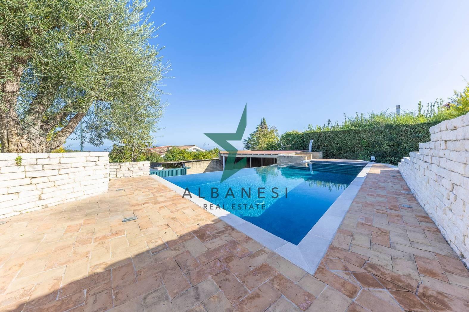 Gli spazi esterni ampliano la vivibilità quotidiana con una piscina a sfioro, una cucina in muratura con barbecue, una casetta in giardino, carport e un ampio piazzale per ulteriori posti auto.