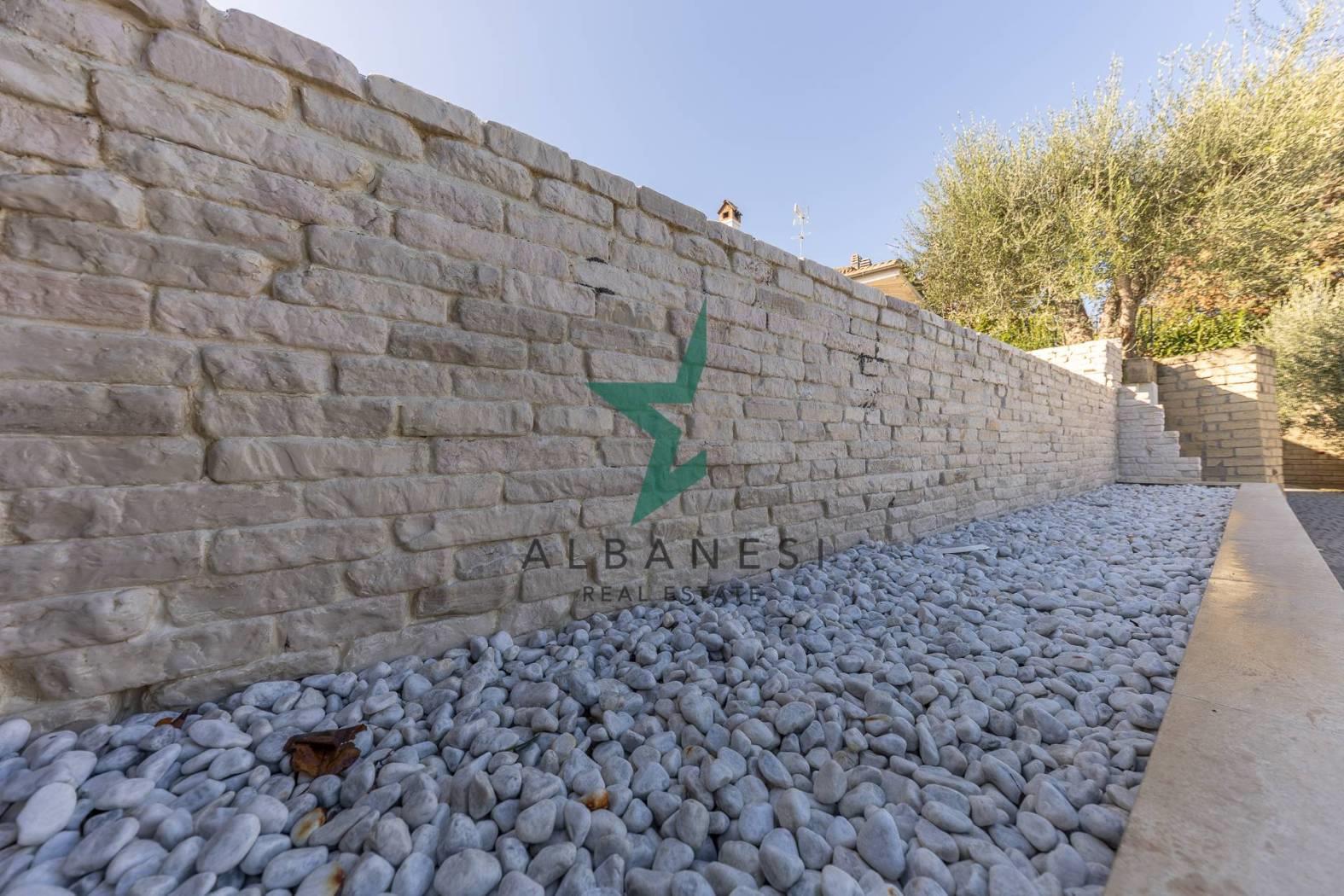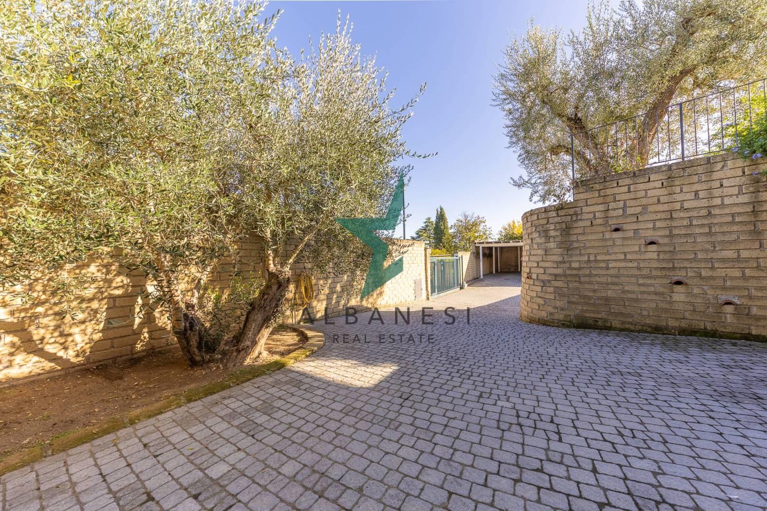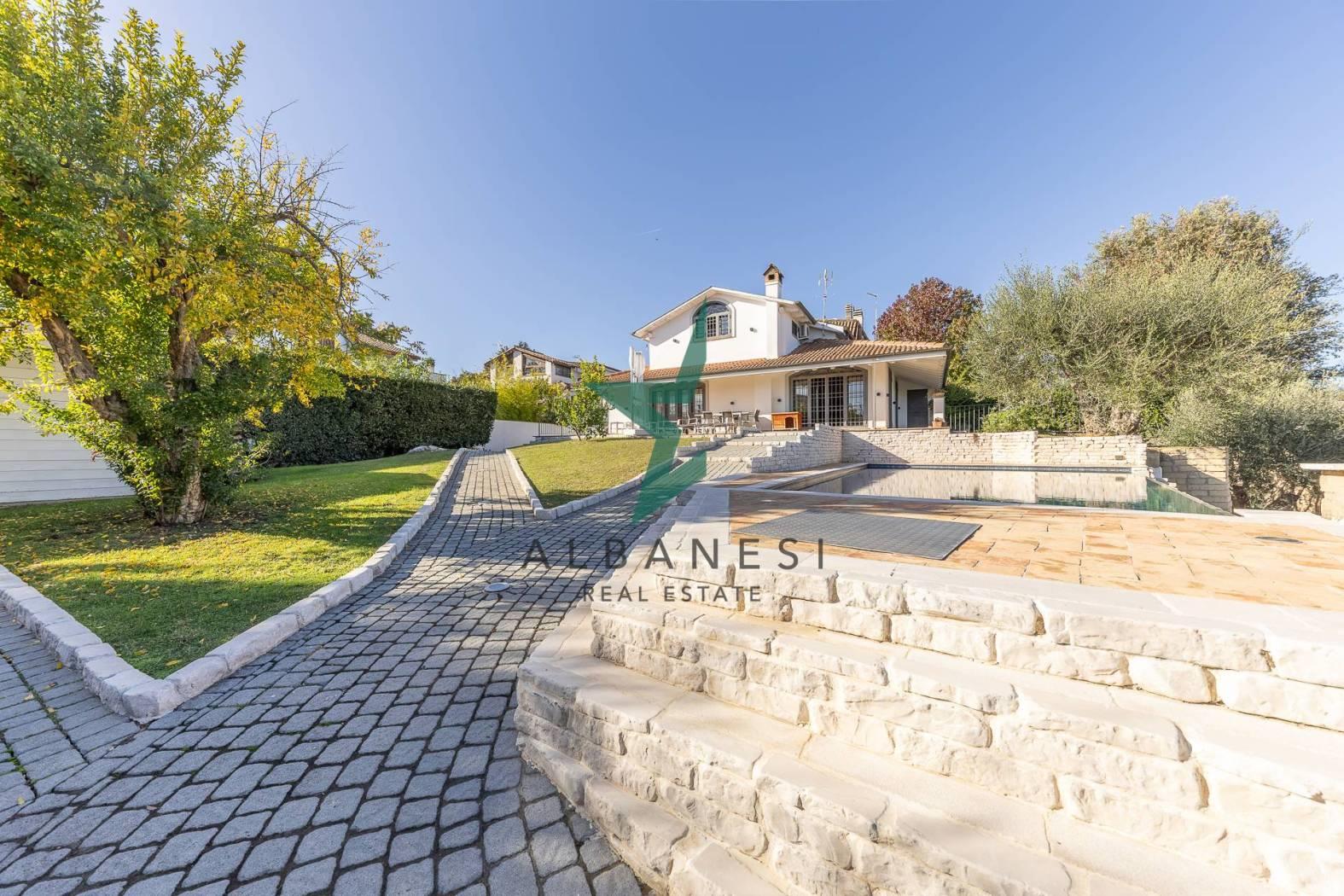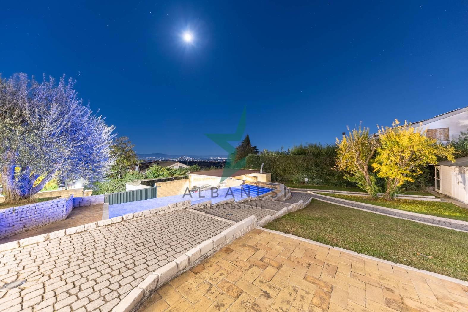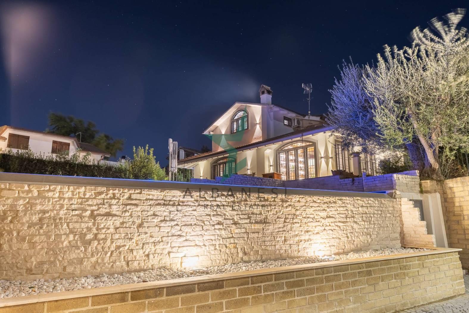 Gli spazi esterni ampliano la vivibilità quotidiana con una piscina a sfioro, una cucina in muratura con barbecue, una casetta in giardino, carport e un ampio piazzale per ulteriori posti auto.