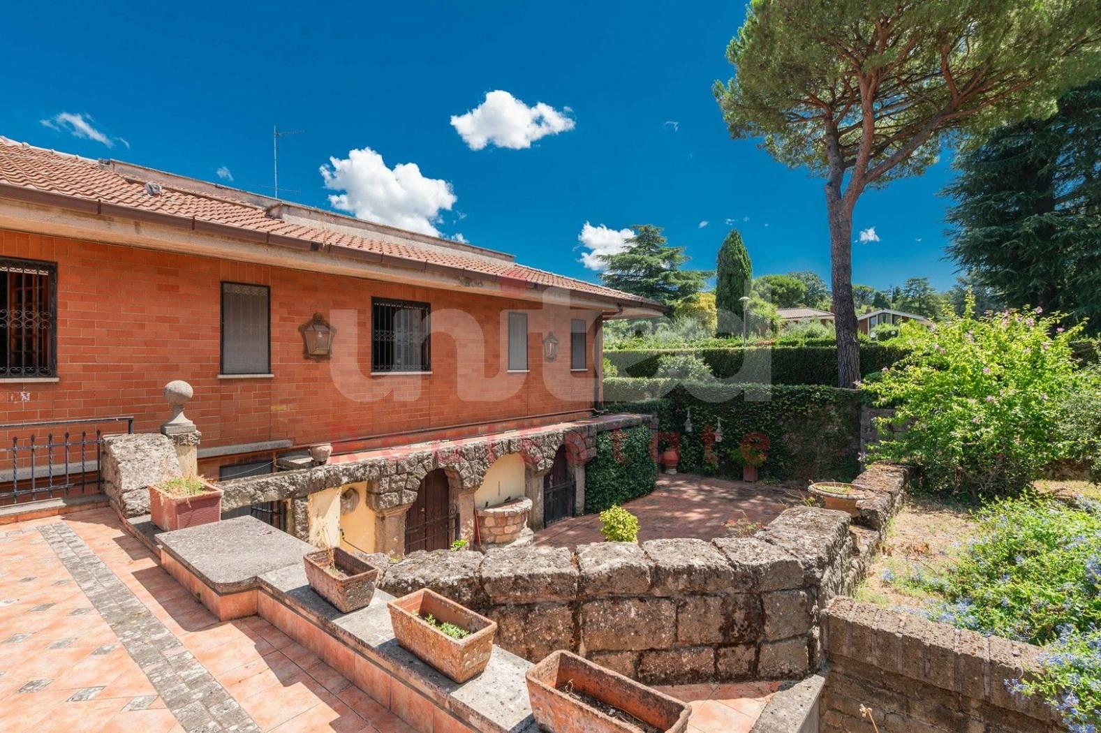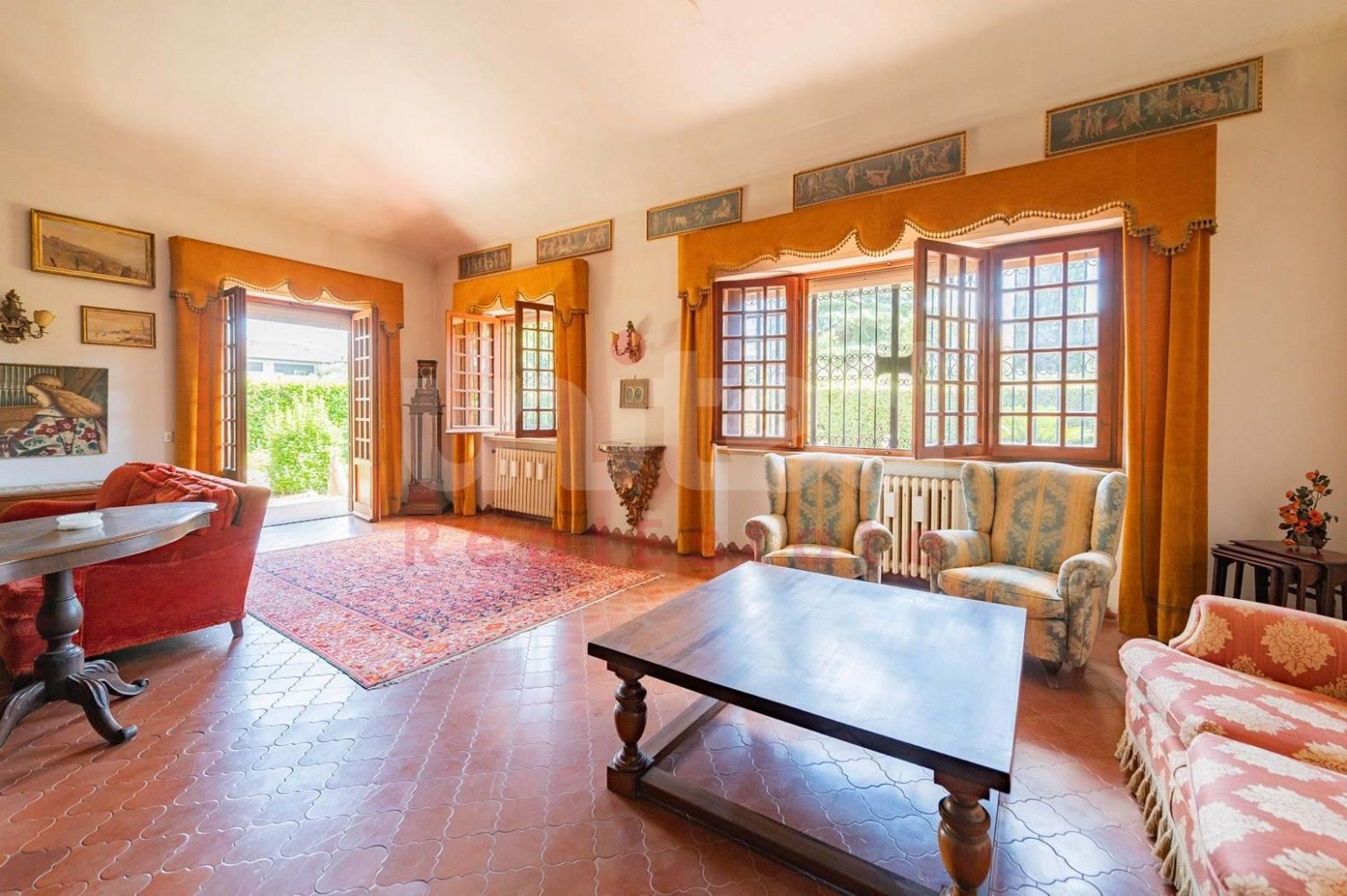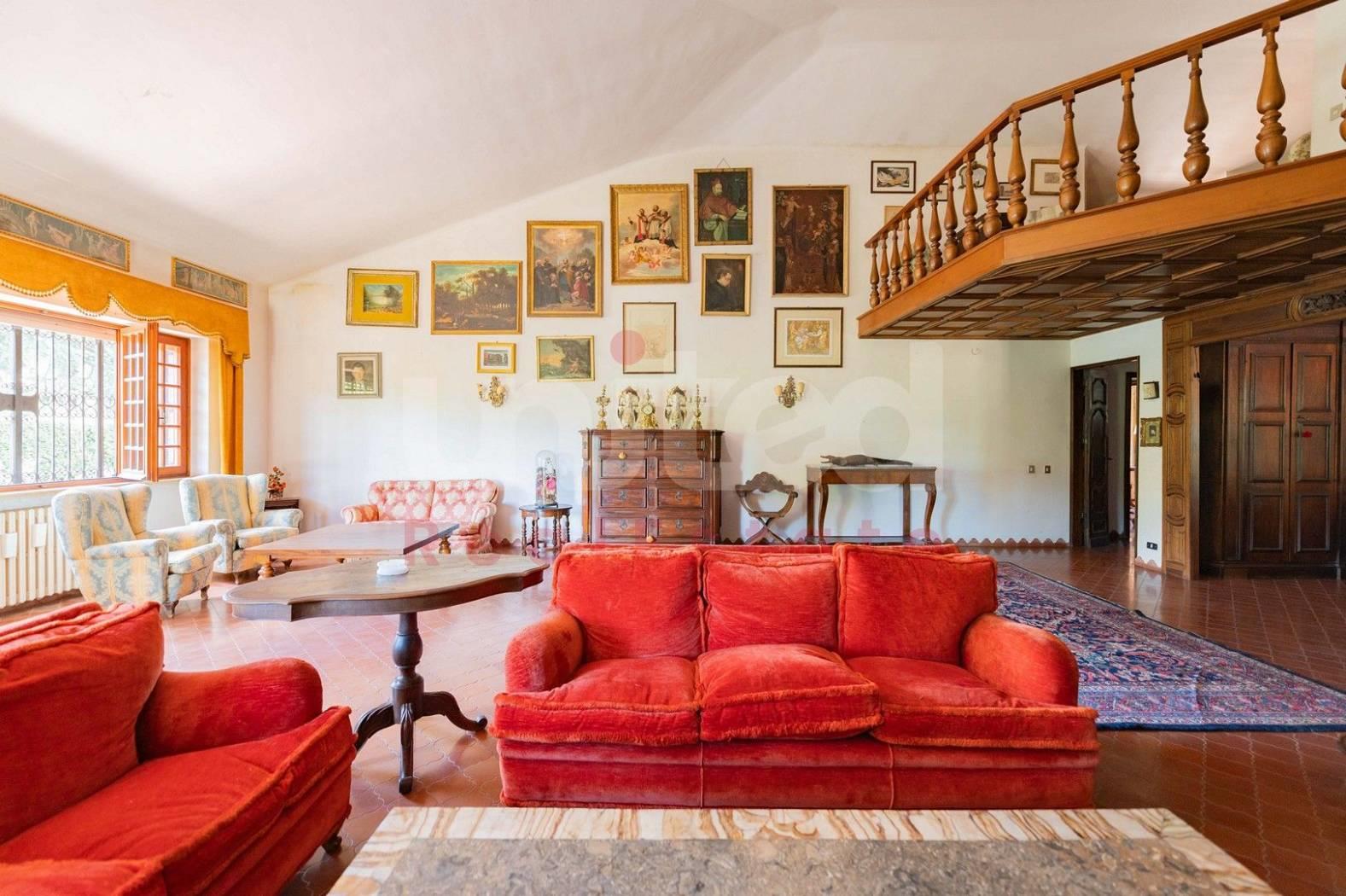 In una delle zone più esclusive di Frascati, Via di Salè, 7, la United Real Estate propone in vendita una splendida villa unifamiliare degli anni 70 su due livelli di 356 mq insistente su un lotto di circa 2500 mq. Entrando nella proprietà ci accoglie un magnifico e luminoso salone di rappresentanza con camino in pietra ed una scala di legno che conduce ad un'area rialzata con vista sul salone ed accesso a due terrazzi sul tetto con vista sul giardino; accanto al salone, un'elegante sala da pranzo con porta finestra sul giardino completa la zona giorno; sempre sullo stesso piano, lungo un corridoio troviamo 3 camere da letto, 3 bagni, la cucina ed un'altra sala da pranzo più piccola con affaccio su un ampio patio con vista sul giardino. La camera padronale è caratterizzata dalla presenza di due cabine armadio ognuna con il proprio bagno...un vero tocco di eleganza! Sia dall'esterno che dall'interno si accede al piano inferiore dove troviamo un'altra ampia zona giorno con grande camino in pietra, sala biliardo, una cucina abitabile con una grande dispensa e vista su un altro patio molto accogliente e confortevole, altre due camere da letto, un bagno completo, una zona relax con sauna, locale tecnico e cantina. Gli accessi alla villa sono due: uno pedonale ed un altro carrabile che permette l'ingresso ed il parcheggio a 3/4 macchine. Nel piano sottostante sono presenti anche due dependances, una con accesso dall'interno ed un'altra con accesso indipendente.