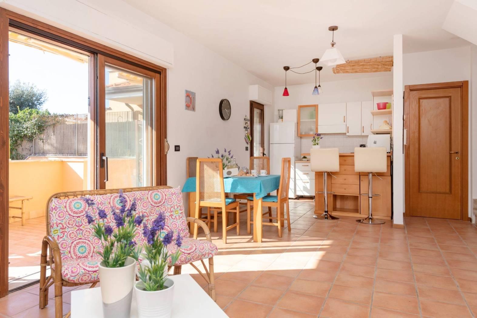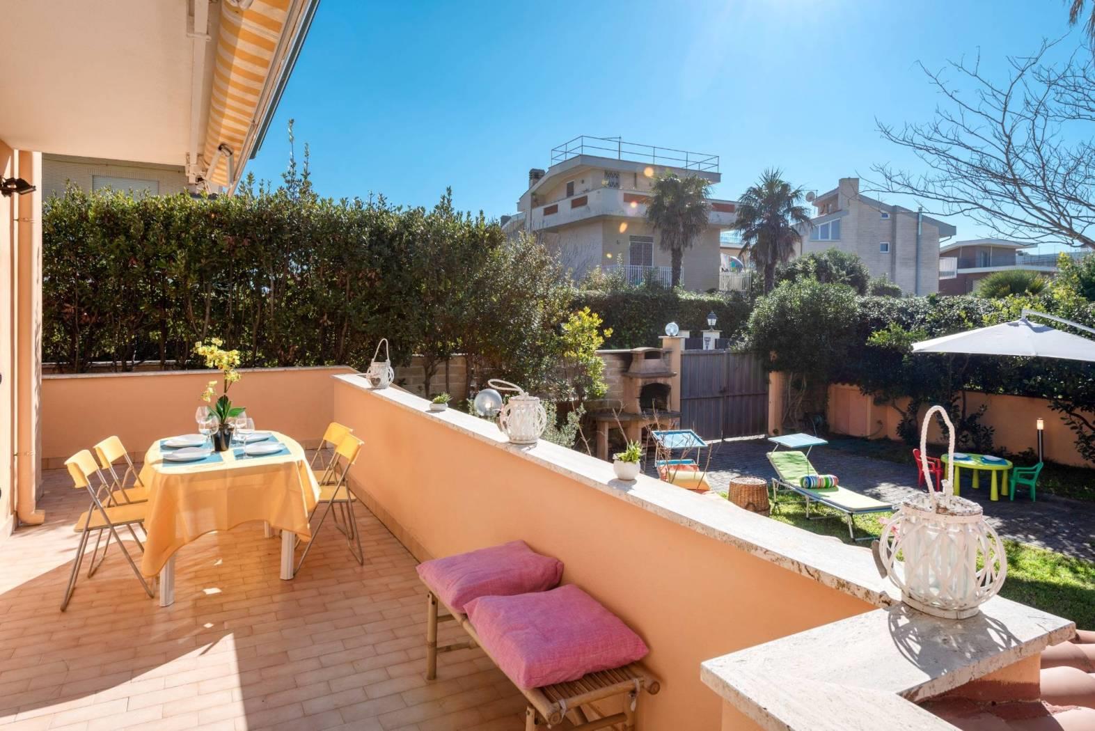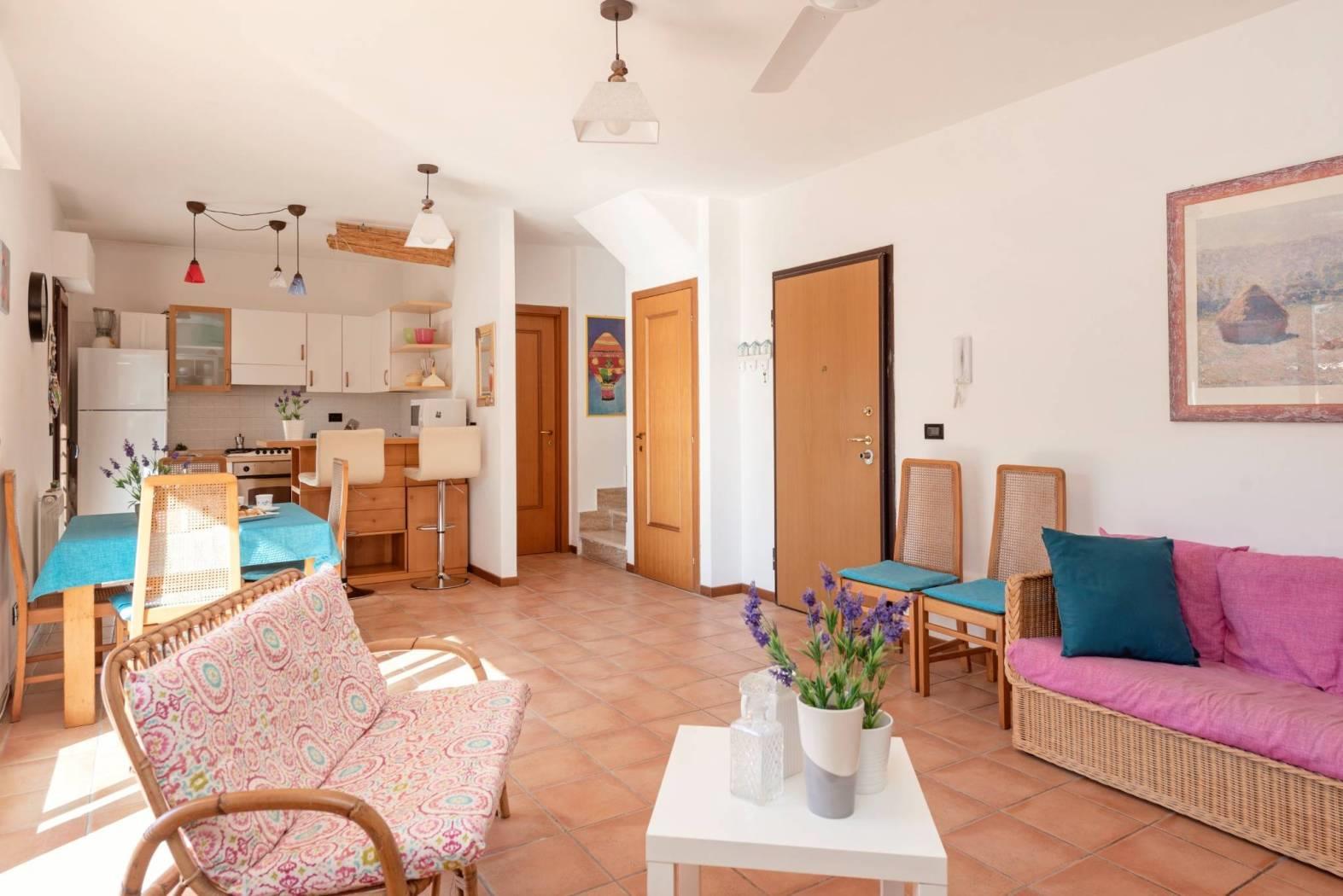 Accogliente salone con affaccio sul verde, cucina separata, servizio e portico di 150 mq con collegamento diretto al giardino privato di circa 150 mq, organizzato con area barbecue e accesso carrabile.