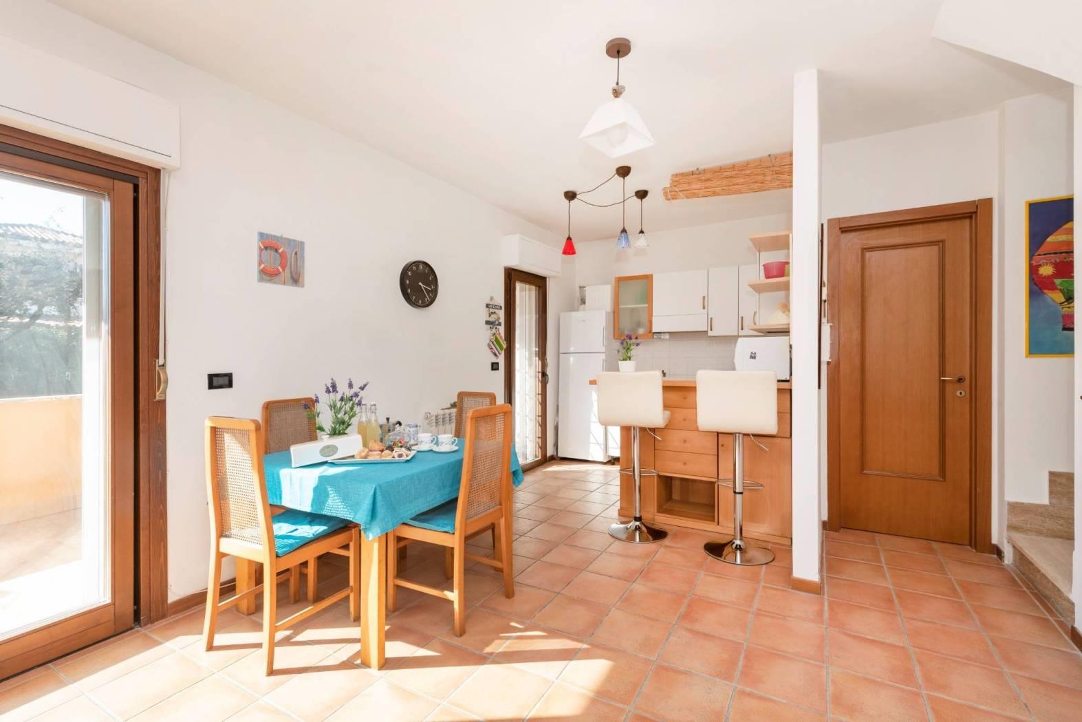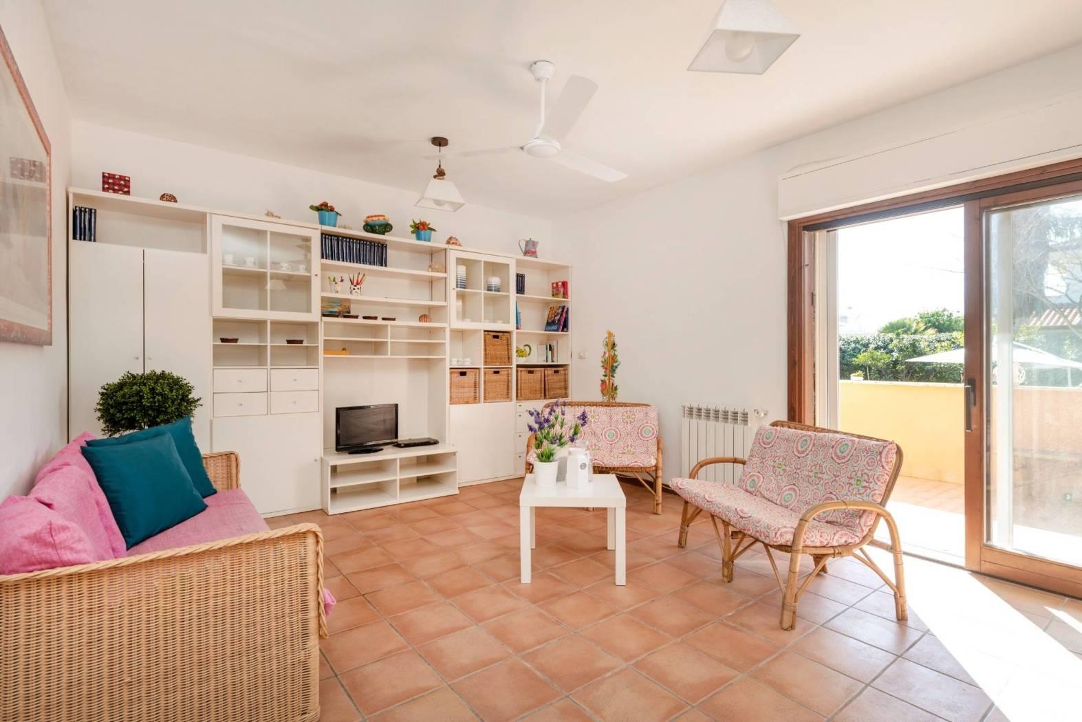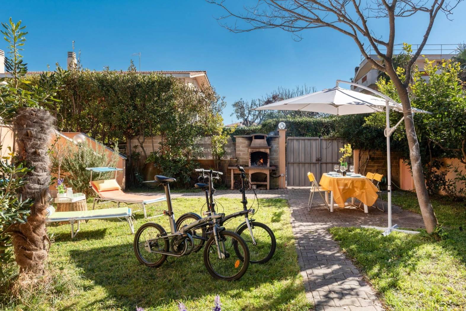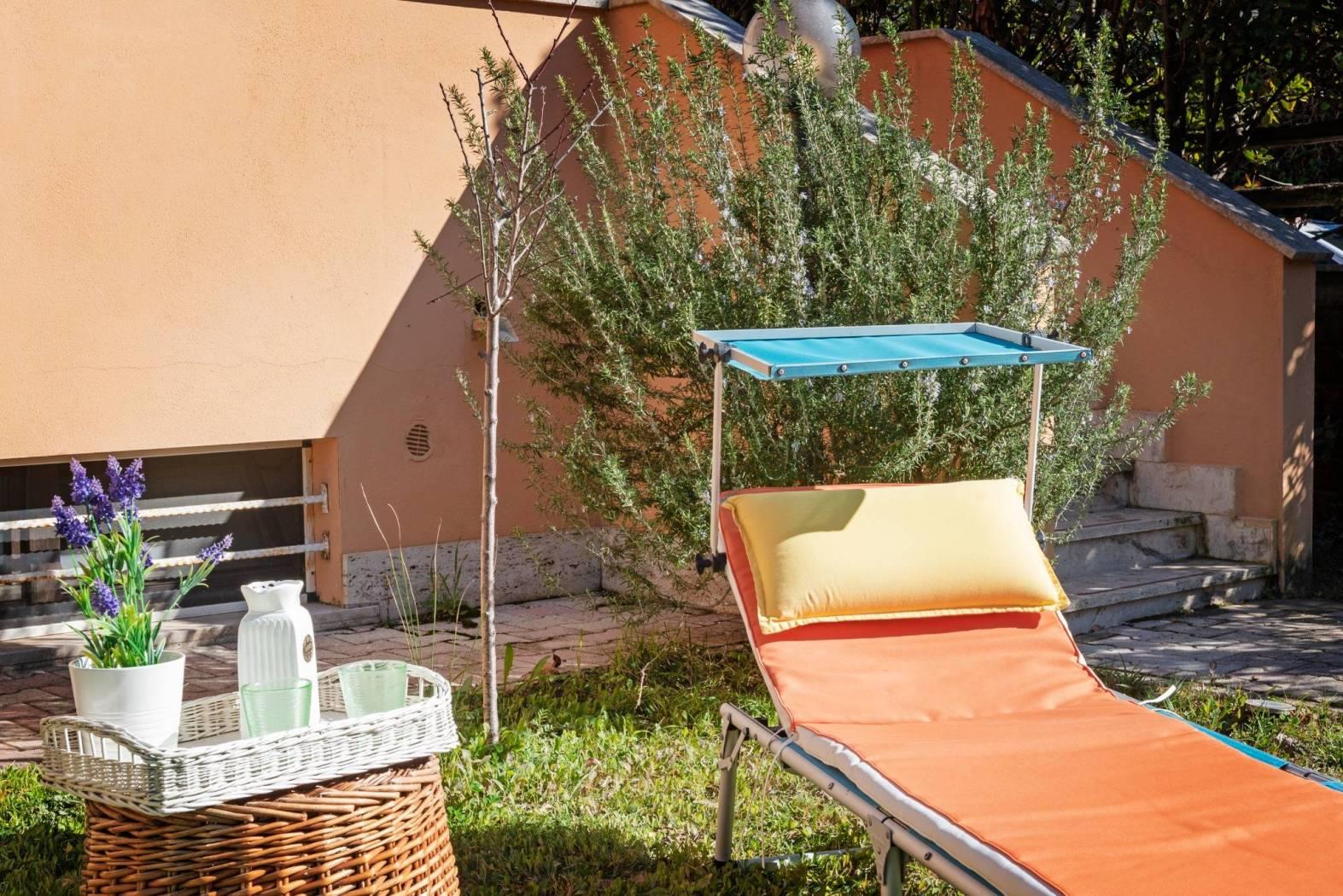 Accogliente salone con affaccio sul verde, cucina separata, servizio e portico di 150 mq con collegamento diretto al giardino privato di circa 150 mq, organizzato con area barbecue e accesso carrabile.