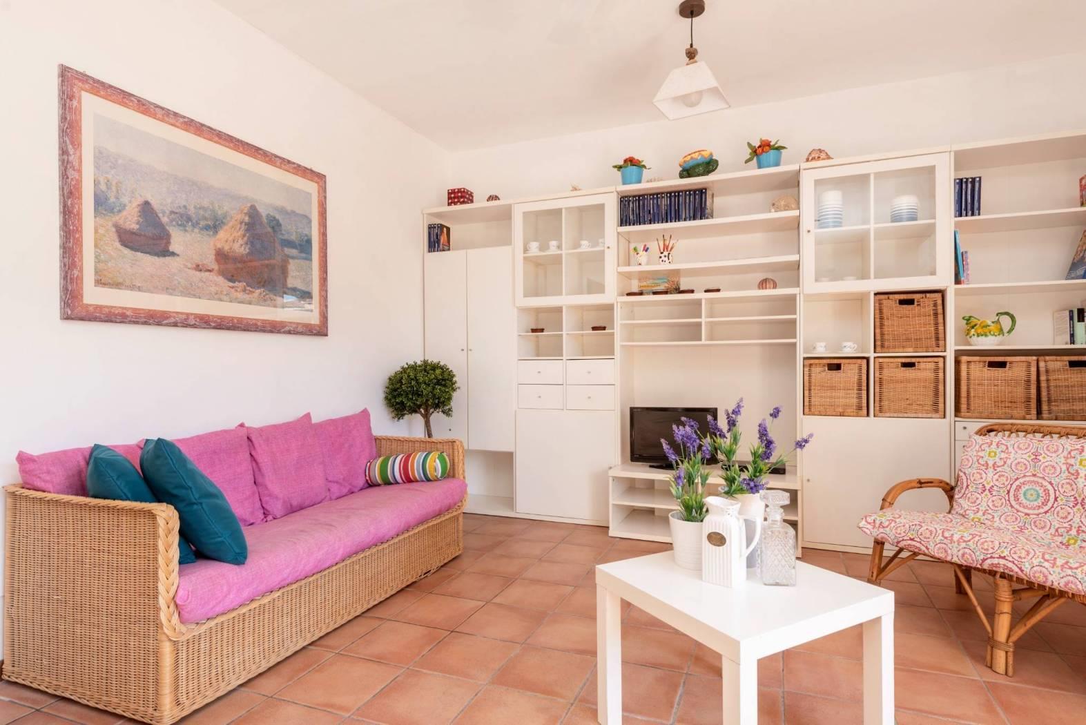 Spaziosa sala hobby con angolo cottura, camera matrimoniale, bagno, due locali ripostiglio e doccia esterna.