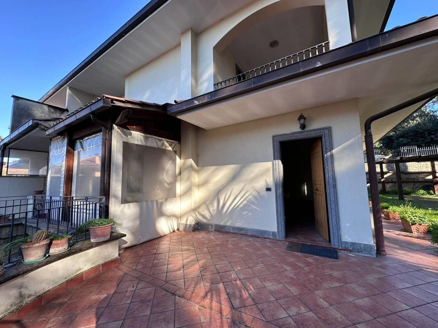 GROTTAFERRATA CENTRO - VIA DEL FICO - In via Del fico, zona altamente signorile, esclusiva e residenziale ma allo stesso tempo ben collegata e vicina al centro di Grottaferrata, proponiamo la vendita di una villa di oltre 300 mq più ampio giardino privato disposta su due livelli oltre sala hobby. Al piano terra troviamo un accogliente patio coperto, ingresso, salone doppio, cucina, un servizio, ripostiglio e portico coperto con cucina esterna . Al primo piano troviamo tre ampie camere da letto, due servizi, ampio balcone ed un ampio terrazzo di oltre 30 mq. con ottima esposizione. Al piano seminterrato c’è un’ampia sala hobby con camino, una camera, un servizio ed un ripostiglio. Completa la proprietà un ampio garage privato di oltre 20 mq ed una soffitta a copertura accessibile tramite scala estendibile. Buone condizioni interne, completamente ristrutturata nei servizi ed impianti, sia elettrico che idraulico circa 10 anni fa, le rifiniture e i materiali utilizzati sono di gran pregio, i pavimenti sono in parquet, gli infissi con doppio vetro ed inferriate di sicurezza. L’esposizione tripla ed il contesto esclusivo garantiscono sole, tanta luminosità e tranquillità, pur essendo posizionata a ridosso del centro di Grottaferrata e di Via Anagnina, arteria che consente veloci collegamenti in auto e con i mezzi pubblici sia verso Roma che verso la zona dei castelli romani.
